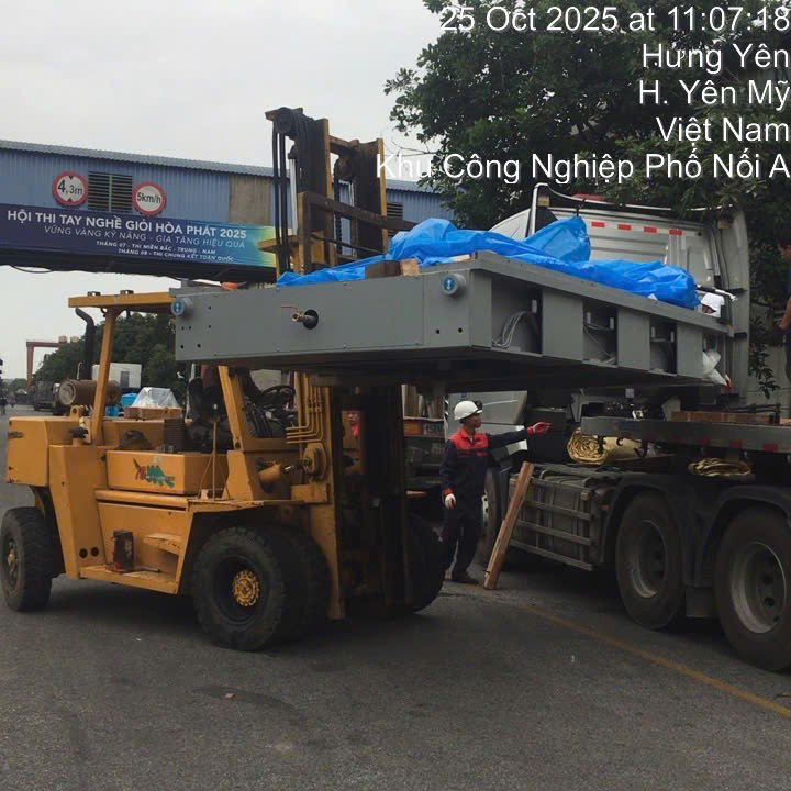 - Vai trò: Xe nâng là “cánh tay” đa năng, hỗ trợ xúc hàng, ôm hàng, di chuyển máy trong phạm vi nhà xưởng và đặc biệt là đưa máy lên các vị trí cao (ví dụ: lắp máy lên bệ, gá đỡ có độ cao 3m, 5m, thậm chí 6m).