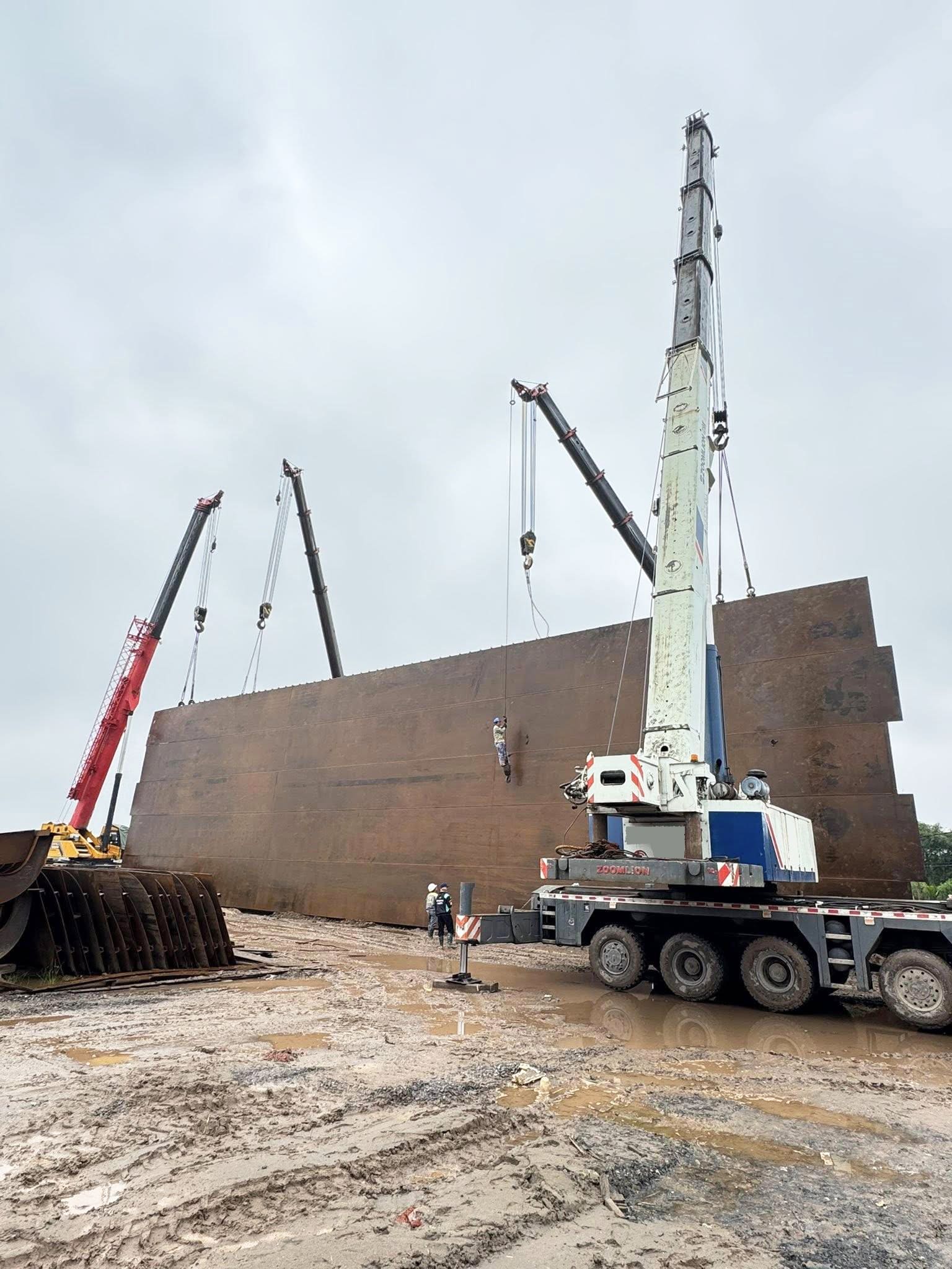 + Chuyên dùng cho các hạng mục có tải trọng lớn như thân tàu, block thép nặng; hoạt động ổn định trên nền đất yếu ven sông.