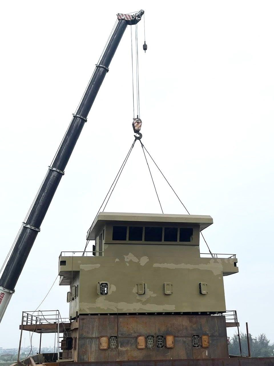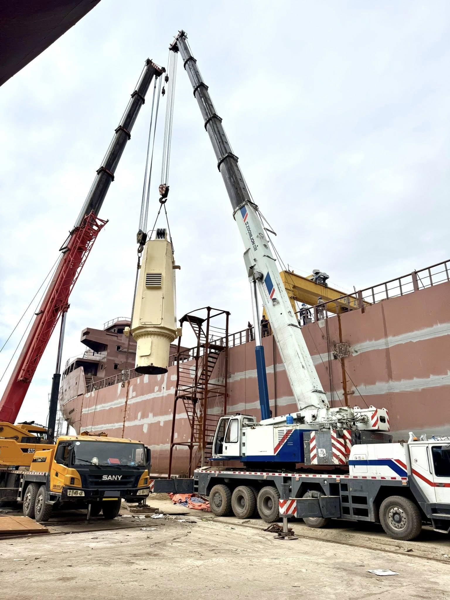 Ở giai đoạn lắp đặt thiết bị: Xe cẩu hỗ trợ đưa động cơ, máy phát, trục chân vịt, bánh lái và các thiết bị cơ khí có tải trọng lớn vào trong khoang tàu. Công đoạn này đòi hỏi xe cẩu có khả năng nâng hạ ổn định, thao tác linh hoạt trong không gian hẹp của xưởng đóng tàu tại Ninh Bình.