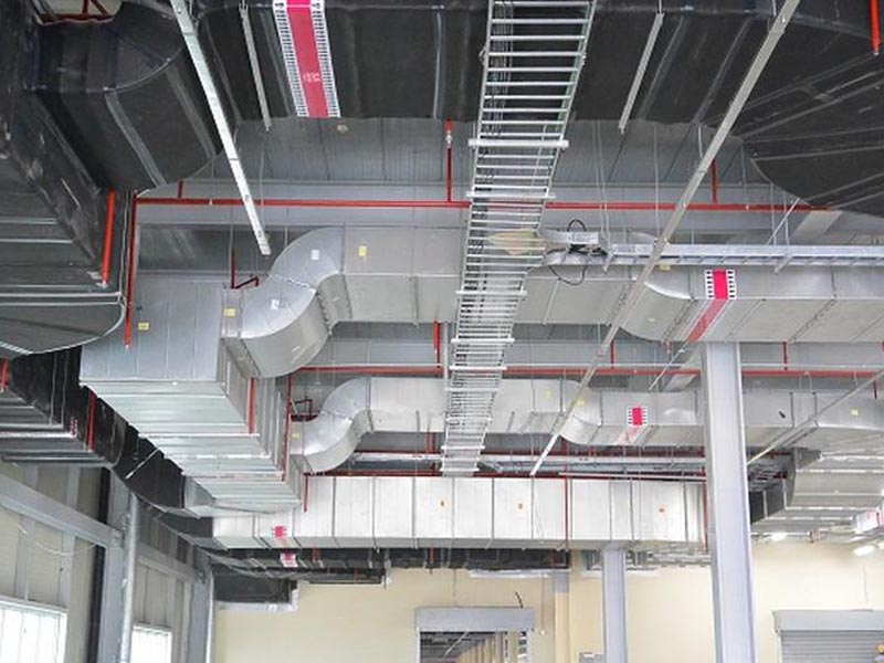 - Hệ thống thông gió và điều hòa không khí (HVAC): “Lá phổi” của nhà máy. Nó không chỉ làm mát, mà còn kiểm soát độ ẩm, lọc bụi, tạo áp suất không khí cho các phòng sạch, hút khí thải… cực kỳ quan trọng trong các ngành như điện tử, dược phẩm, thực phẩm.