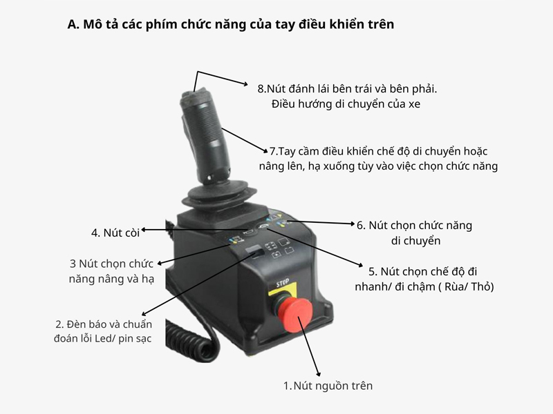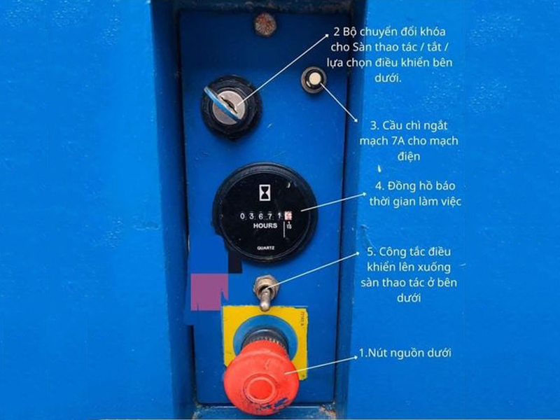 Lưu ý: Để điều khiển được xe, cả công tắc nguồn ở trên giỏ và ở dưới đều phải được bật. Từ bảng điều khiển bên dưới, bạn chỉ có thể thực hiện thao tác nâng hạ, không thể di chuyển xe.