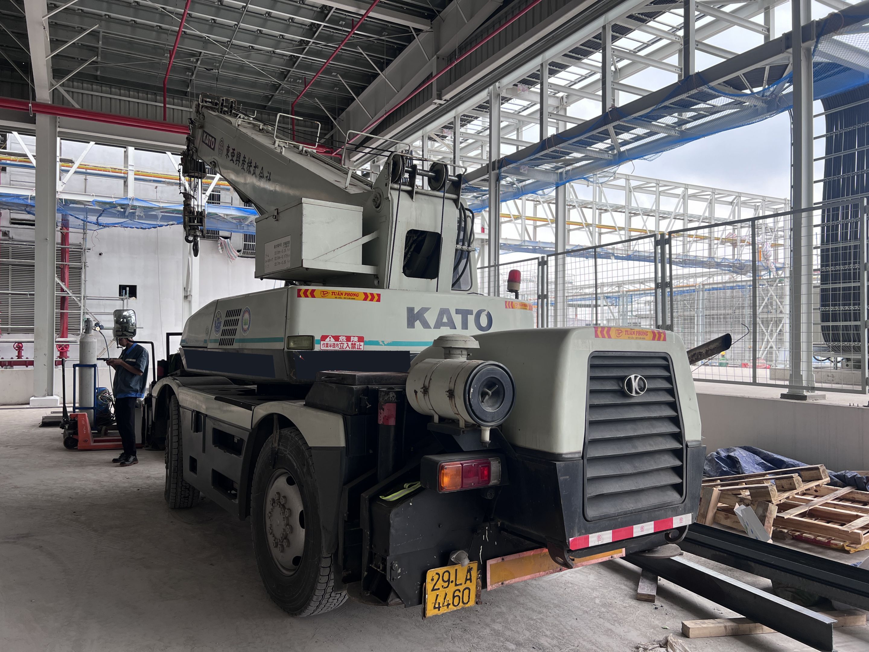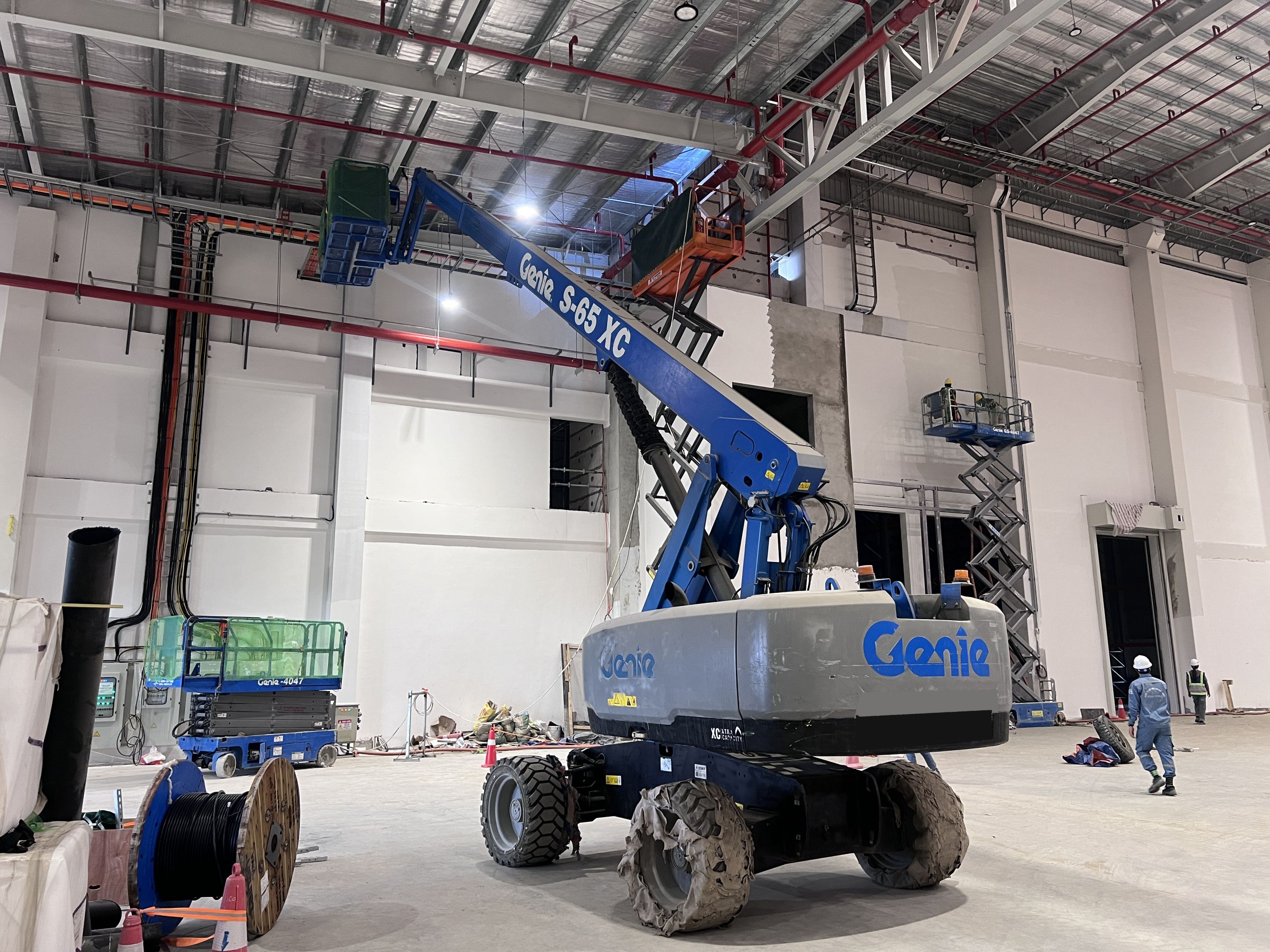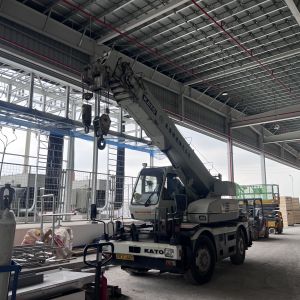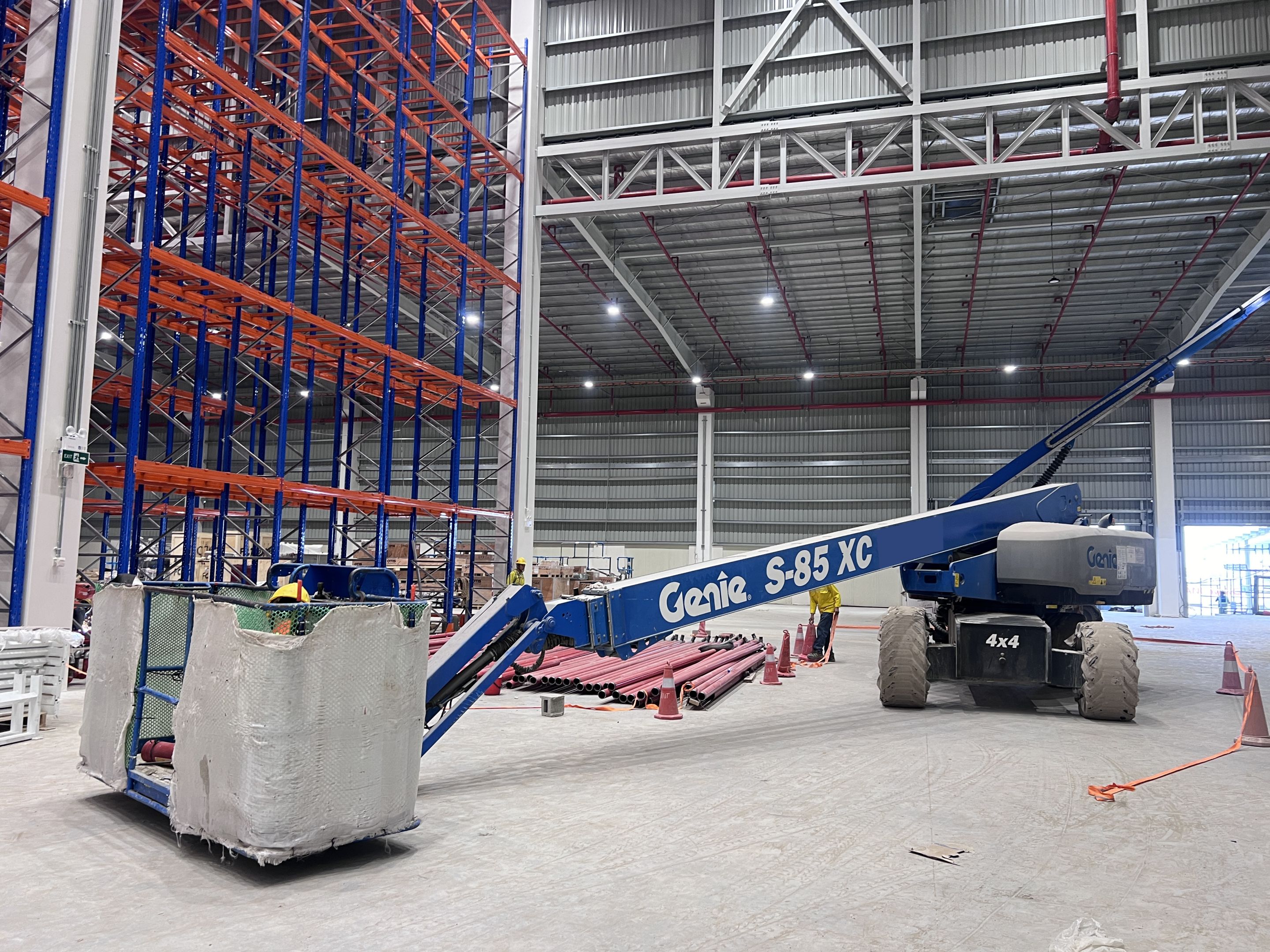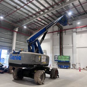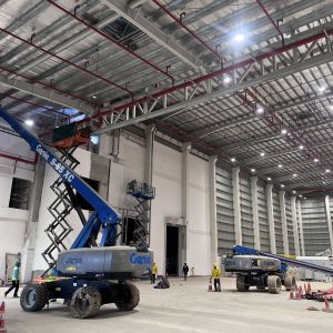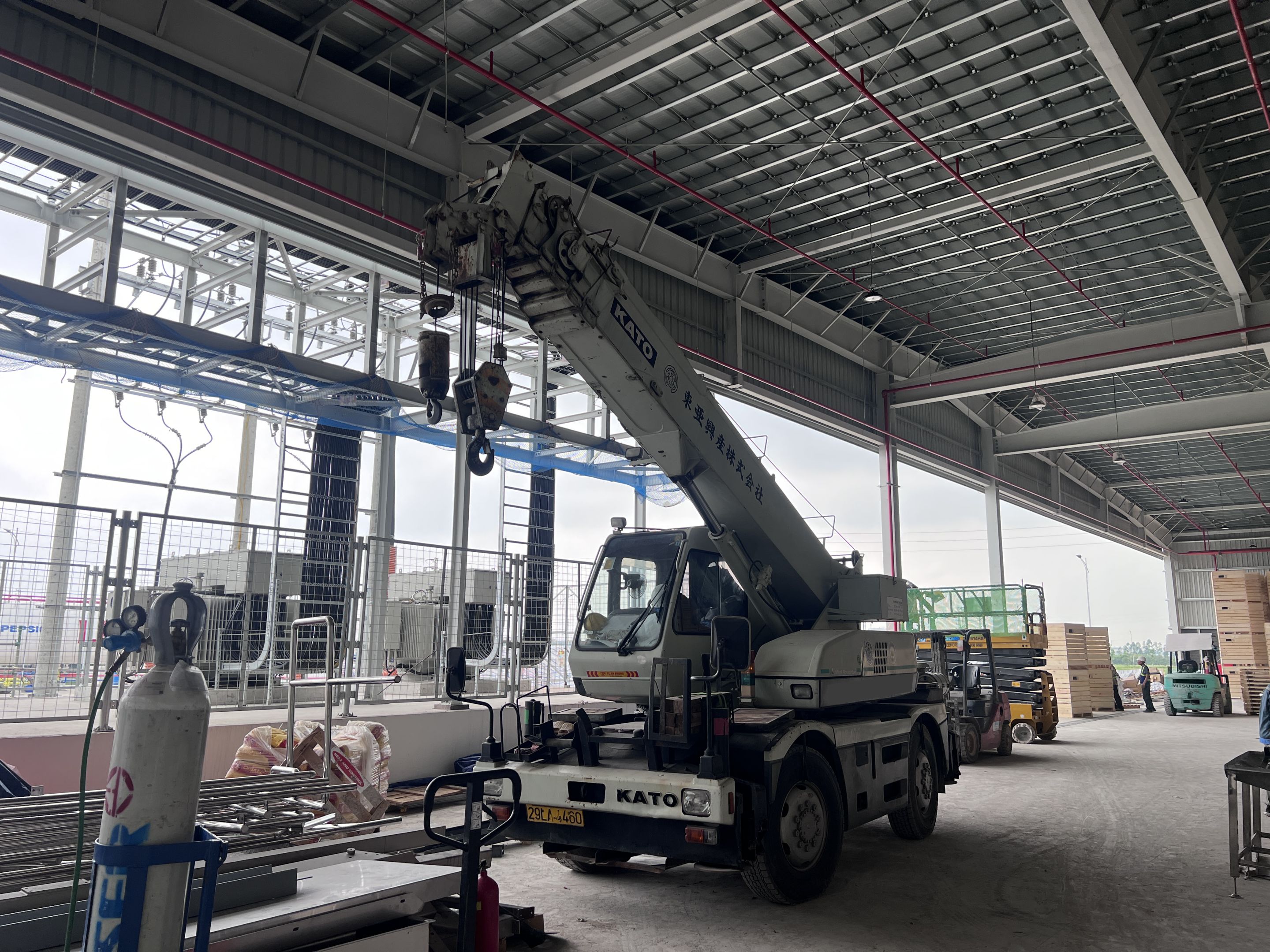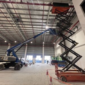 Ngoài ra khách hàng còn thuê xe cẩu 10 tấn phục vụ lắp đặt kết cấu, khung cầu thang trong nhà máy. Xe nâng người được sử dụng để lắp đặt hệ thống đèn điện, hệ thống các khung kệ thông minh trong nhà kho. Khách hàng huy động rất nhiều thiết bị xe nâng người để phục vụ quá trình thi công xây dựng và lắp đặt hà kho thông minh.