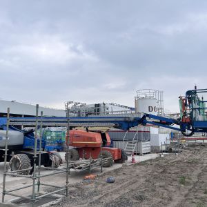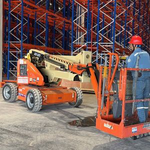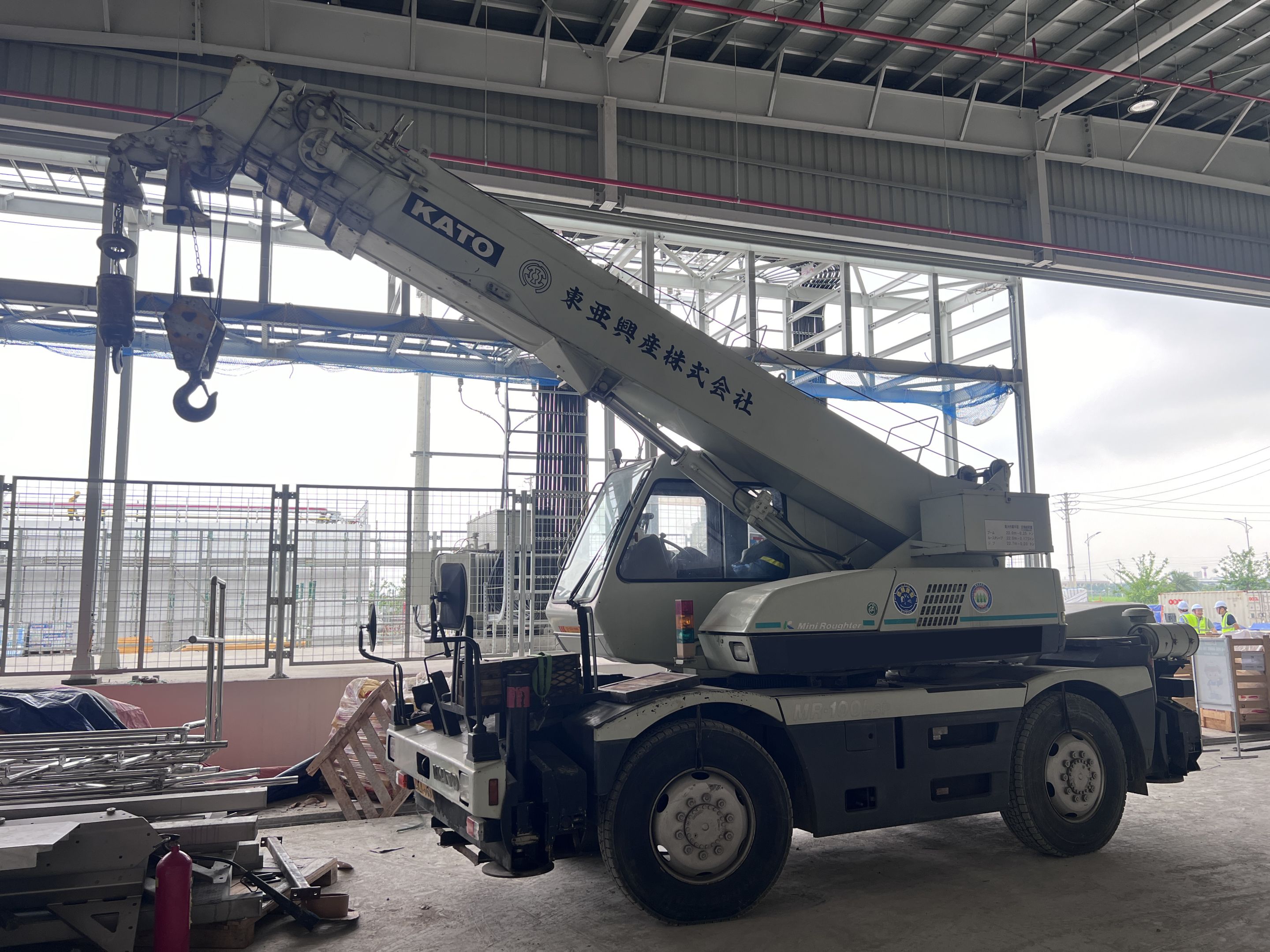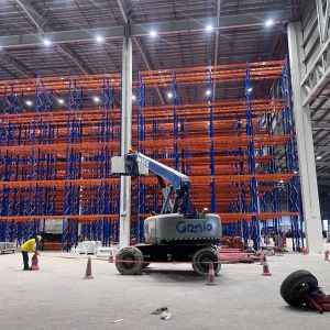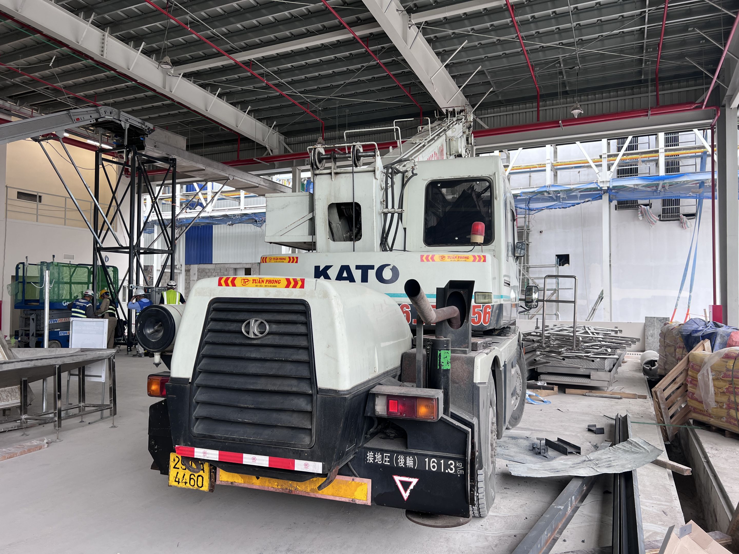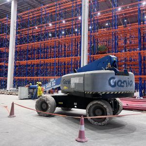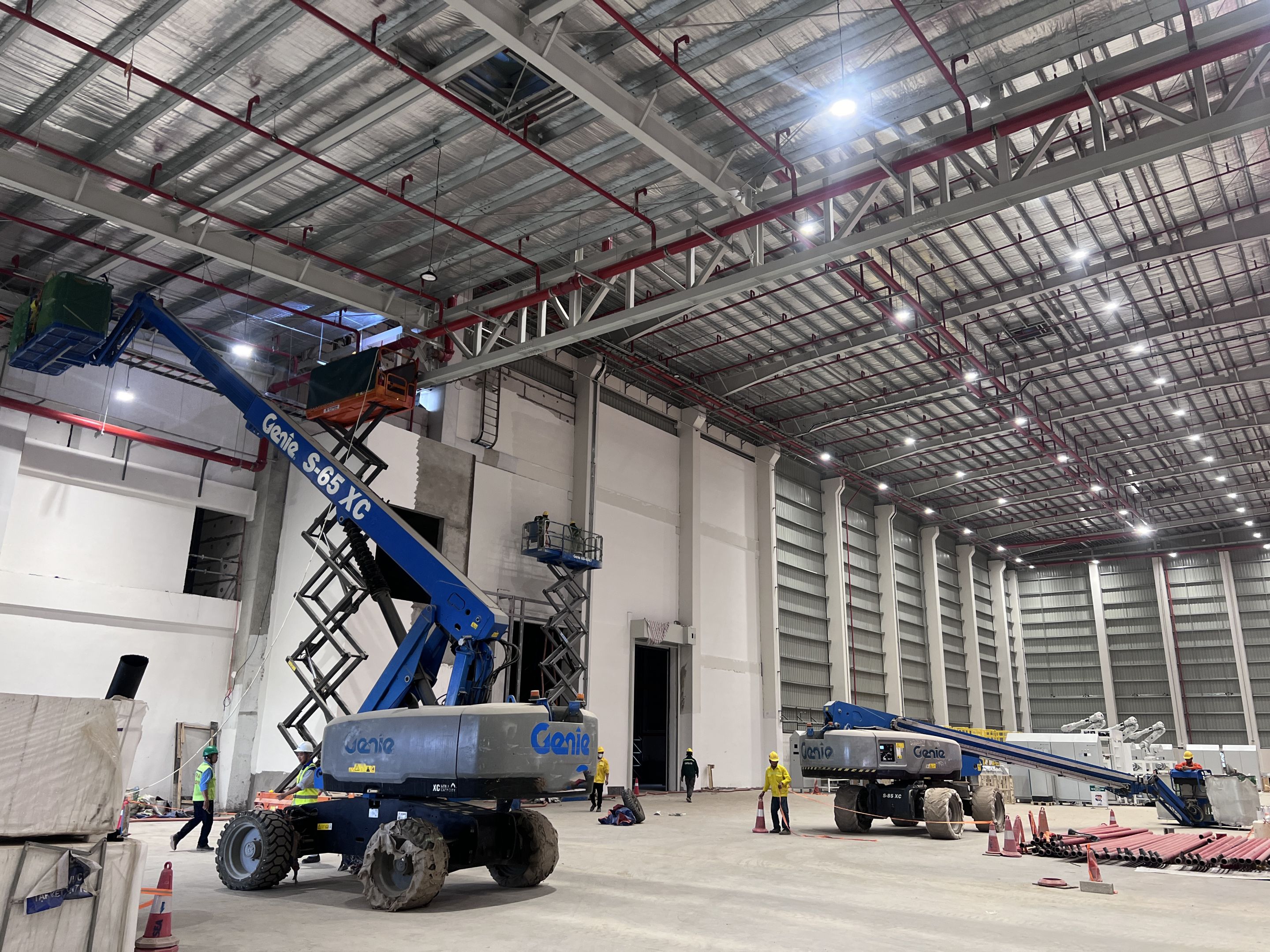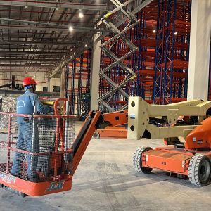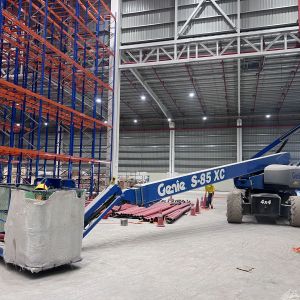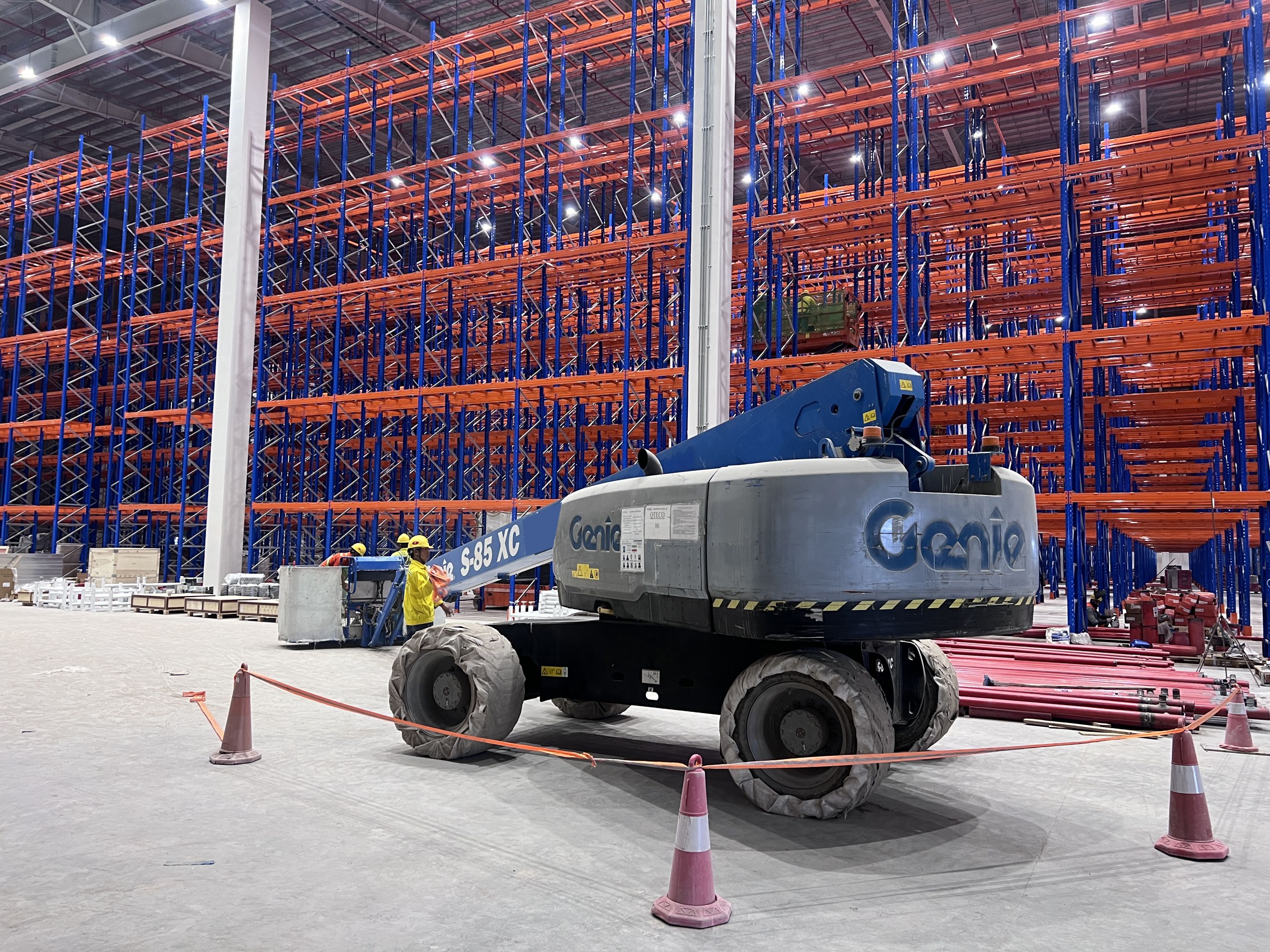 Ngoài ra khách hàng còn thuê xe cẩu 10 tấn phục vụ lắp đặt kết cấu, khung cầu thang trong nhà máy. Xe nâng người được sử dụng để lắp đặt hệ thống đèn điện, hệ thống các khung kệ thông minh trong nhà kho. Khách hàng huy động rất nhiều thiết bị xe nâng người để phục vụ quá trình thi công xây dựng và lắp đặt hà kho thông minh.