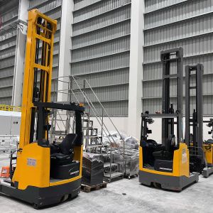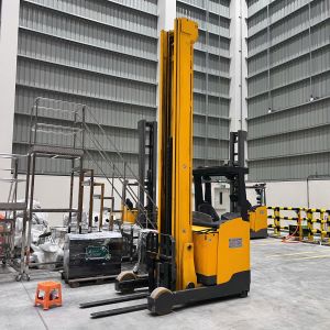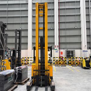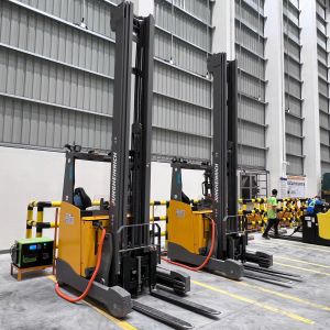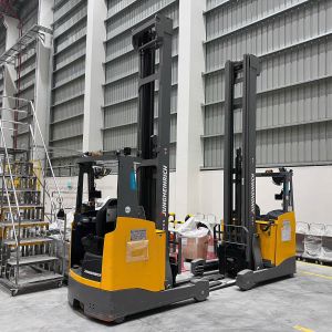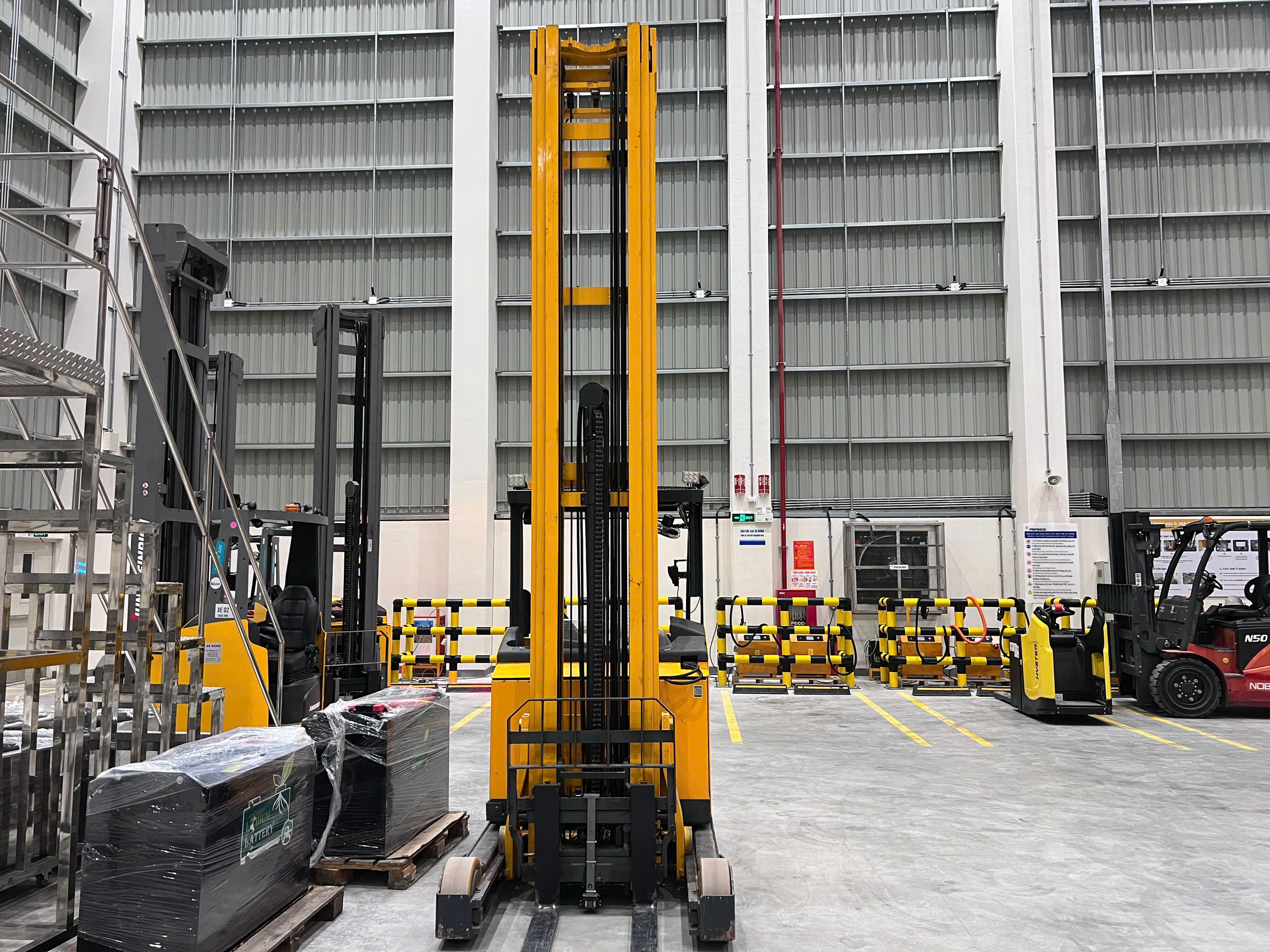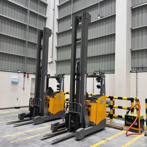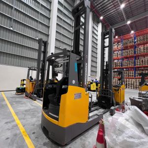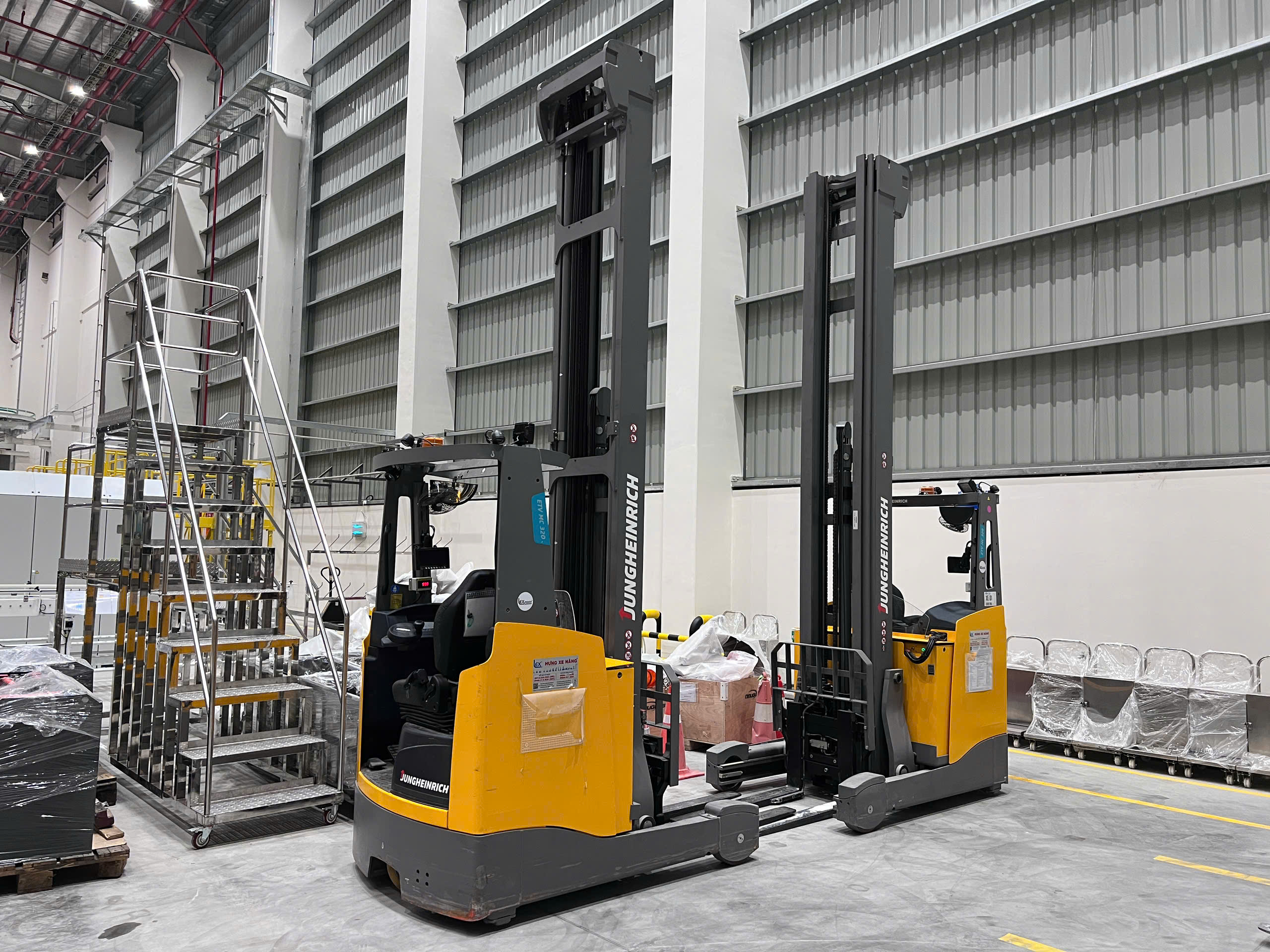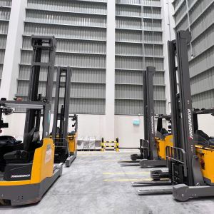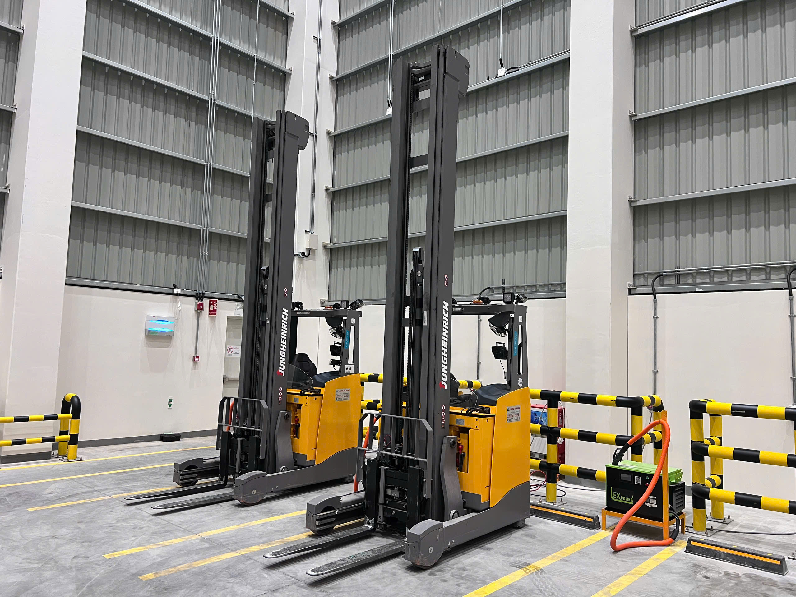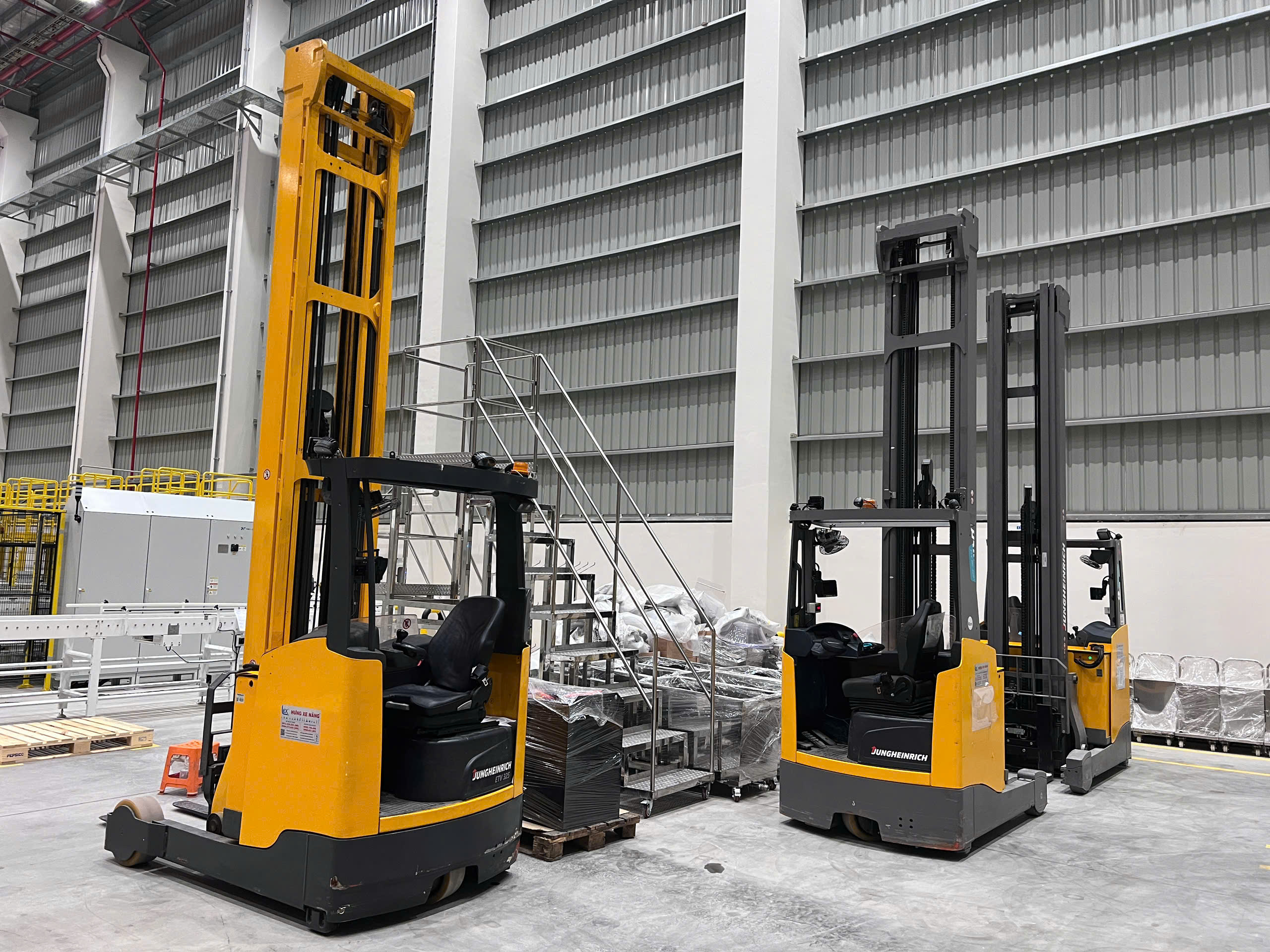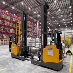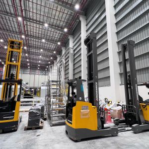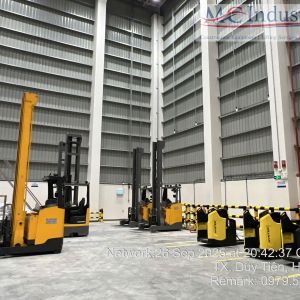 Khách hàng sẽ sử dụng 4 xe nâng hàng ngồi lái để di chuyển vào kệ giá để lấy hàng hóa xuống, xe nâng hàng đứng lái có nhiệm vụ nâng hạ hàng hóa và di chuyển và dây chuyền sản xuất. Xe nâng hàng ngồi lái phụ trách việc lấy hàng hóa và sắp xếp hàng hóa lên trên kệ, xe nâng hàng đứng lái thì di chuyển hàng hóa đi. Vì đặc điểm dòng xe nâng hàng ngồi lái có chiều cao nâng lớn nên phụ trách việc lấy hàng hóa và xếp kho. Còn xe nâng đứng lái chiều cao nâng nhỏ nên phụ trách việc nâng hạ hàng hóa. Việc này giúp khách hàng giải quyết được việc lưu kho và lấy hàng hóa trong kho nhanh chóng hơn.