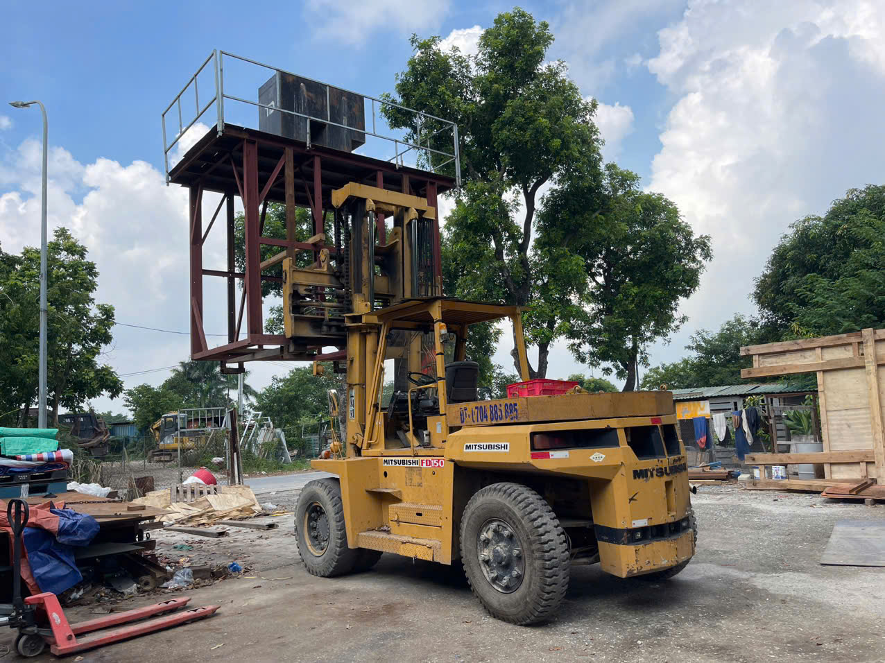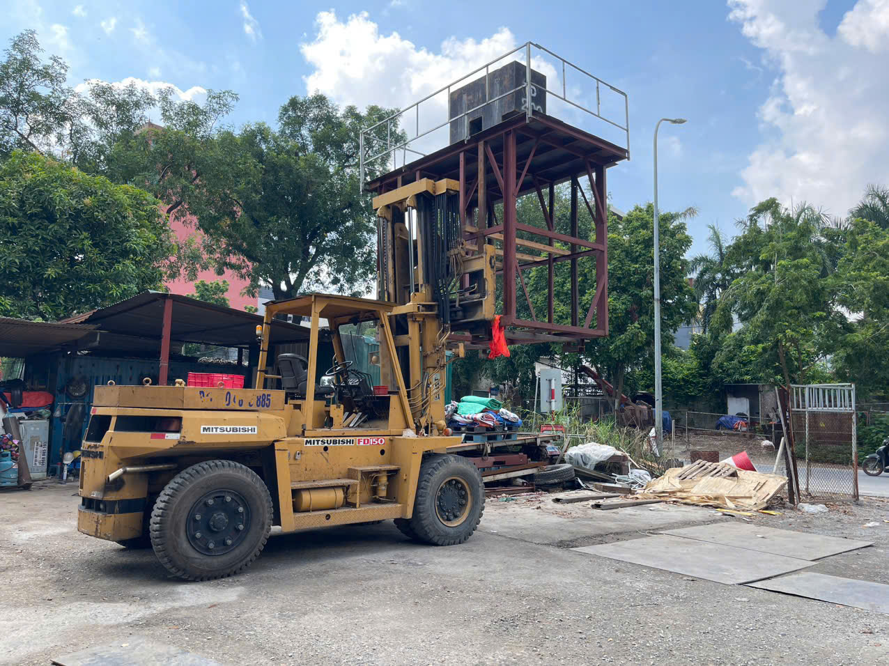 Để phục vụ cho công việc nâng hạ lần này đơn vị sử dụng xe nâng hàng 15 tấn. Kiện hàng có tải trọng 4 tấn nhưng cần nâng lên tầng 2 cao 6m. Với không gian chật hẹp nên không sử dụng được xe cẩu. Vì vậy để giải quyết phương án này, đơn vị đã tạo một khung nâng, đặt hàng lên khung nâng và xe nâng hàng sẽ nâng khung nâng và hàng lên trên tầng 2.