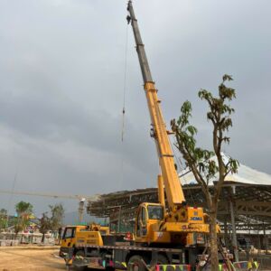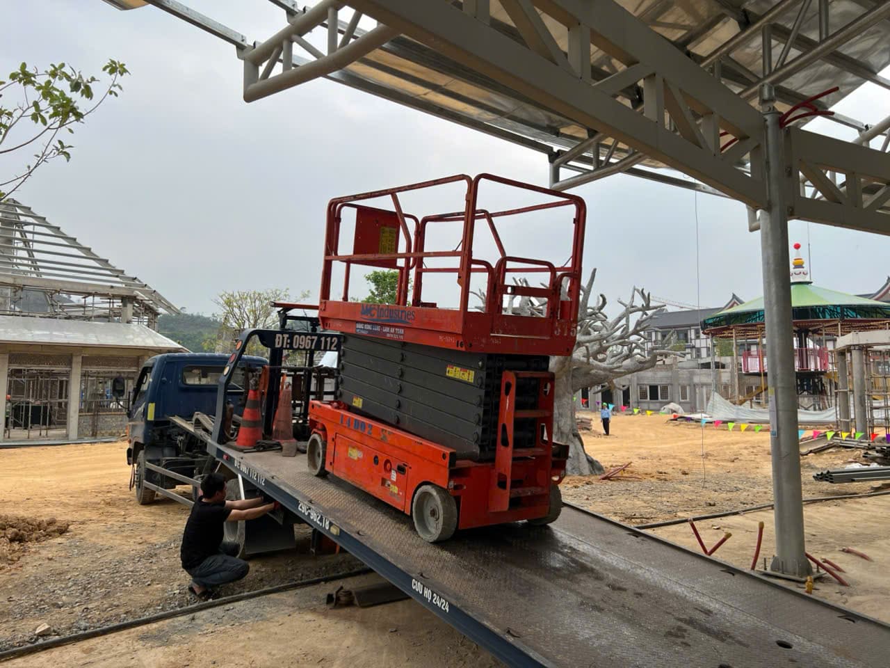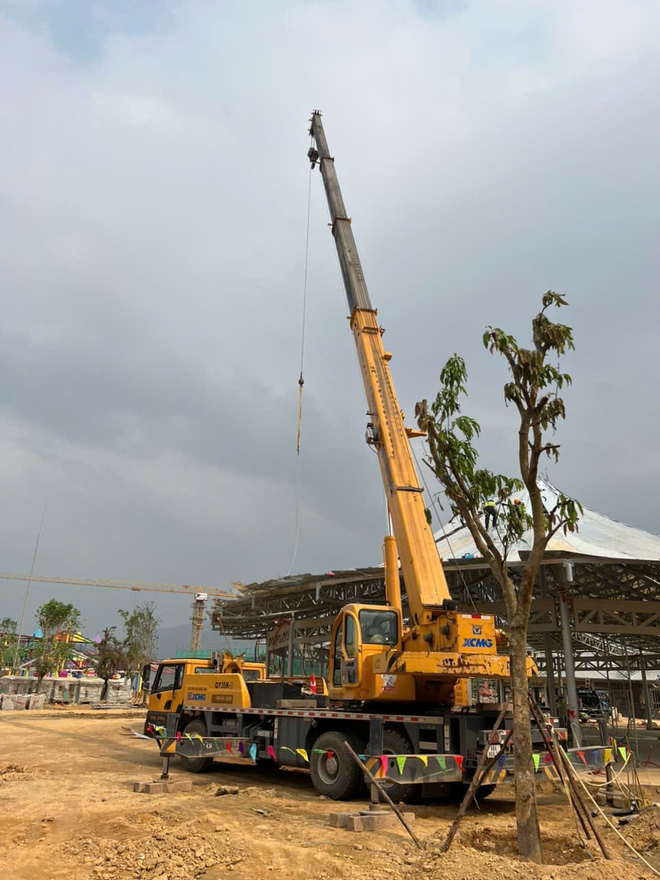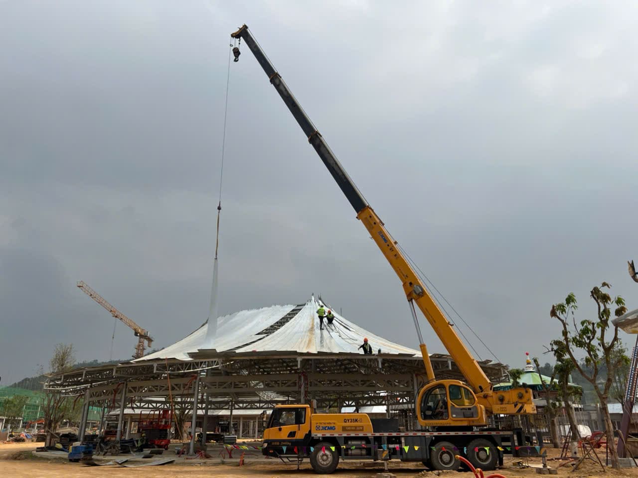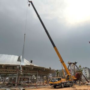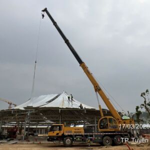 Khách hàng cần thuê xe nâng người phục vụ xây dựng lắp đặt kết cấu trong khu giải trí của dự án xây dựng của Vin tại Tuyên Quang. Xe cẩu 35 tấn lốp được thuê để lắp đặt kết cấu tòa nhà mái vòn bên ngoài trời của dự án.