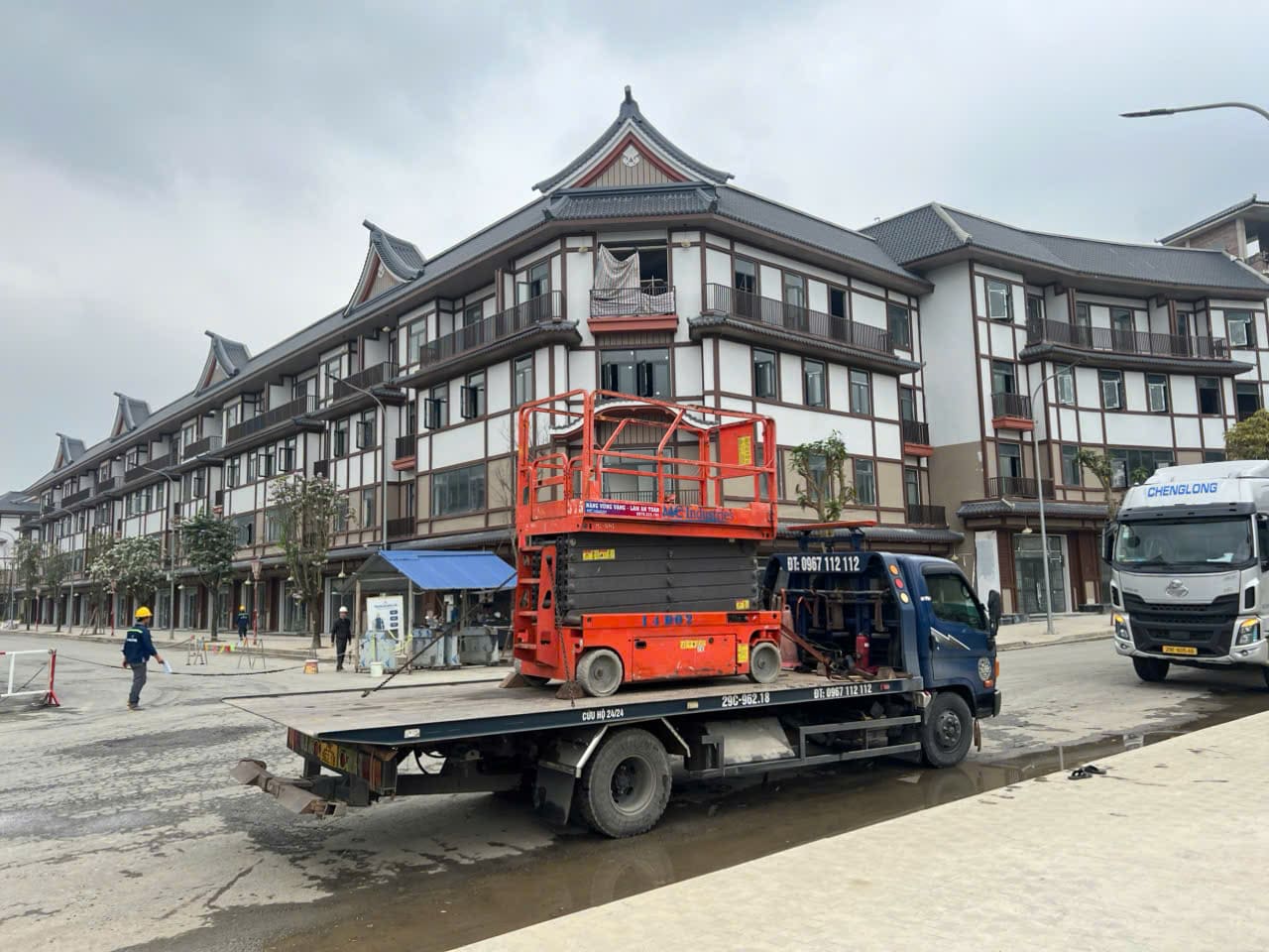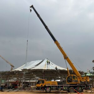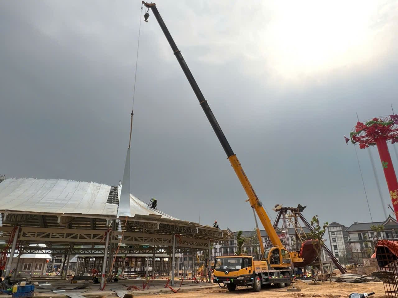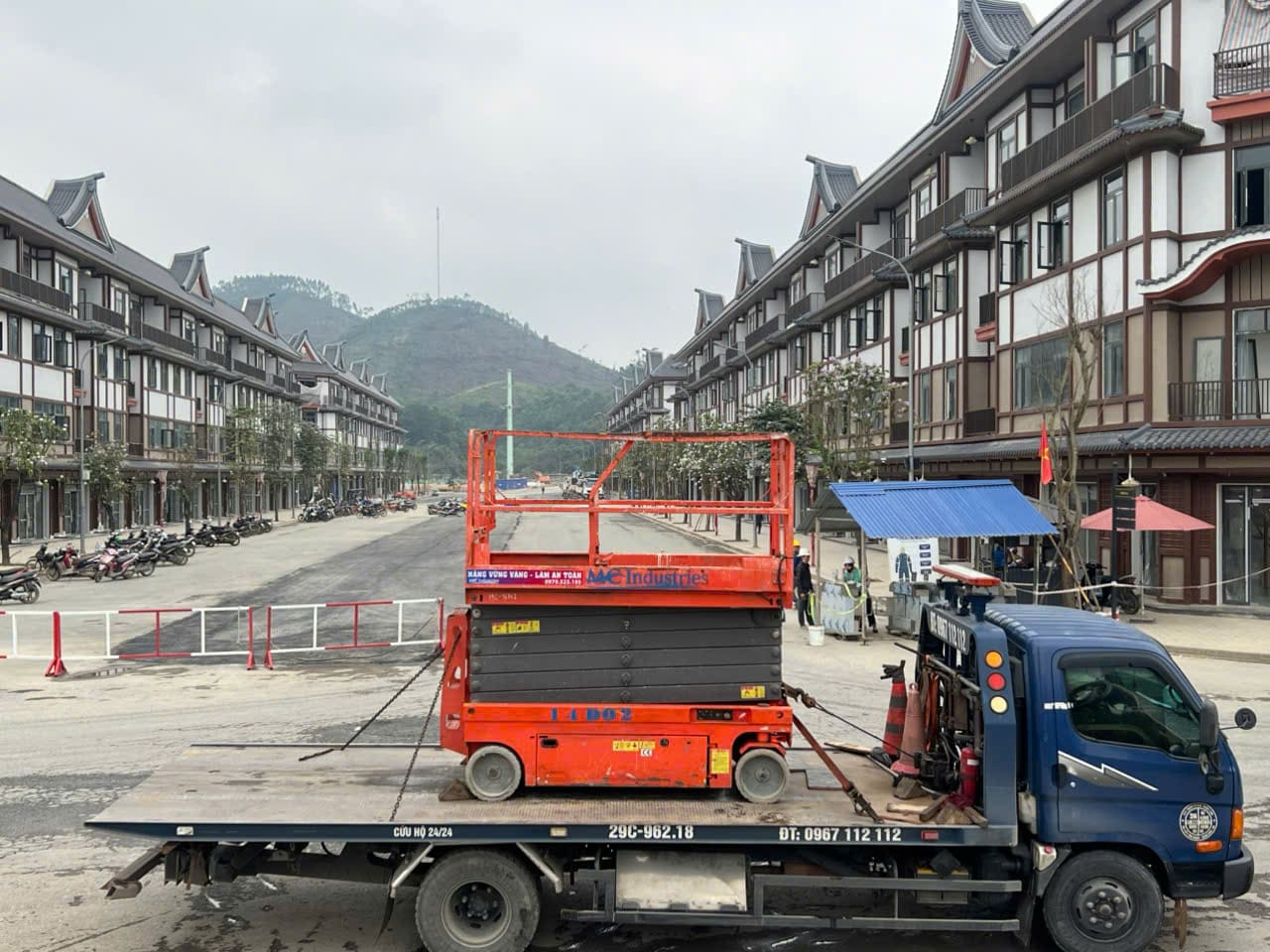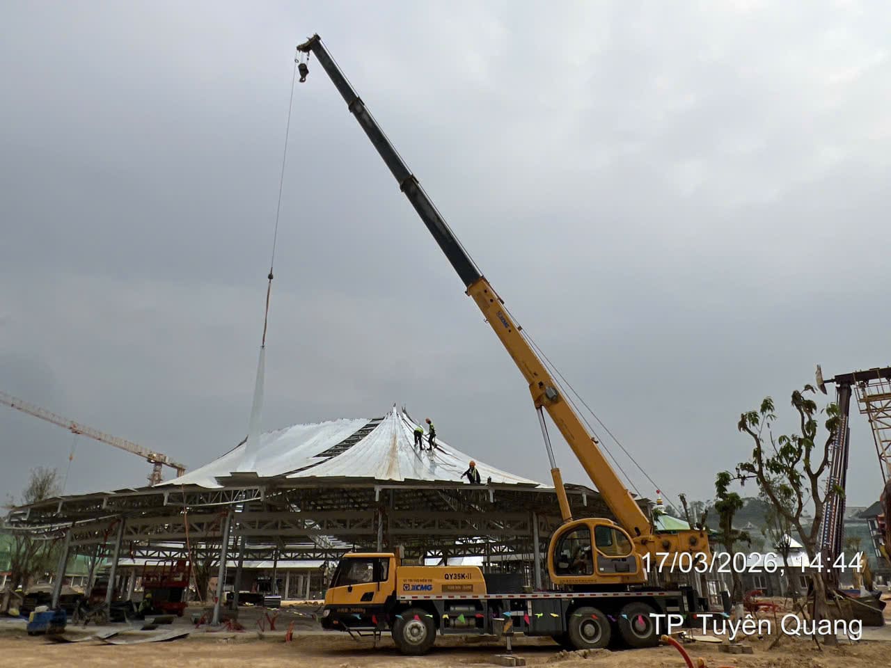 Khách hàng cần thuê xe nâng người phục vụ xây dựng lắp đặt kết cấu trong khu giải trí của dự án xây dựng của Vin tại Tuyên Quang. Xe cẩu 35 tấn lốp được thuê để lắp đặt kết cấu tòa nhà mái vòn bên ngoài trời của dự án.