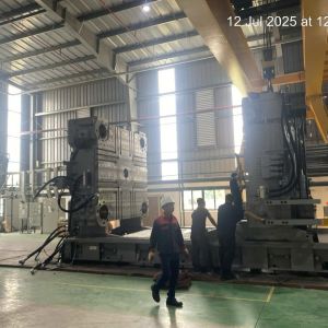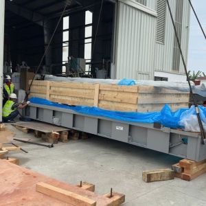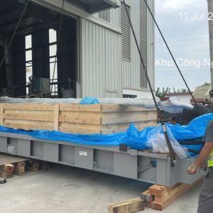 Khi khảo sát nhà máy thấy nhà máy của khách hàng có cẩu trục nên chúng tôi cần sử dụng thêm xe cẩu lốp chuyên dụng 55 tấn để cùng nâng hạ và lắp đặt máy lên.