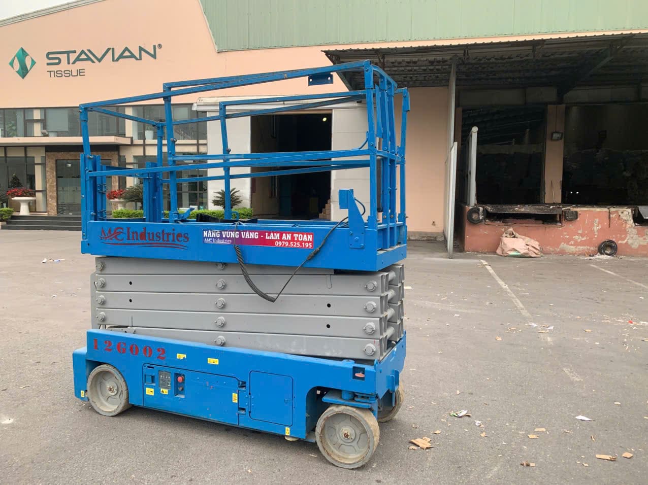 Ngày 5/1/2026 MC Industries cung cấp xe nâng người 12m sàn nhỏ chuyên làm trong nhà kho nhỏ để lắp đặt kệ giá thông minh trong nhà kho của nhà máy Stavian Tissue.
