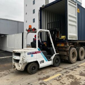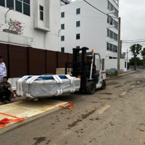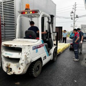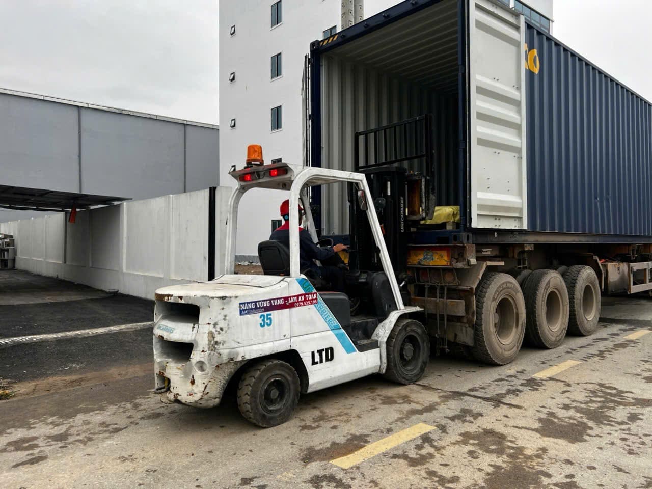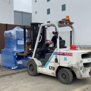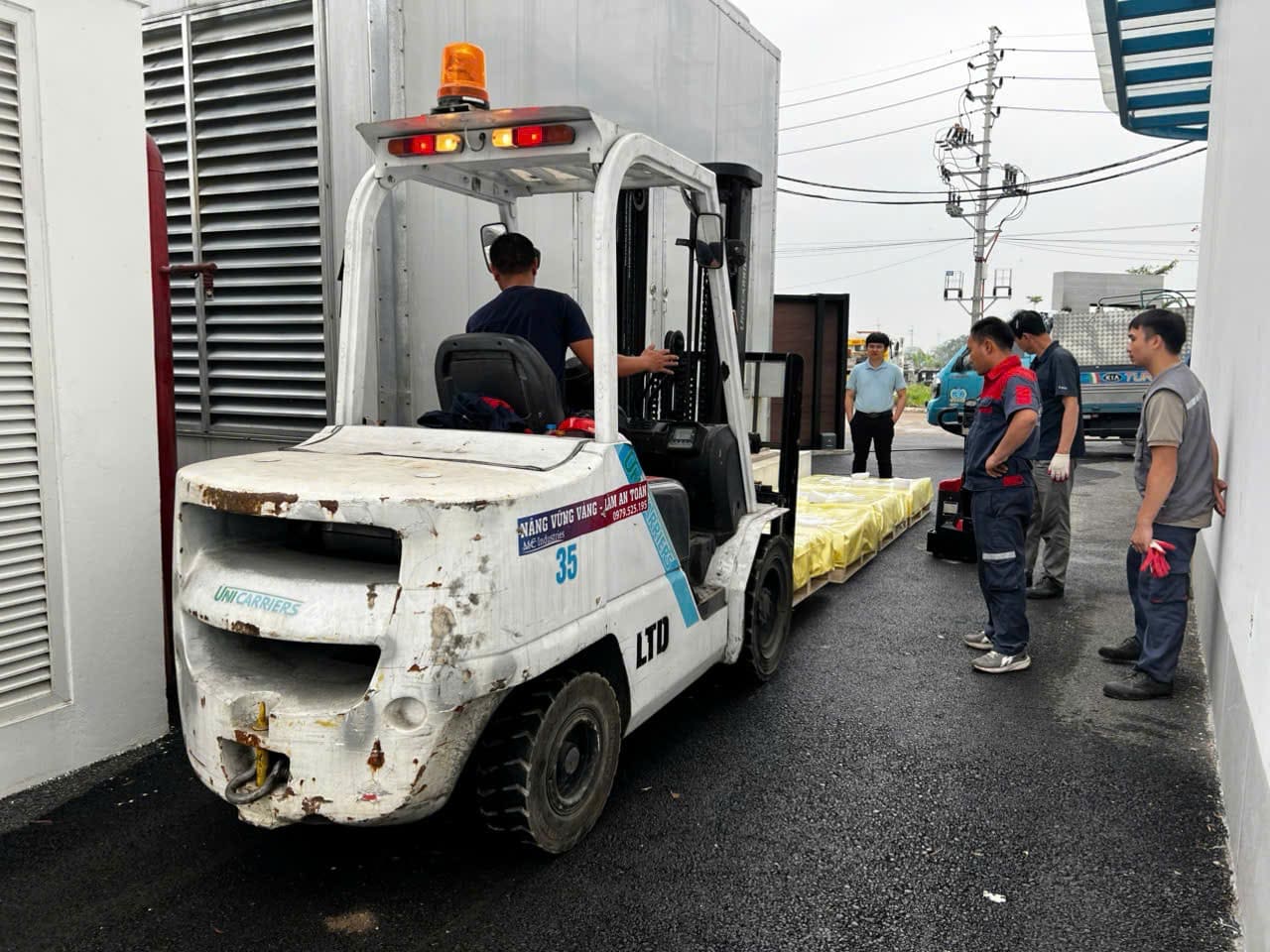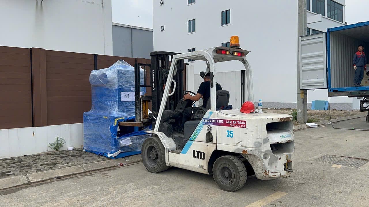 Xe nâng hàng thực hiện bốc hàng từ trên xe container vận chuyển xuống vị trí tập kết. Sau khi đưa vào vị trí tập kết xe nâng hàng đưa vào cửa nhà máy, rồi đưa rùa cơ và xe nâng tay để đưa thiết bị máy móc vào vị trí cần lắp đặt trong nhà máy.