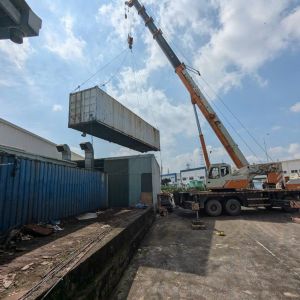 Đơn vị sử dụng xe cẩu lốp 55 tấn, cẩu container ra để có vị trí đỗ để làm việc thuận lợi.