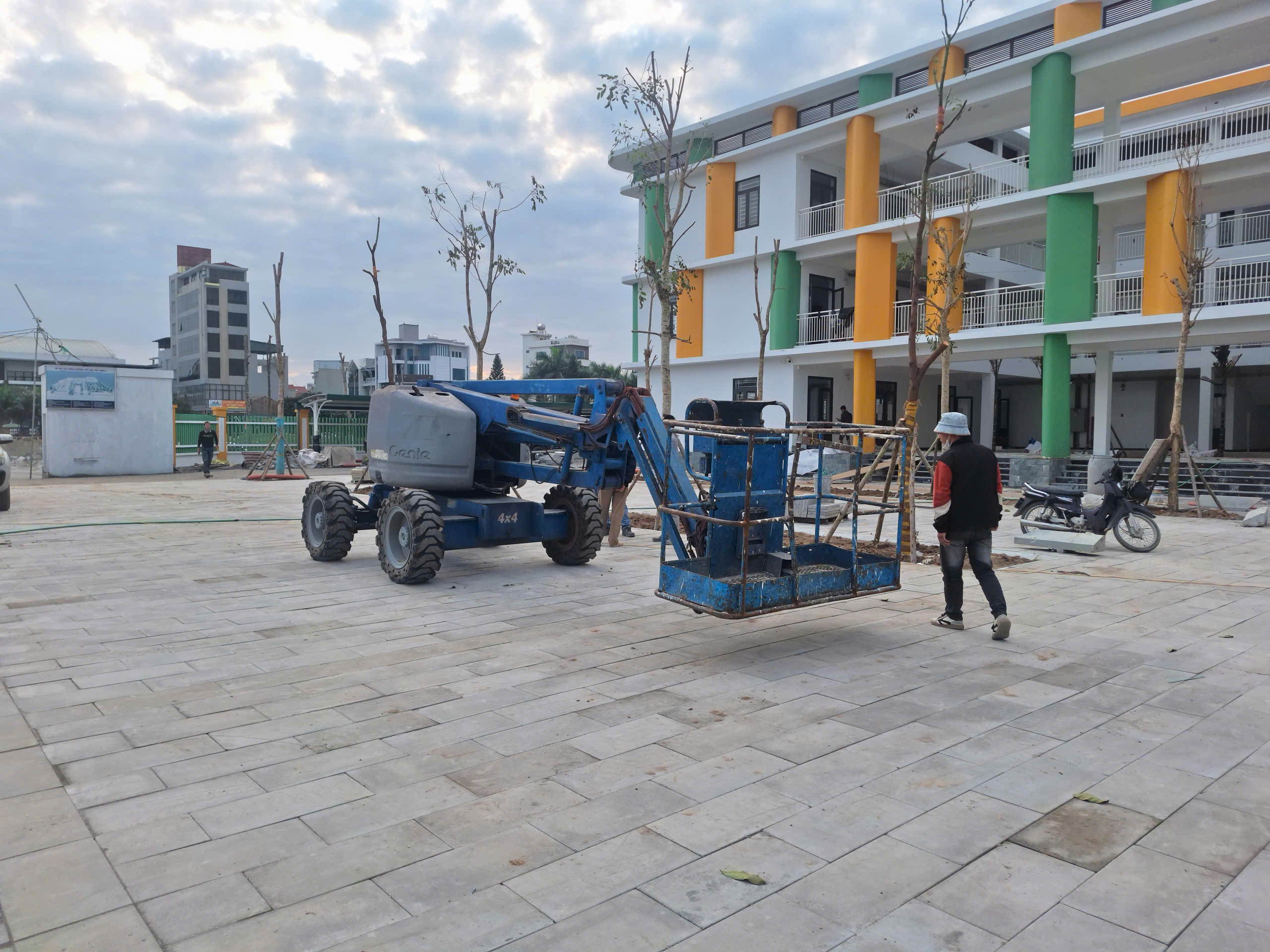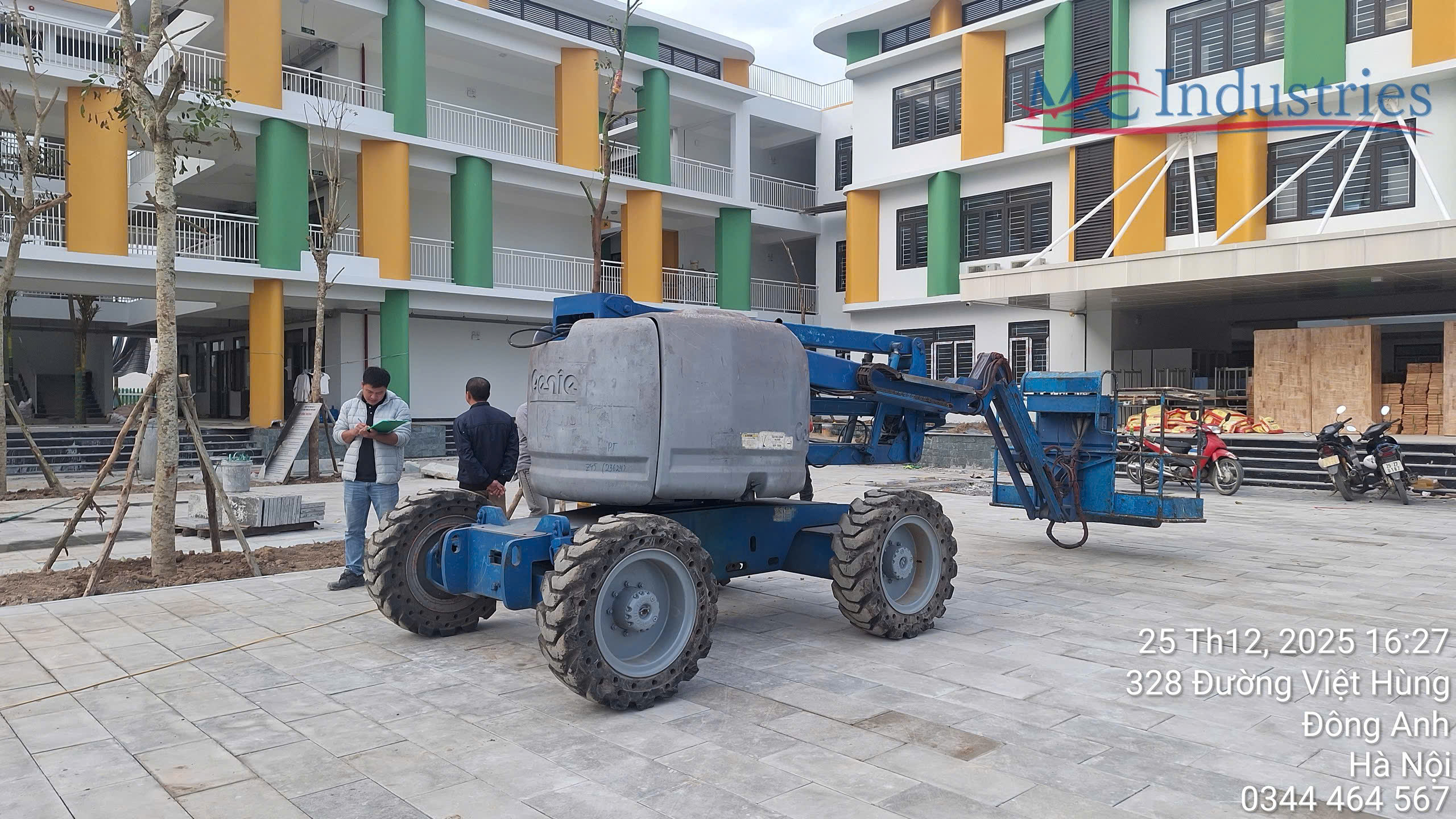 MC Industries cho thuê xe nâng người 16m boom lift cho công ty Phú Thái lắp đặt hệ thống đường máng điện cho trường tiểu học Việt Hùng Đông Anh, Hà Nội