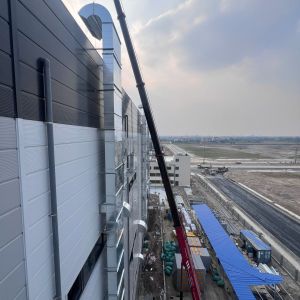 Tại dự án này chúng tôi xử dụng xe nâng hàng 5 tấn và xe cẩu 80 tấn để phục vụ công tác nâng hạ máy móc từ dưới lên trên nóc.