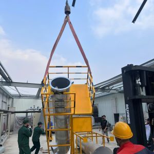 Xe nâng hàng hạ hàng từ container xuống phía dưới nhà máy, sau đó xe cẩu cẩu xe nâng hàng và hàng hóa lên trên mái nhà máy. Xe nâng hàng lên trên mái tiếp tục nâng hạ hàng hóa vào vị trí để lắp đặt.