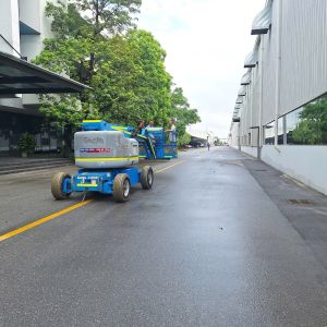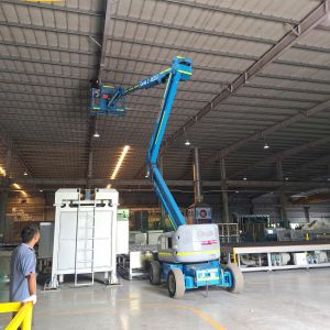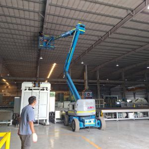 Nhà máy bảo trì, thay thế hệ thống đèn chiếu sáng, sửa chữa hệ thống làm mát, hệ thống PCCC của nhà máy. Khách hàng cần thuê xe nâng người làm việc trong vòng 1 tuần, không thuê thợ lái.