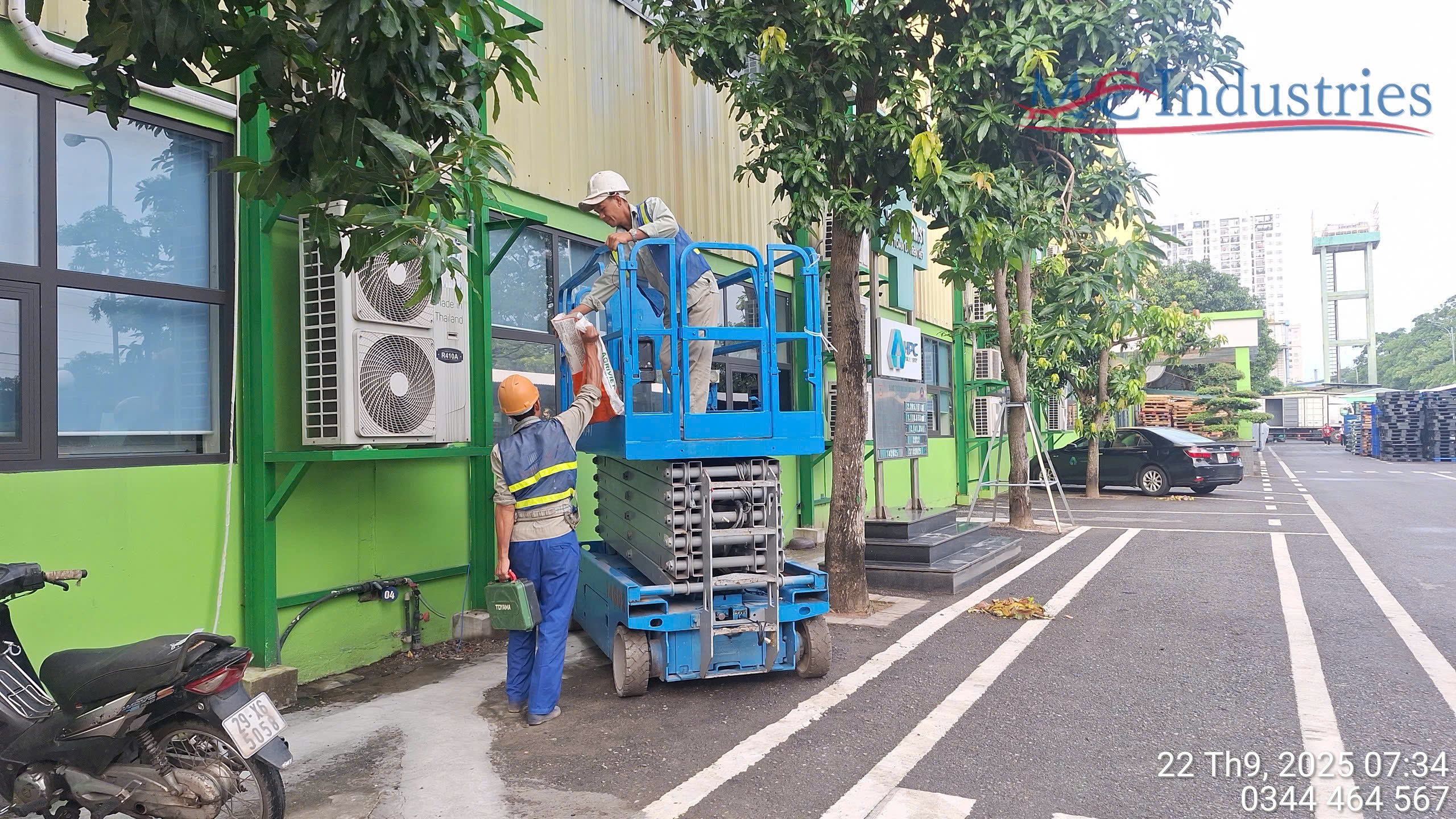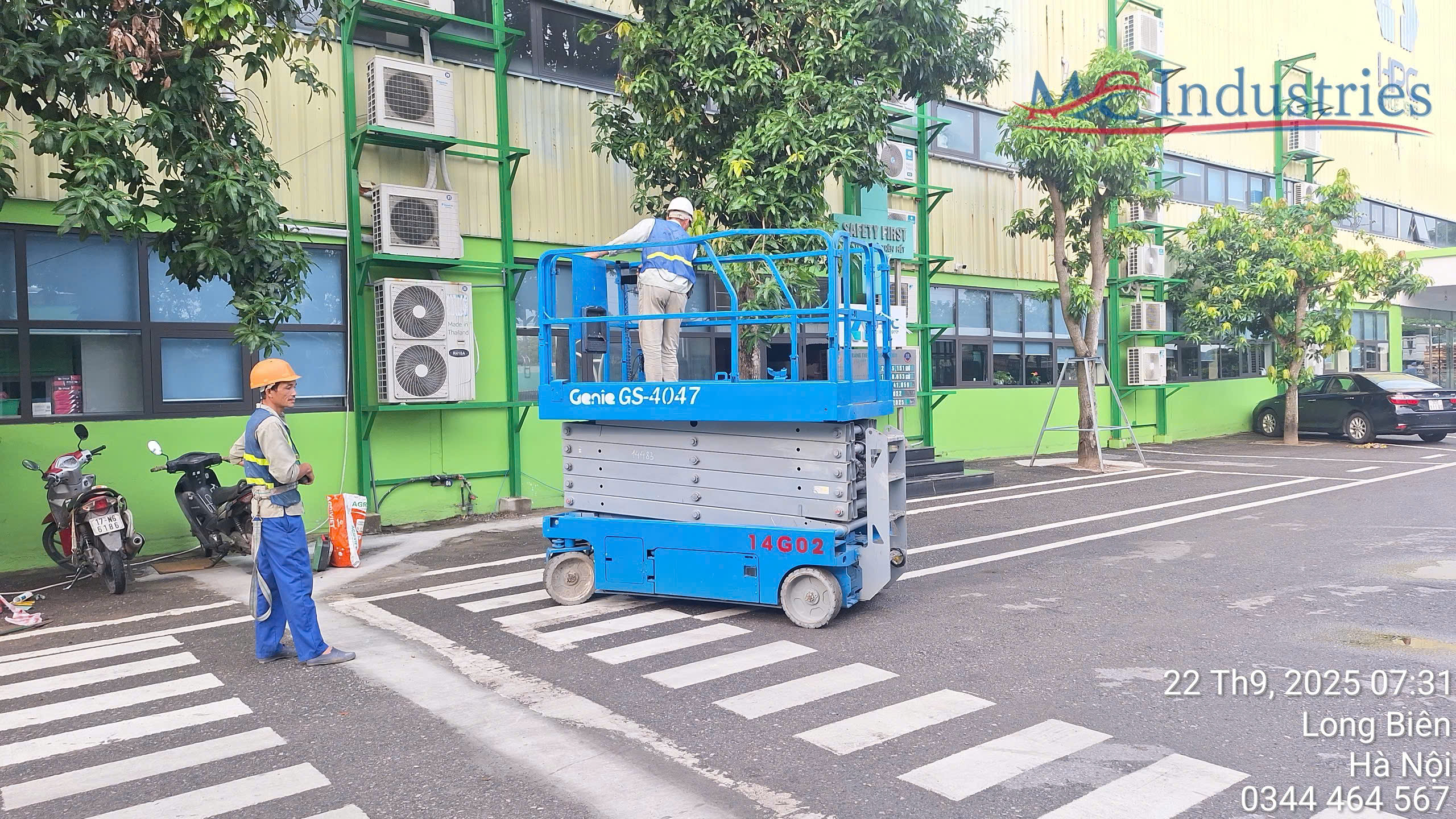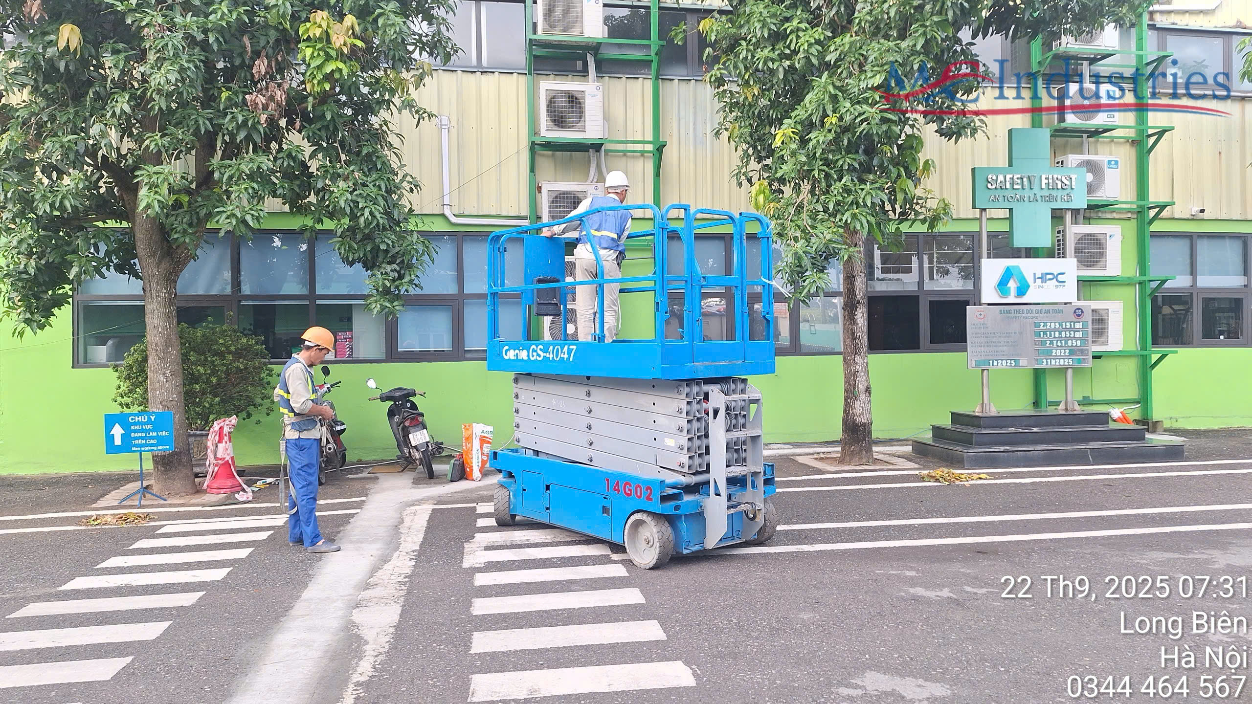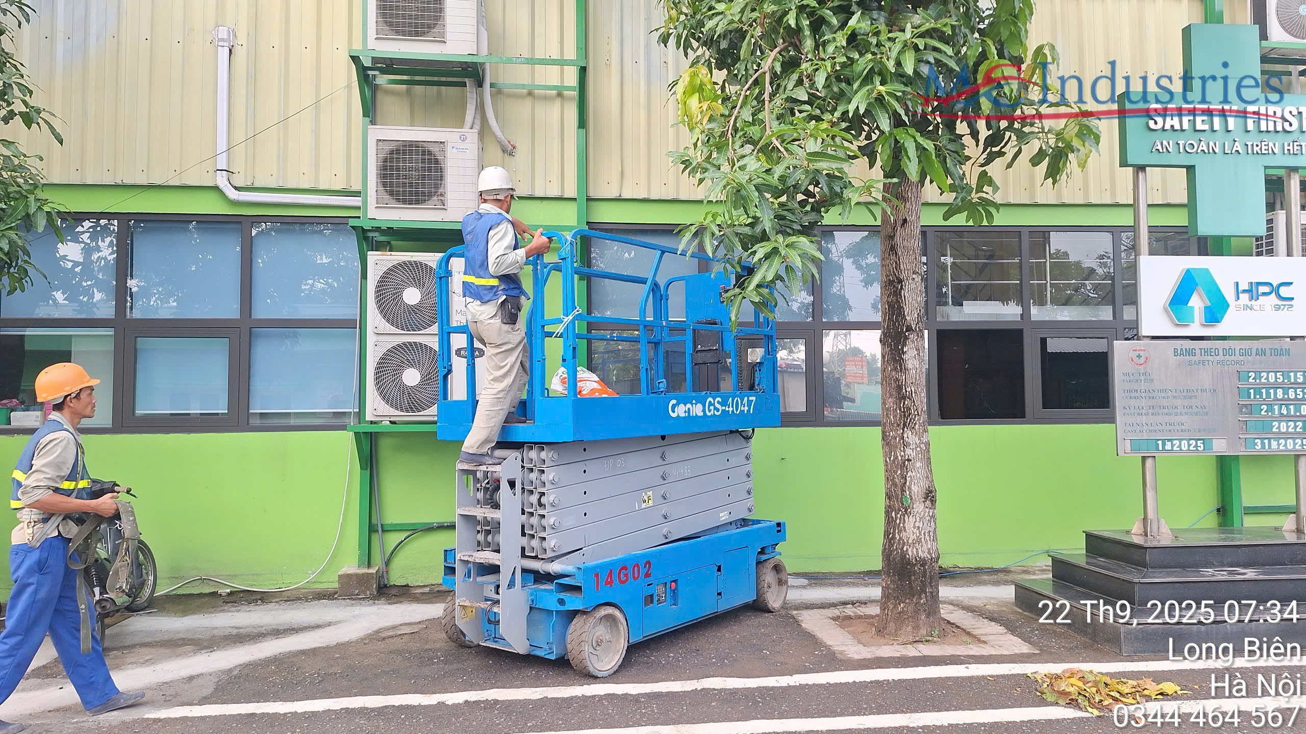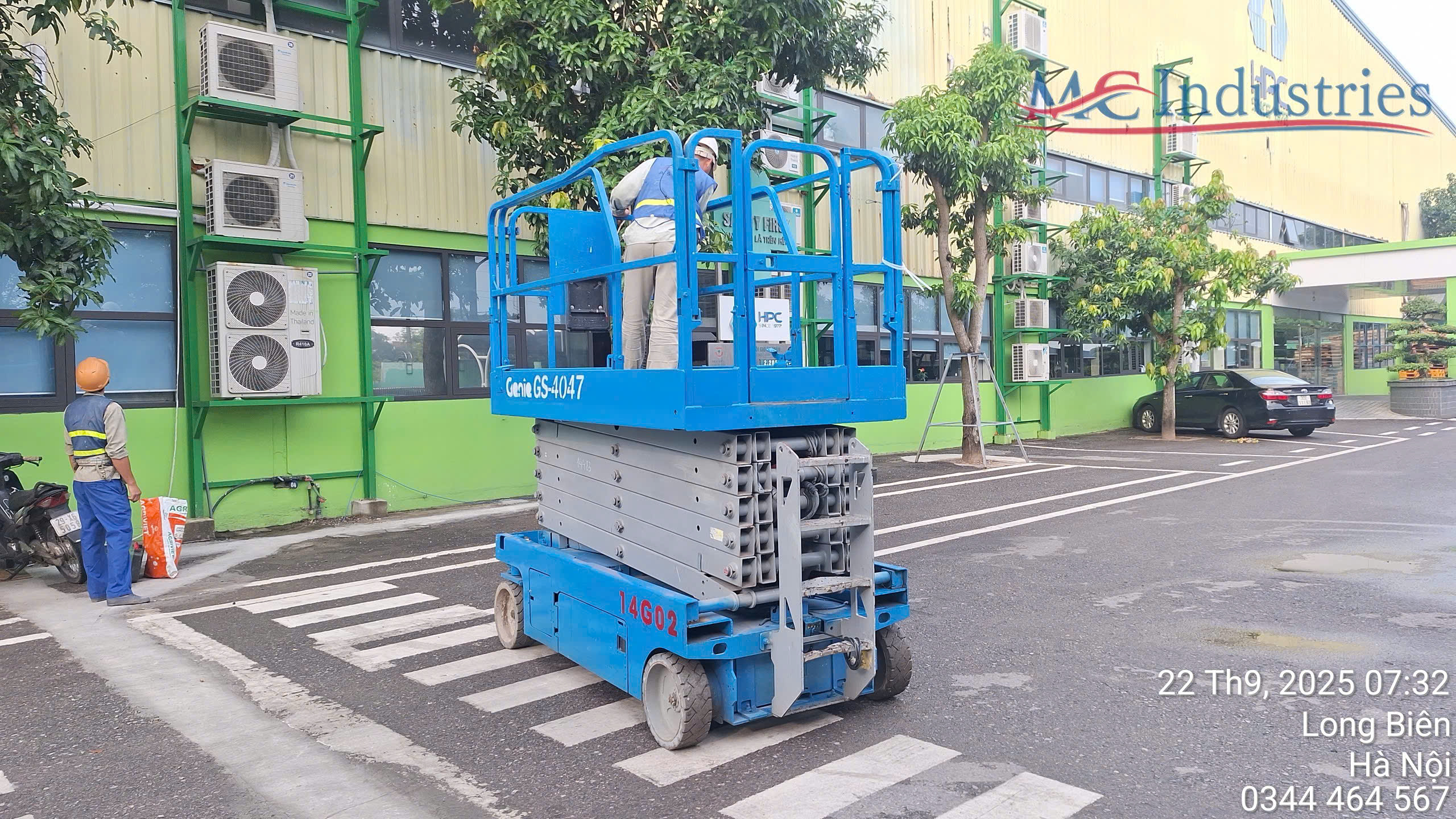 Ngày 22/9/2025 MC Industries cung cấp xe nâng người 14m cắt kéo chạy điện phục vụ thi công chống thấm cho nhà máy nhựa Hà Nội.
