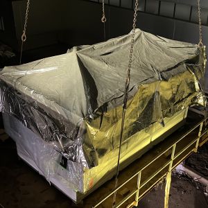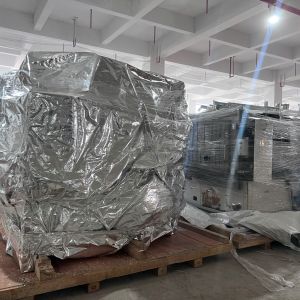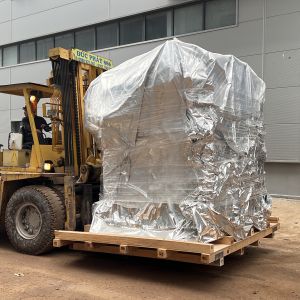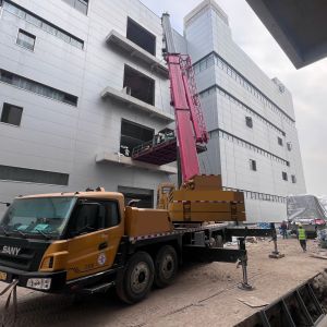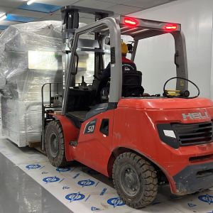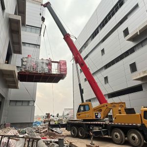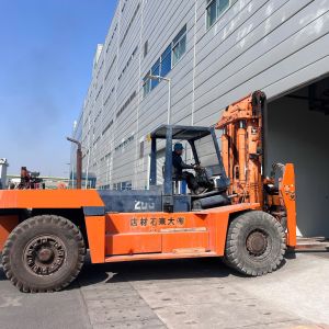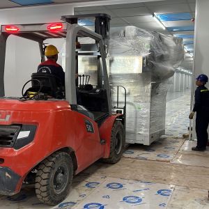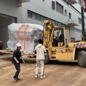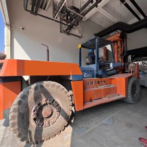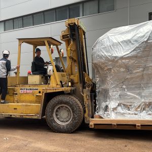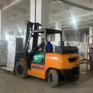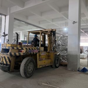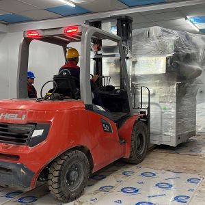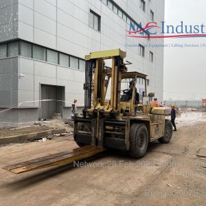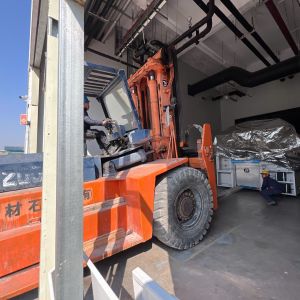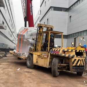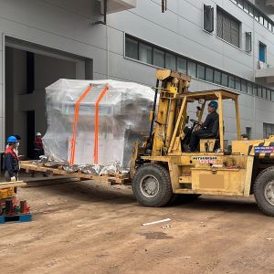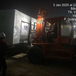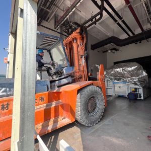 Xe nâng hàng 20 tấn được sử dụng để nâng máy móc đã được bọc kín lên trên xe vận chuyển. Việc di chuyển máy từ trong nhà máy ra ngoài để xe nâng hàng nâng lên xe gồm có rùa hơi, con lăn chuyển máy.