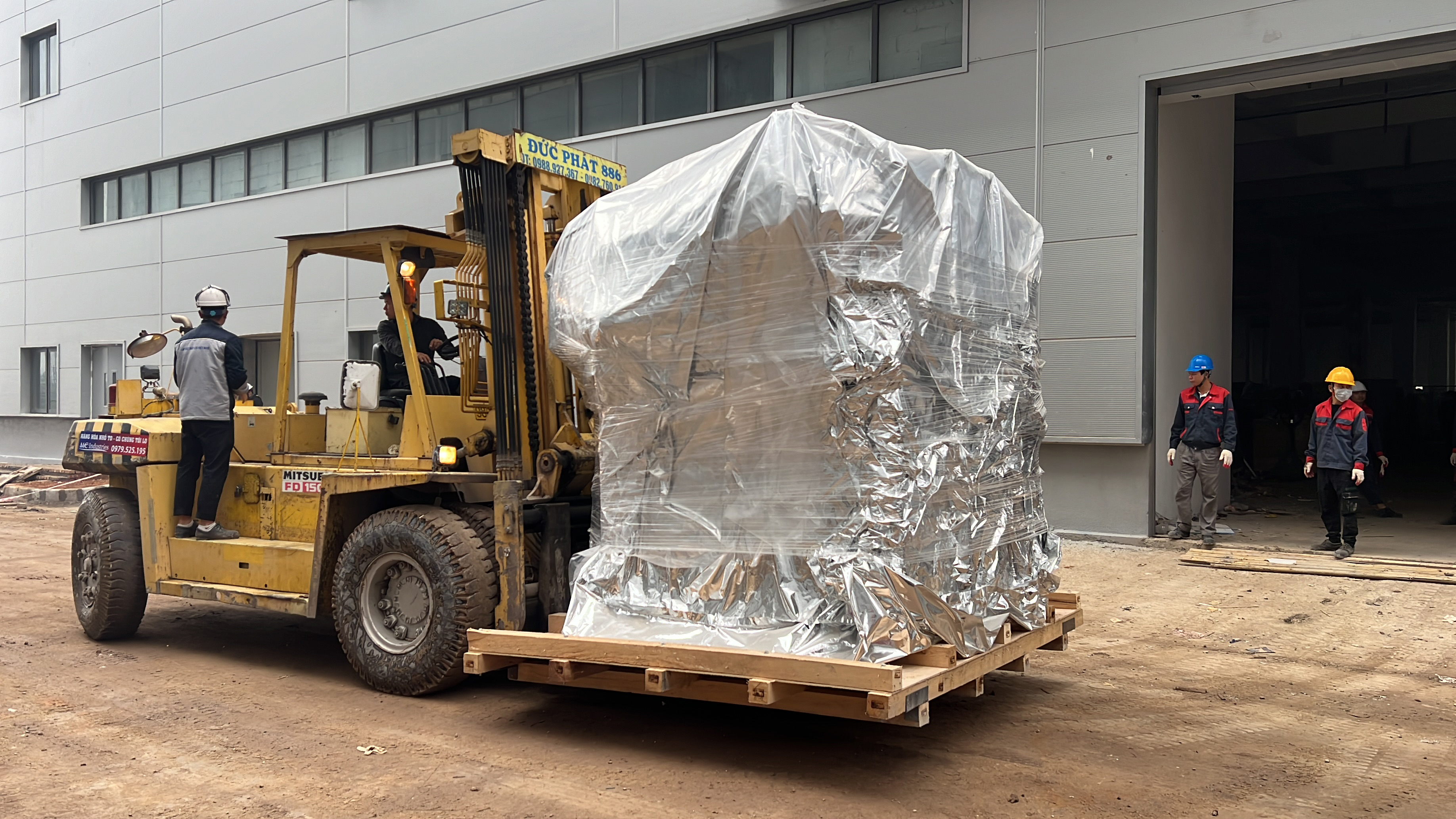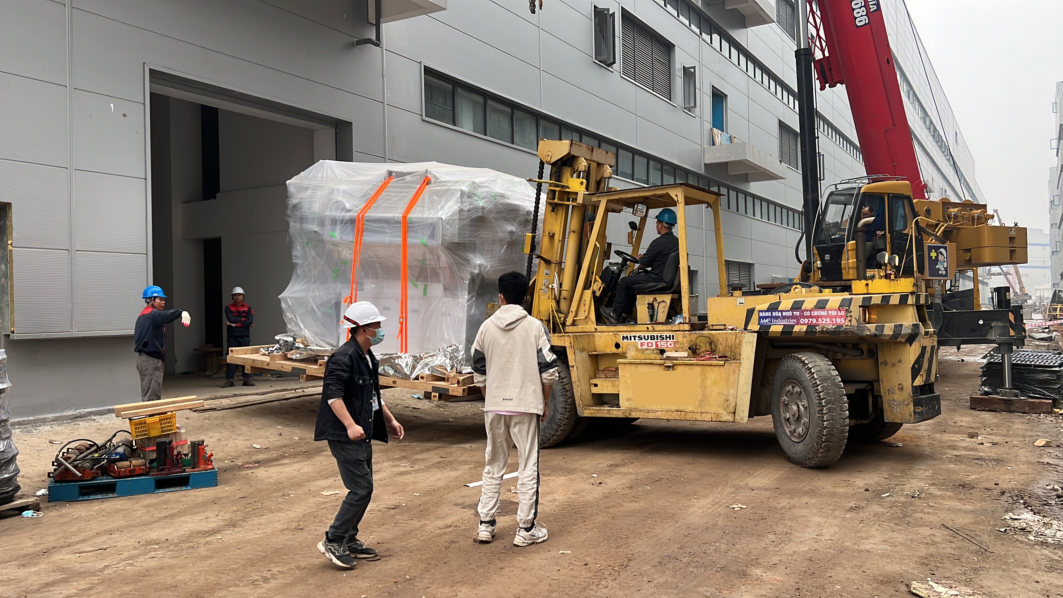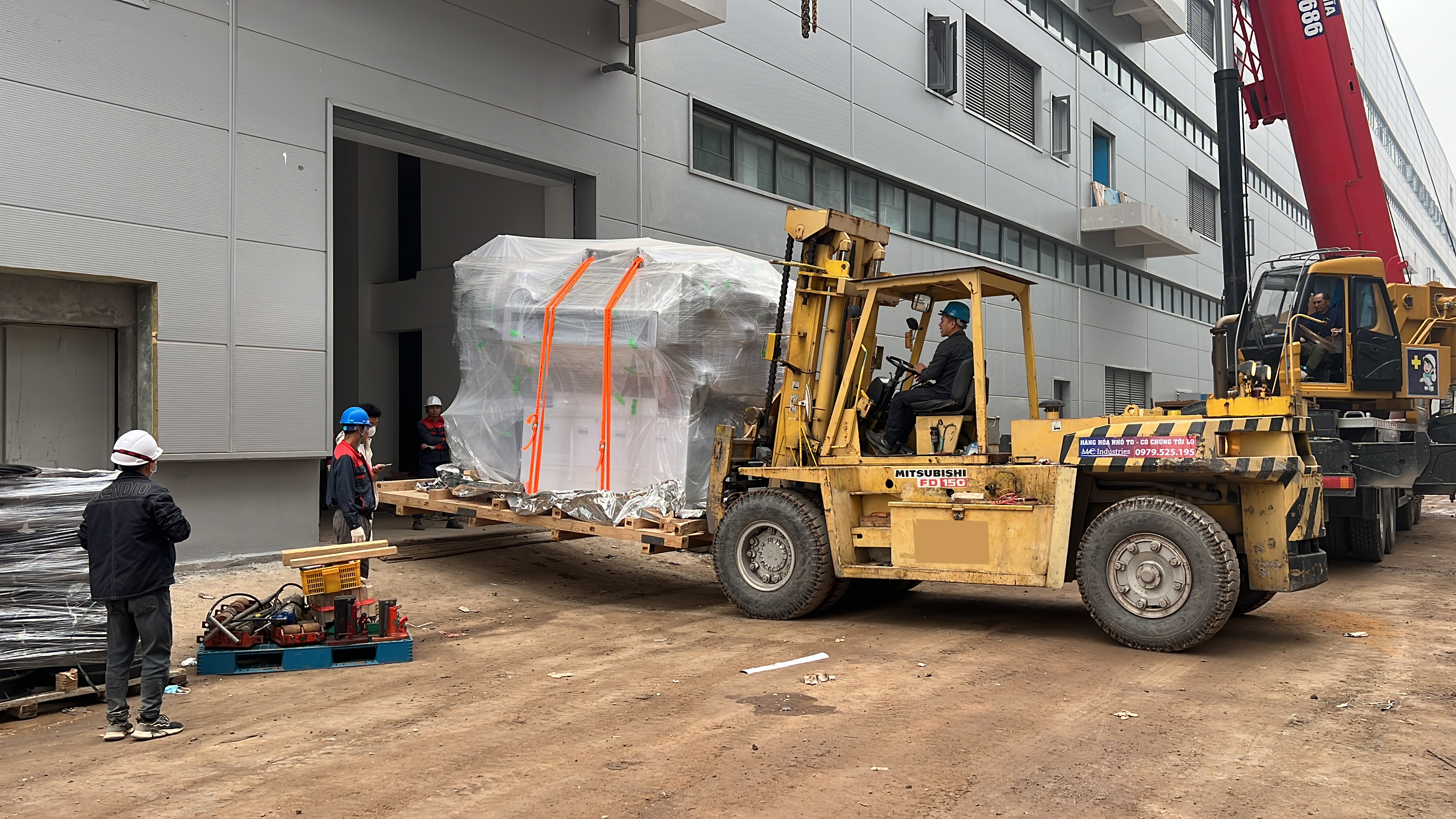 Xe nâng hàng 20 tấn được sử dụng để nâng máy móc đã được bọc kín lên trên xe vận chuyển. Việc di chuyển máy từ trong nhà máy ra ngoài để xe nâng hàng nâng lên xe gồm có rùa hơi, con lăn chuyển máy.
