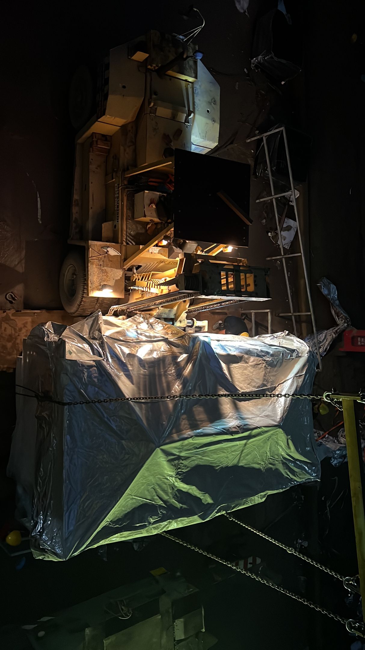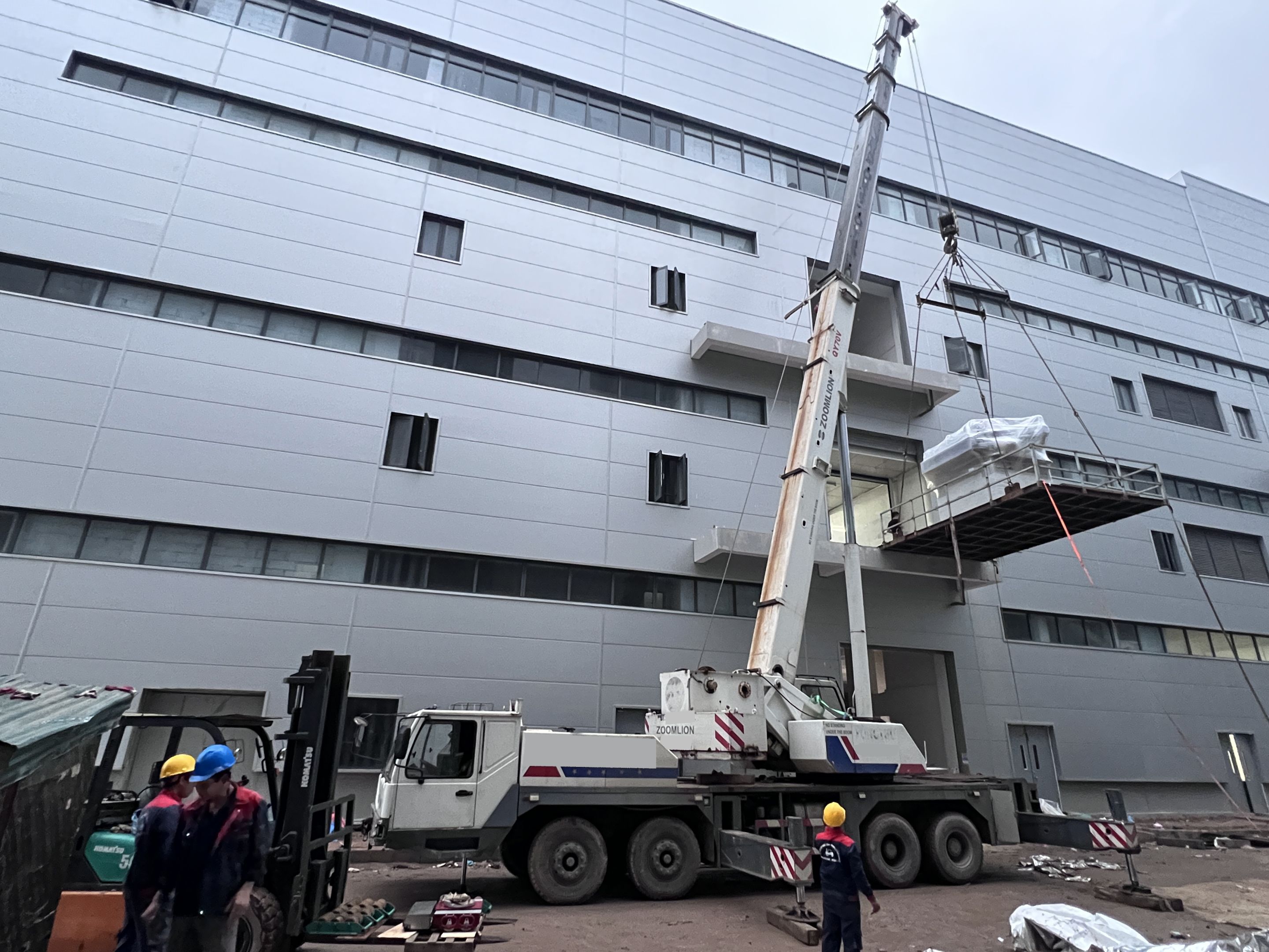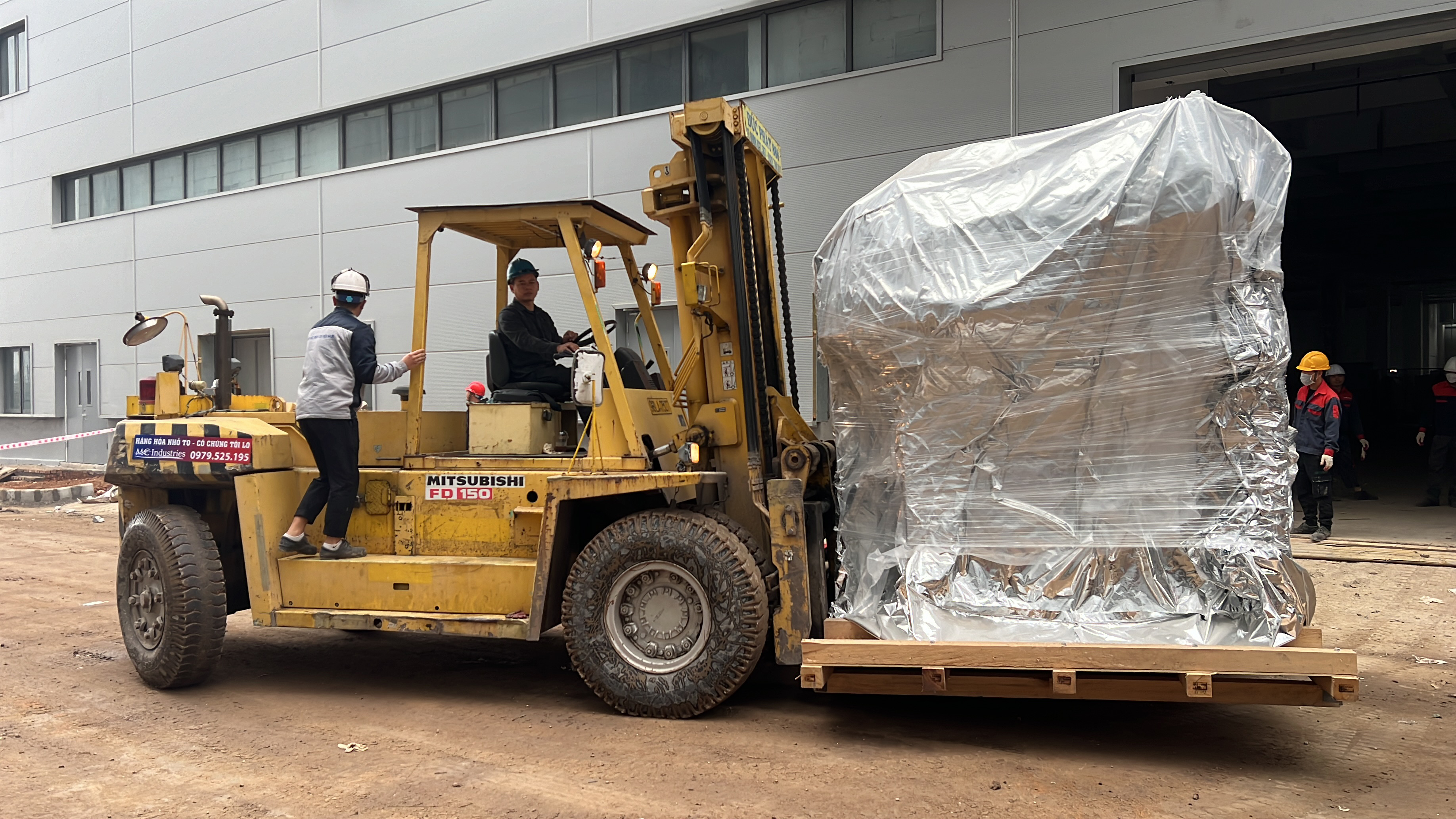 Xe nâng hàng 20 tấn được sử dụng để nâng máy móc đã được bọc kín lên trên xe vận chuyển. Việc di chuyển máy từ trong nhà máy ra ngoài để xe nâng hàng nâng lên xe gồm có rùa hơi, con lăn chuyển máy.