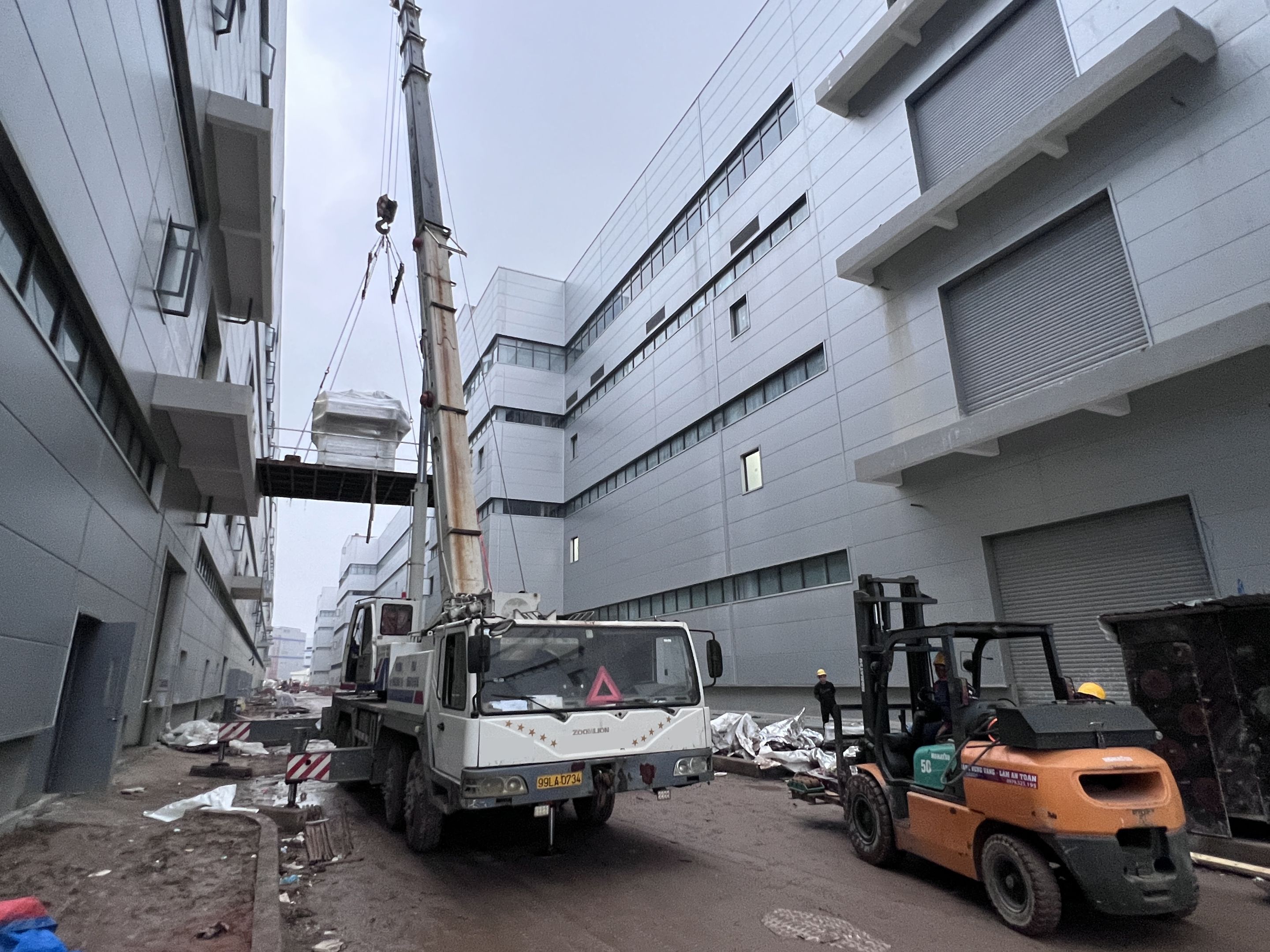 Lần này đơn vị sử dụng xe nâng hàng 5 tấn, xe nâng hàng 10 tấn, con lăn, rùa hơi, xe nâng tay, xe cẩu lốp 75 tấn, xe nâng người 28m để phục vụ công tác lắp đặt máy móc trong nhà xưởng.