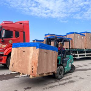 Sau khi vào trong nhà máy đơn vị tiến hành tháo rỡ những miếng gỗ và tháo bạt chống nước và cắt đai để lắp đặt cho nhà máy.