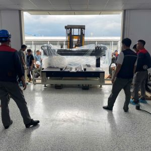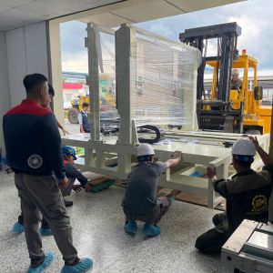 Khi hàng hóa được xe nâng hàng 7 tấn di chuyển từ ngoài xe vận chuyển vào nhà máy. Đơn vị dùng kích để kích hàng lên và đưa rùa hơi xuống phía dưới chân của hệ thống máy. Rồi điều khiển rùa hơi đi vào phía trong nhà máy, đến chố lắp đặt máy để lắp đặt. Những thiết bị máy nhẹ hơn sẽ dùng xe nâng tay để kéo, những hàng còn lại có thể dùng con lăn cơ để thực hiện.