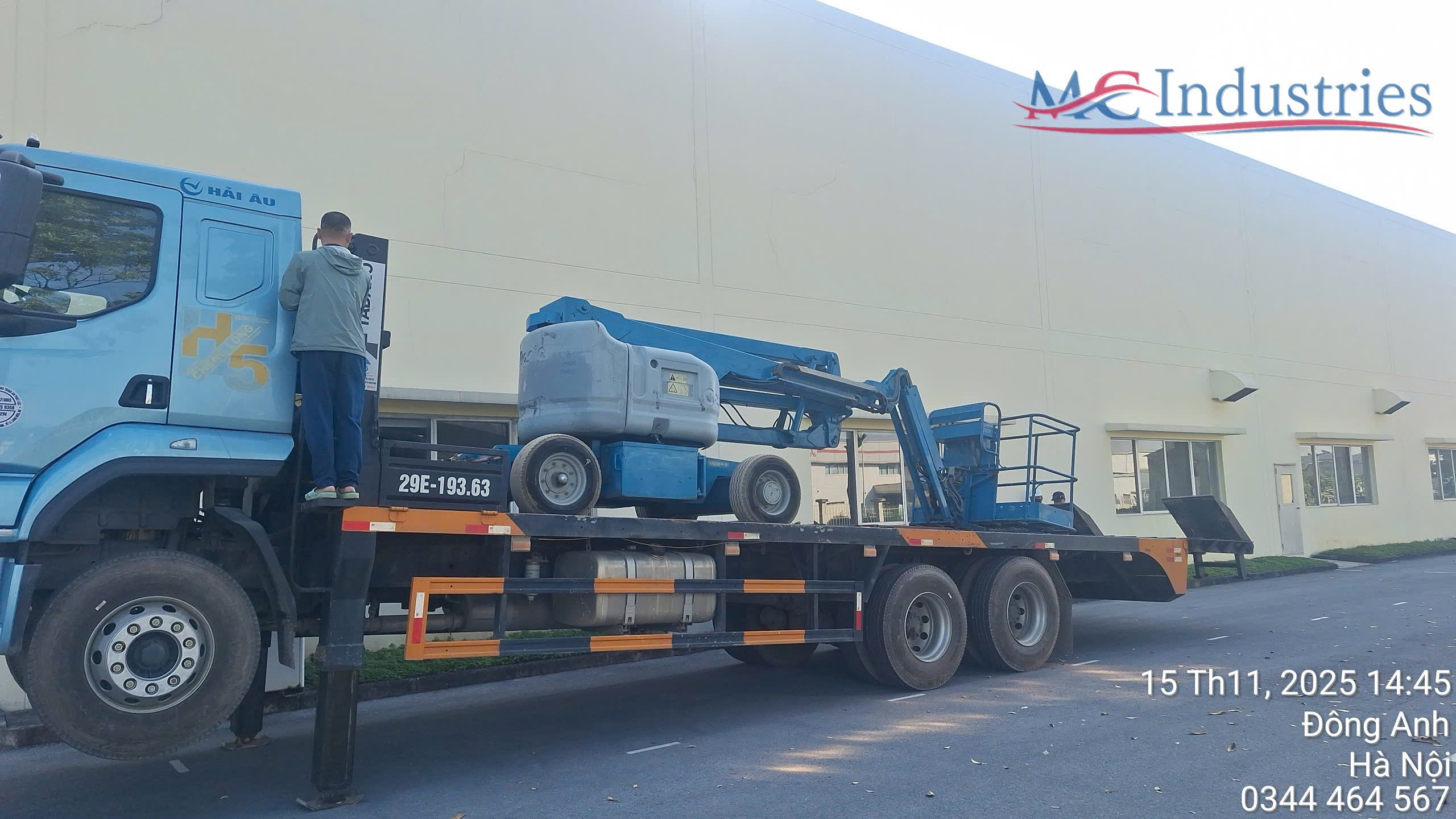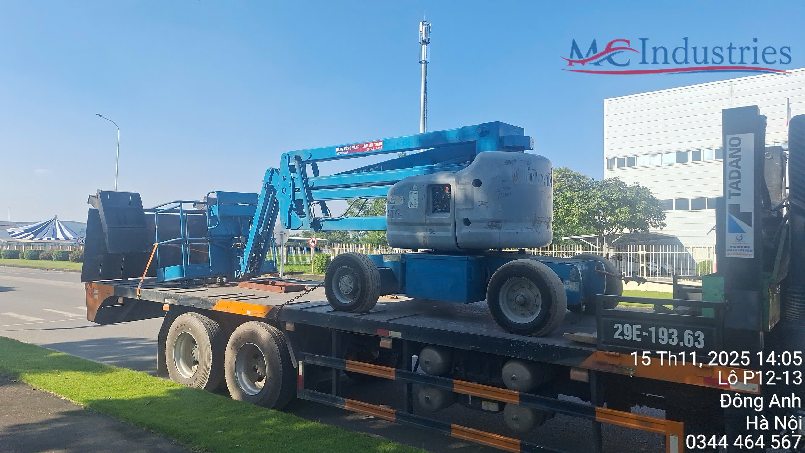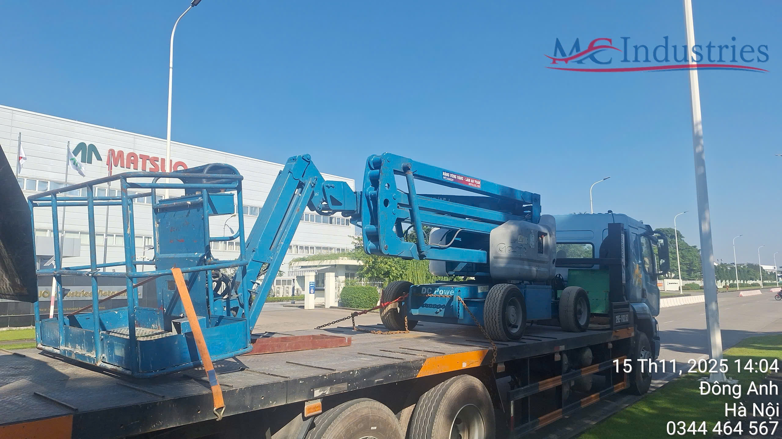 Ngày 15/11/2025 MC Industries cung cấp xe nâng người boom lift 16m phục vụ bảo trì hệ thống cơ điện của nhà máy.