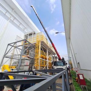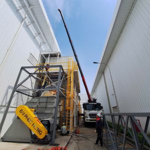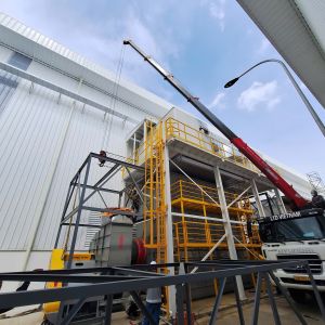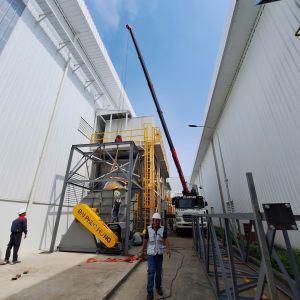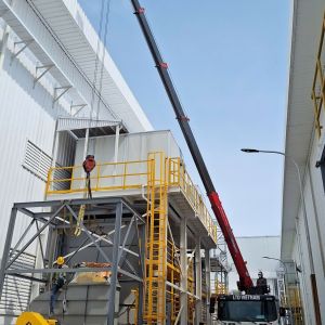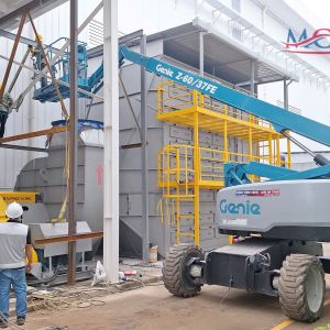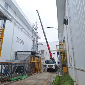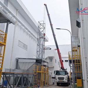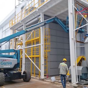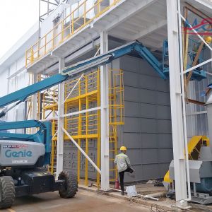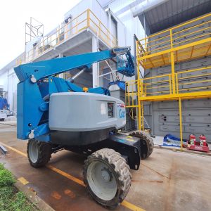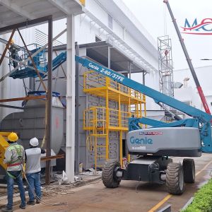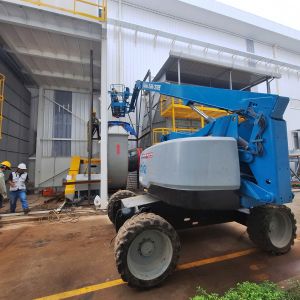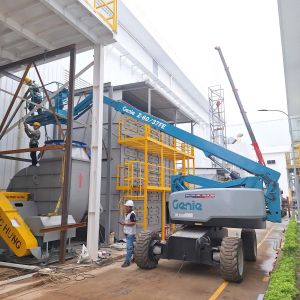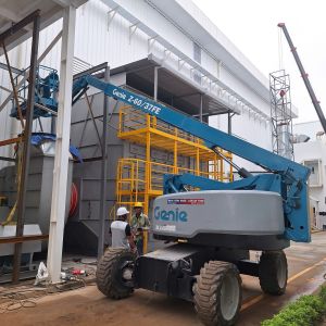Xe nâng người 20m boom lift dùng để nâng hạ người lắp đặt hệ thống khung kết cấu dựng ống gió vào nhà máy. Xe nâng người và cẩu thùng cùng kết hợp để lắp đựng bồn và đường ống từ trên mái nhà xưởng xuống dưới nền nhà máy.