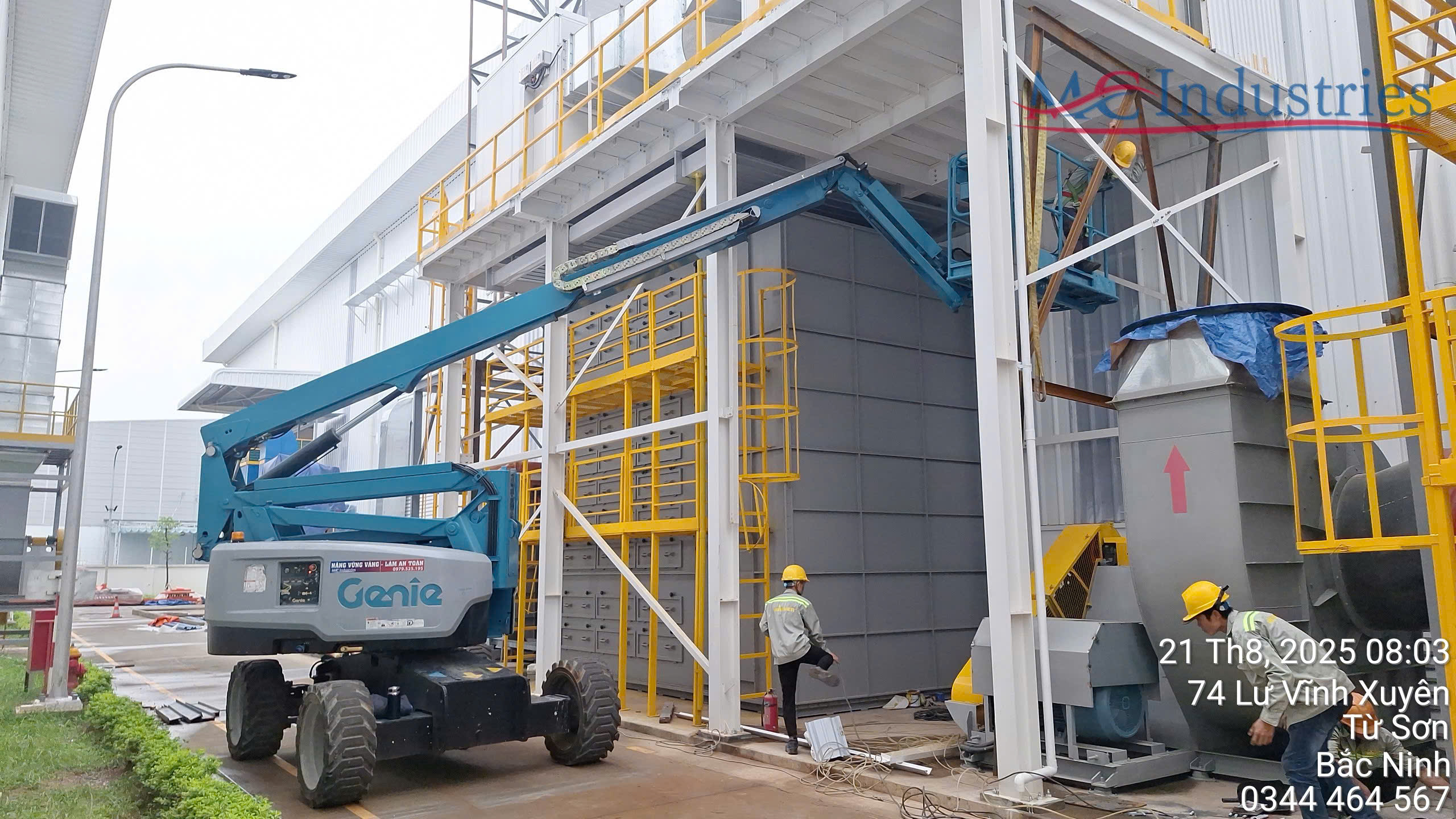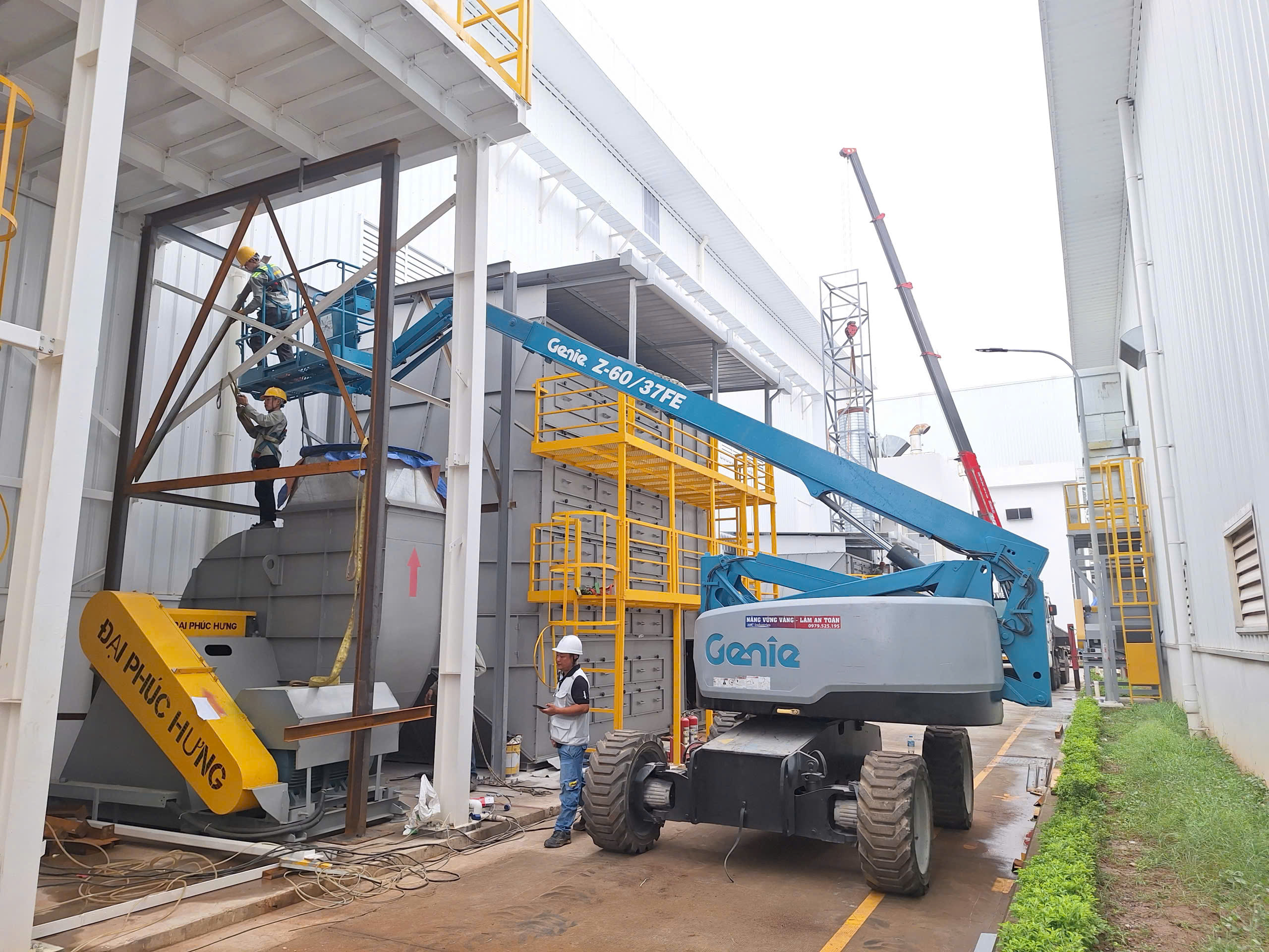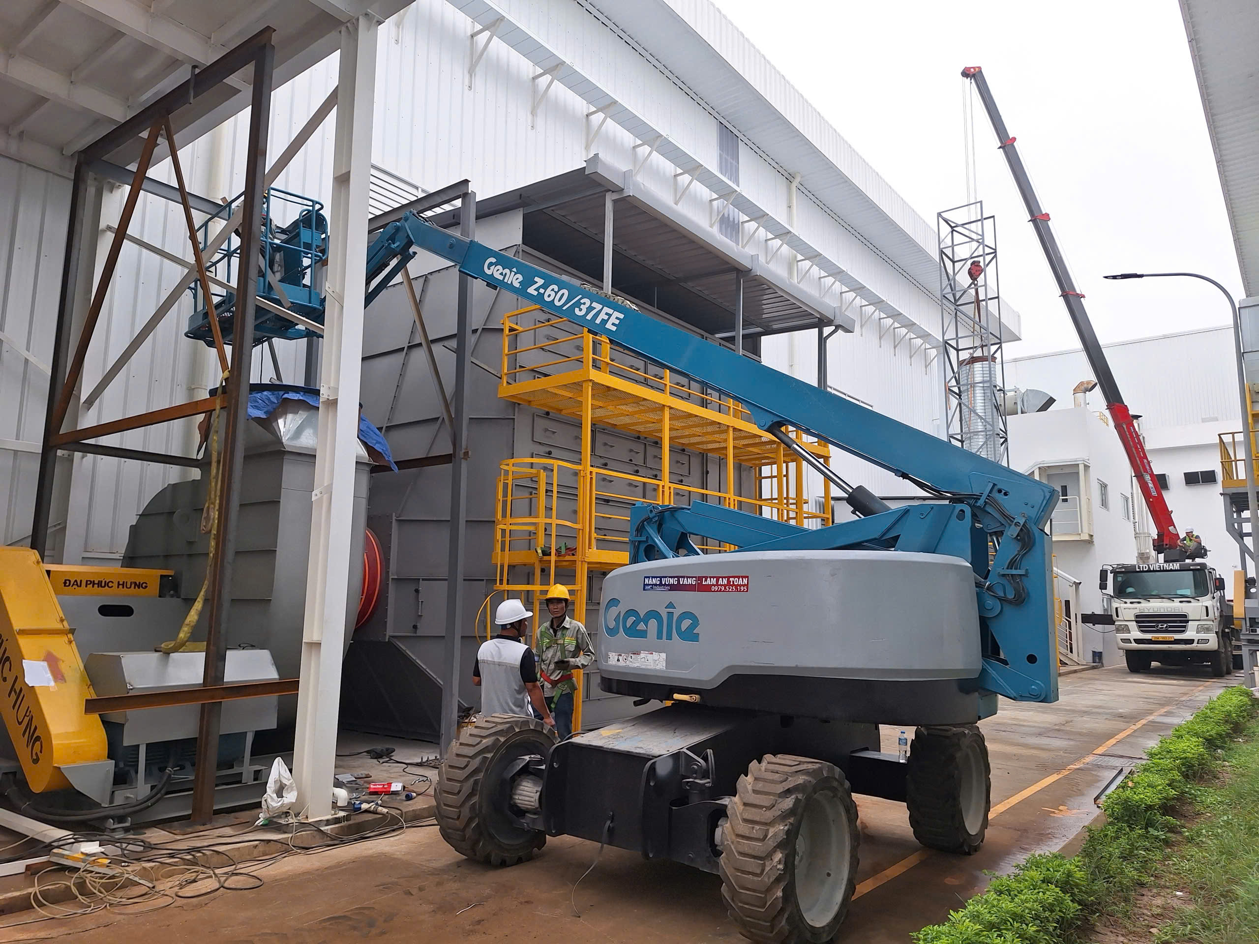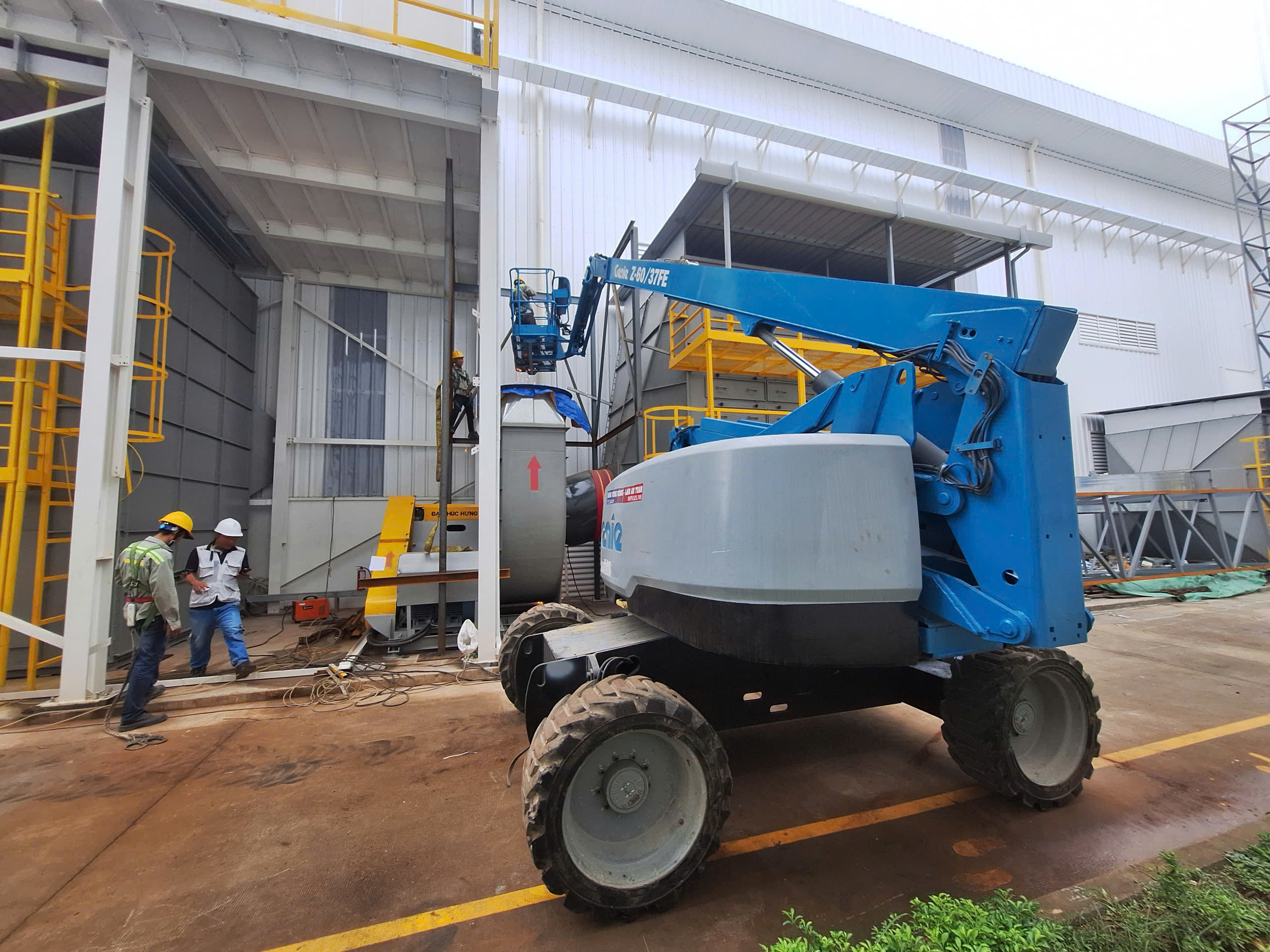 Xe nâng người 20m boom lift dùng để nâng hạ người lắp đặt hệ thống khung kết cấu dựng ống gió vào nhà máy. Xe nâng người và cẩu thùng cùng kết hợp để lắp đựng bồn và đường ống từ trên mái nhà xưởng xuống dưới nền nhà máy.