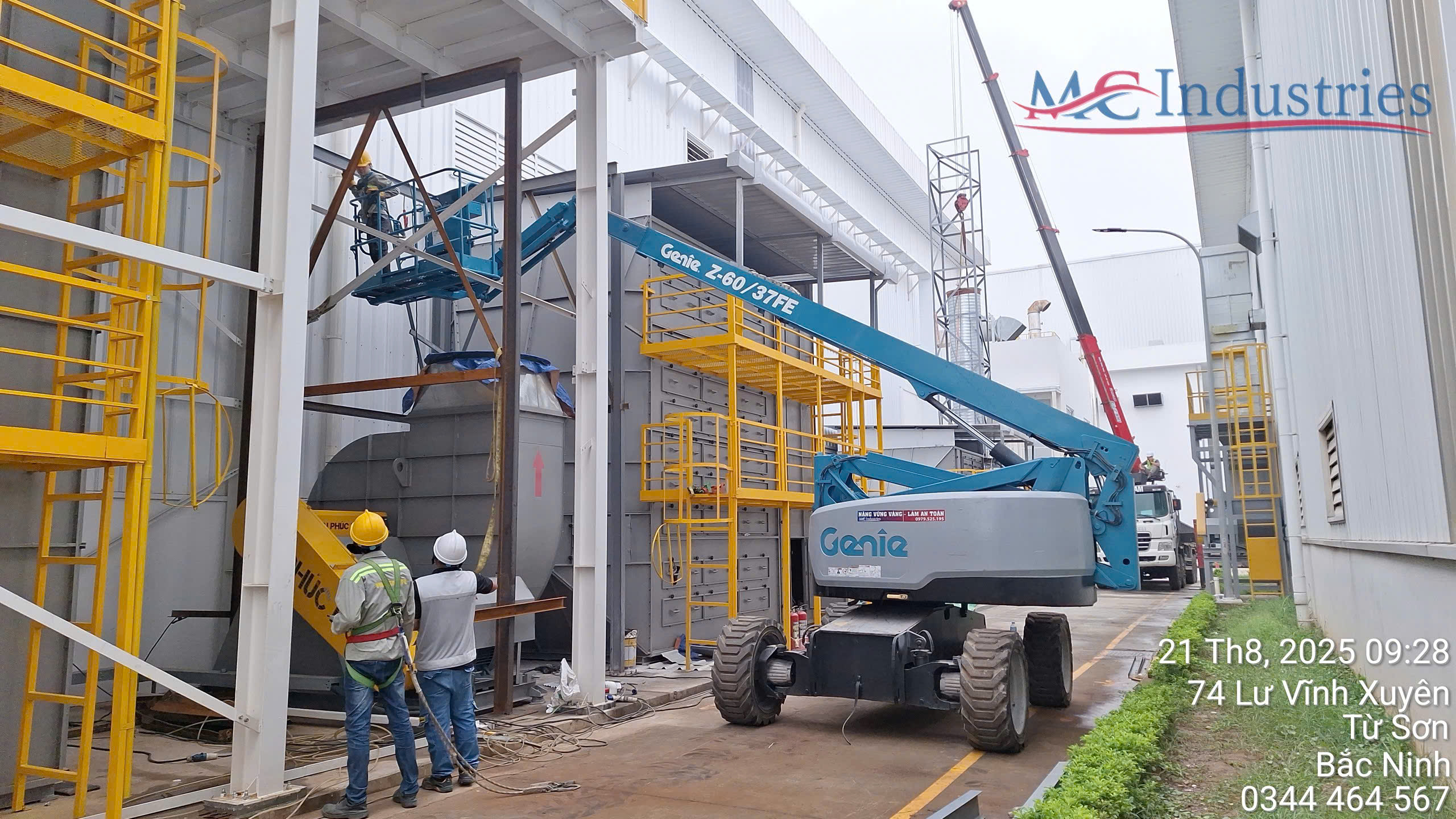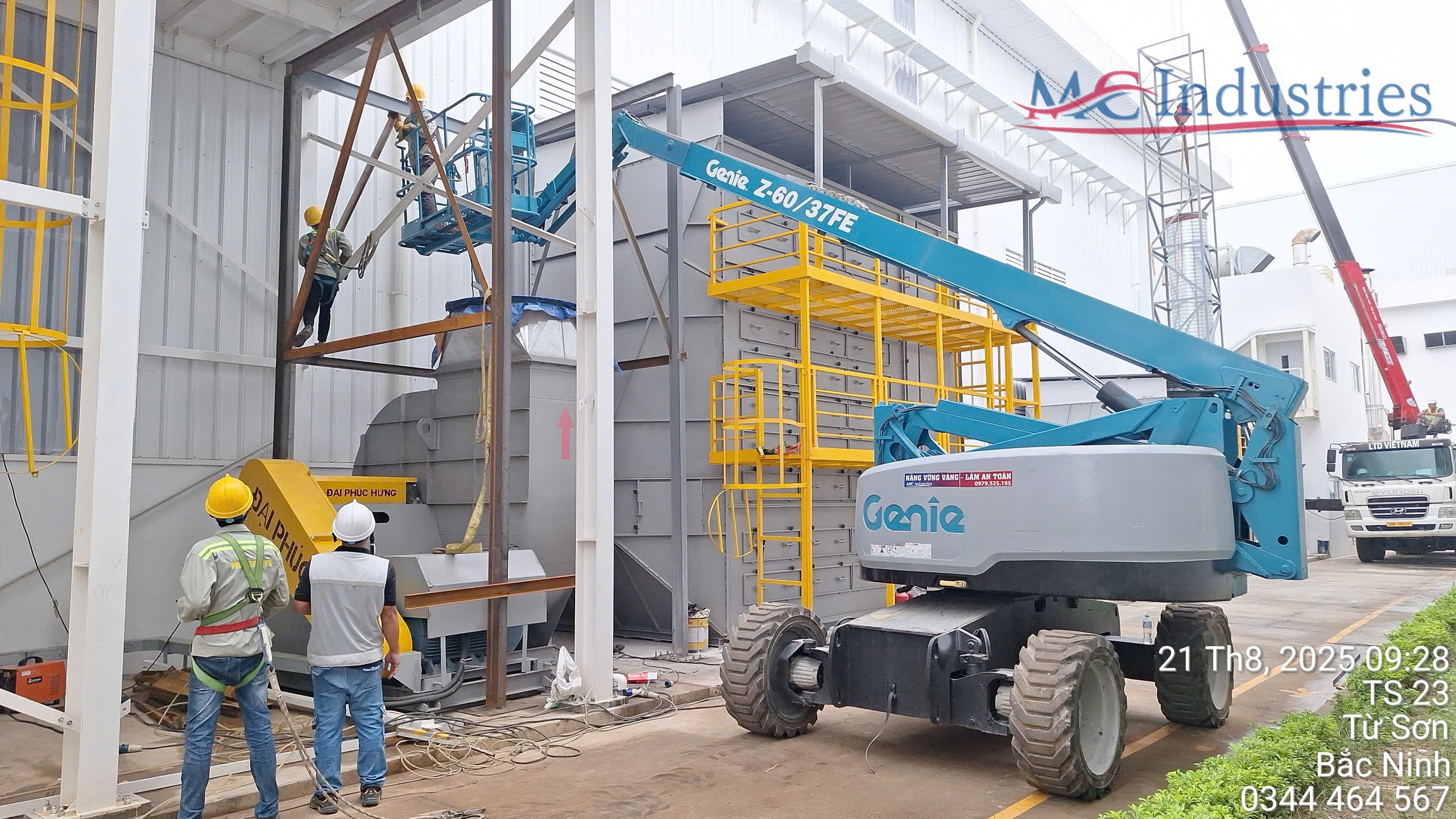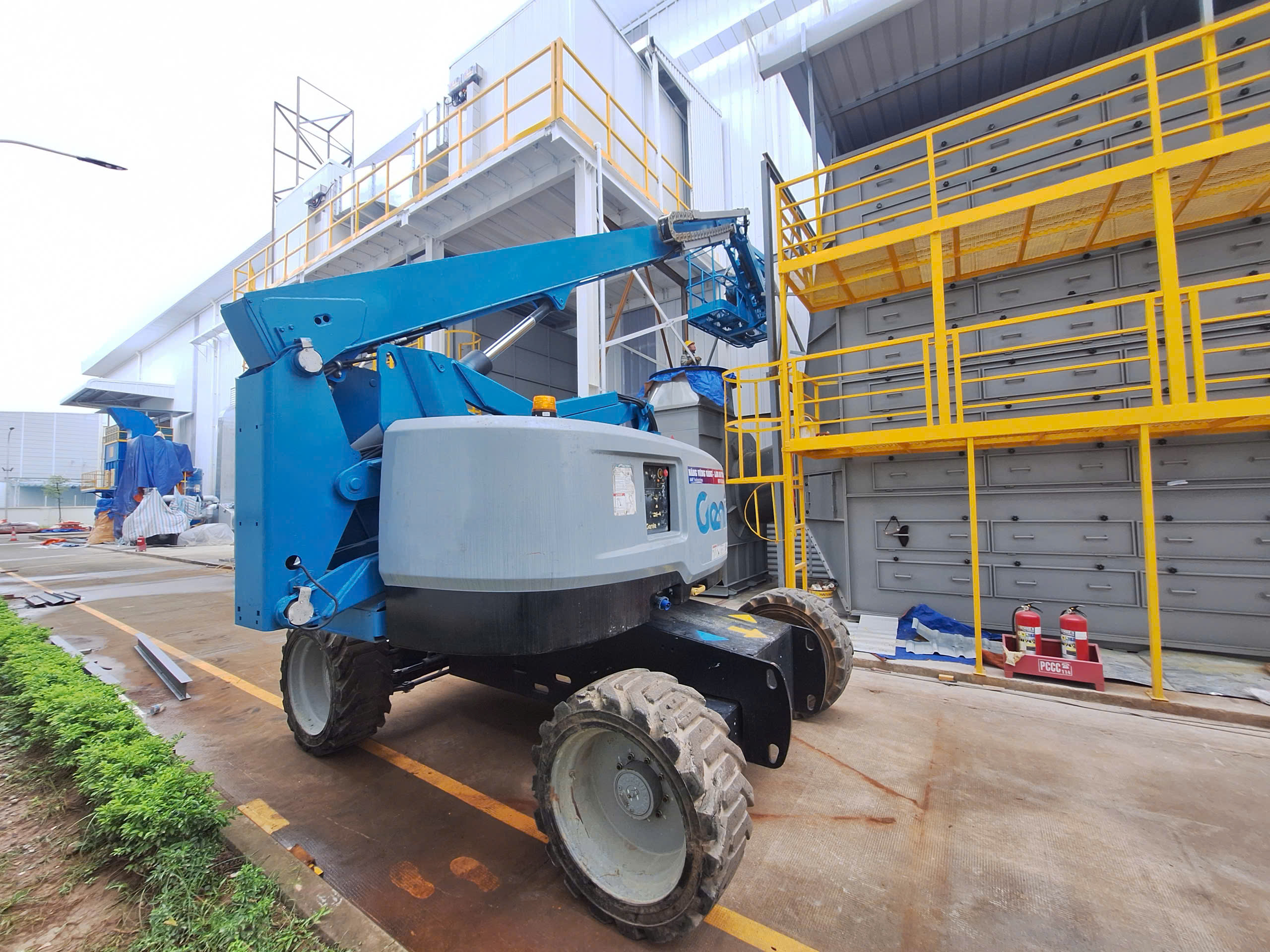 Xe nâng người 20m boom lift dùng để nâng hạ người lắp đặt hệ thống khung kết cấu dựng ống gió vào nhà máy. Xe nâng người và cẩu thùng cùng kết hợp để lắp đựng bồn và đường ống từ trên mái nhà xưởng xuống dưới nền nhà máy.