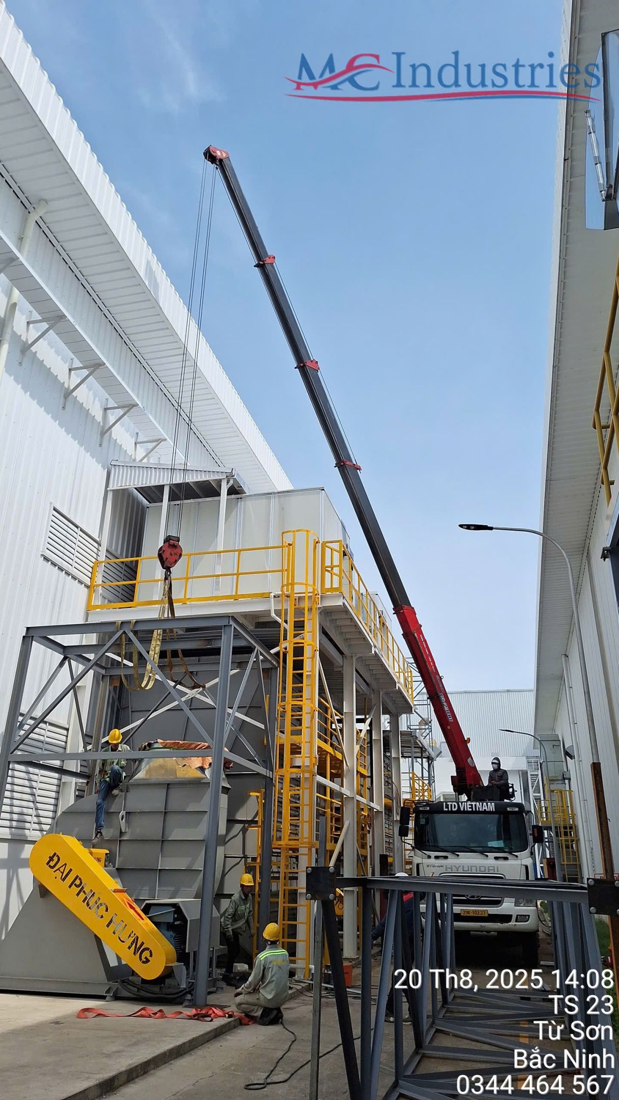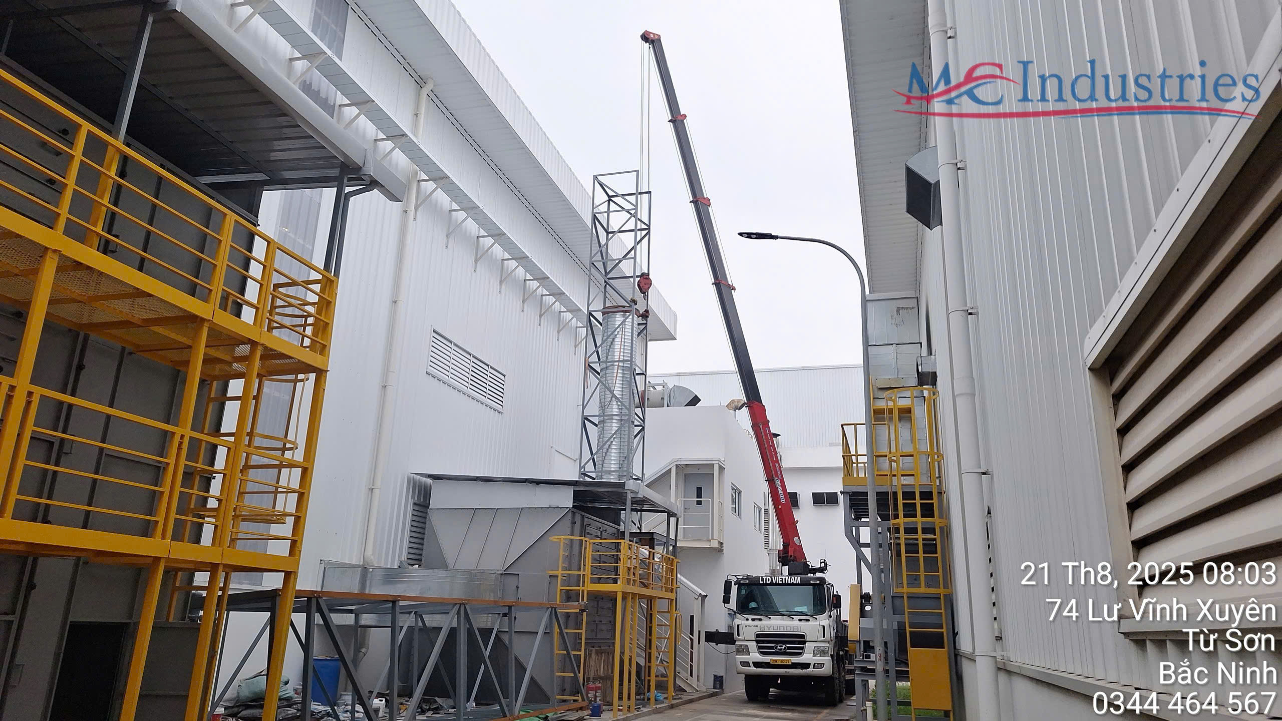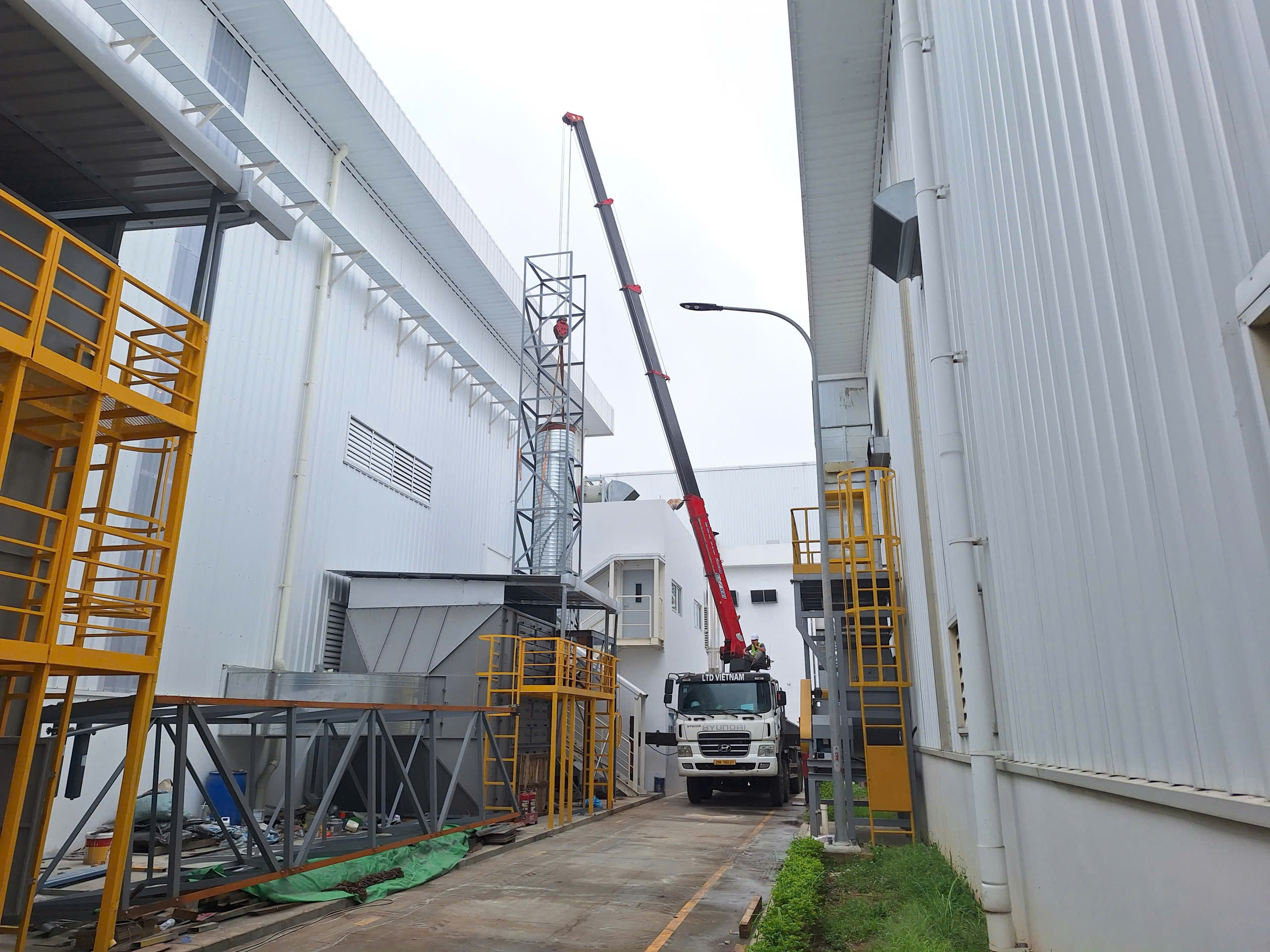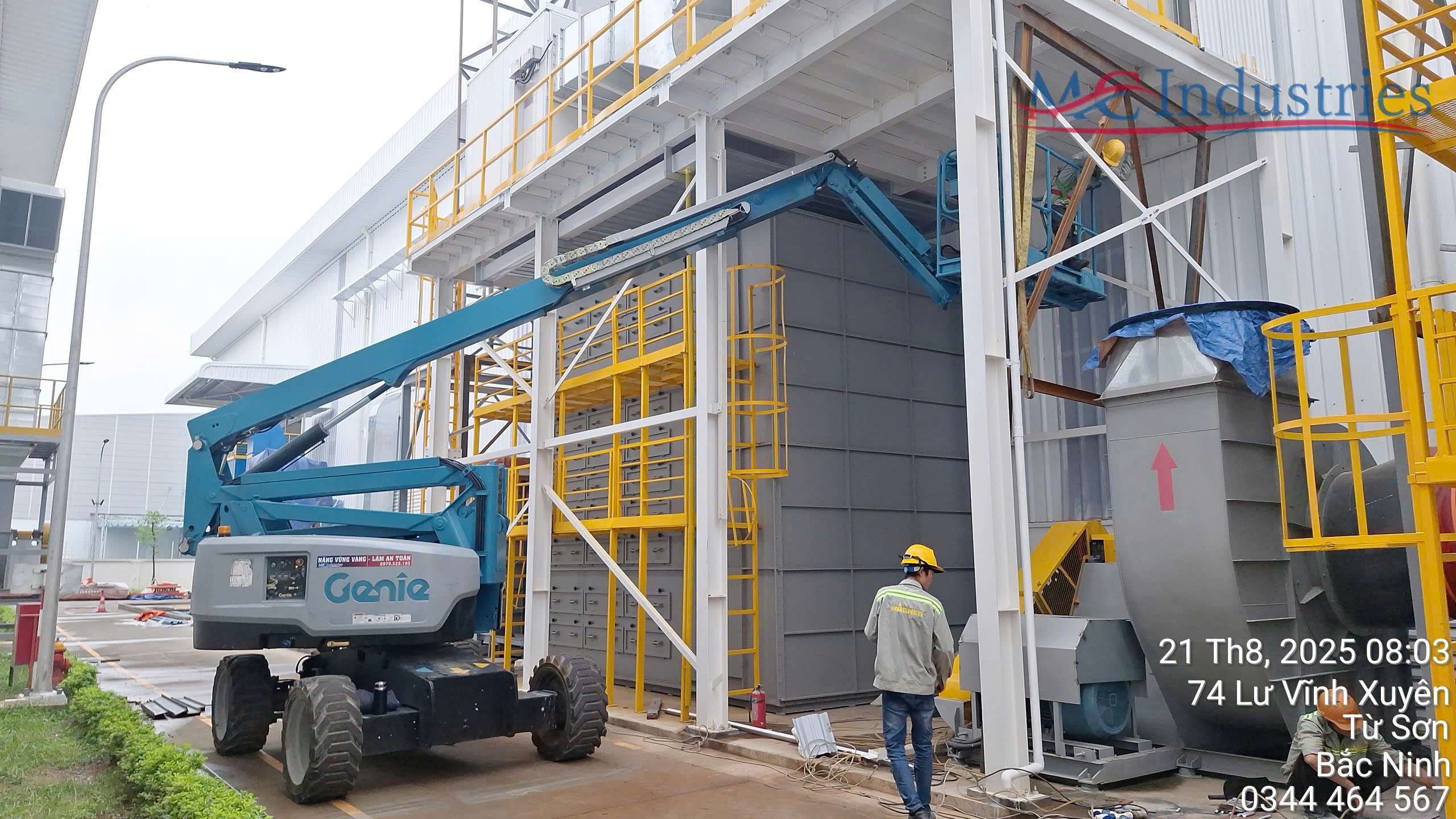 Xe nâng người 20m boom lift dùng để nâng hạ người lắp đặt hệ thống khung kết cấu dựng ống gió vào nhà máy. Xe nâng người và cẩu thùng cùng kết hợp để lắp đựng bồn và đường ống từ trên mái nhà xưởng xuống dưới nền nhà máy.