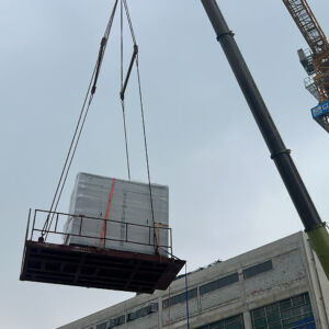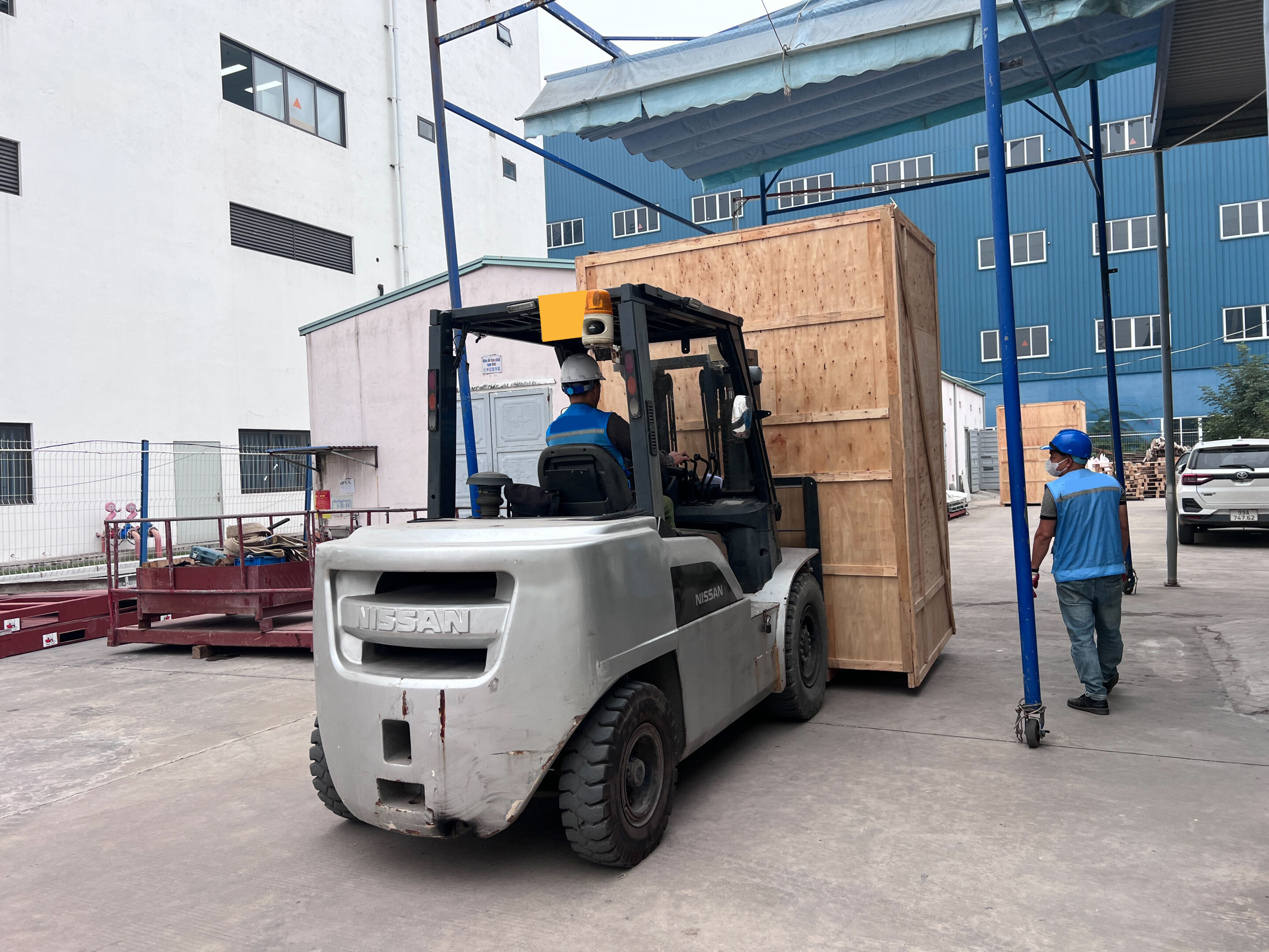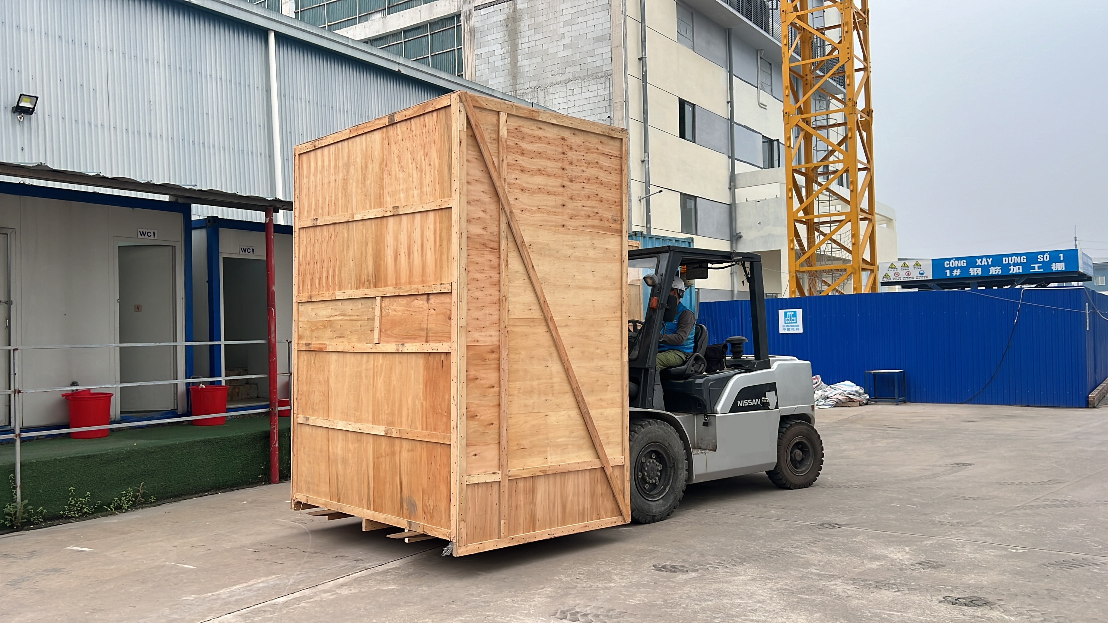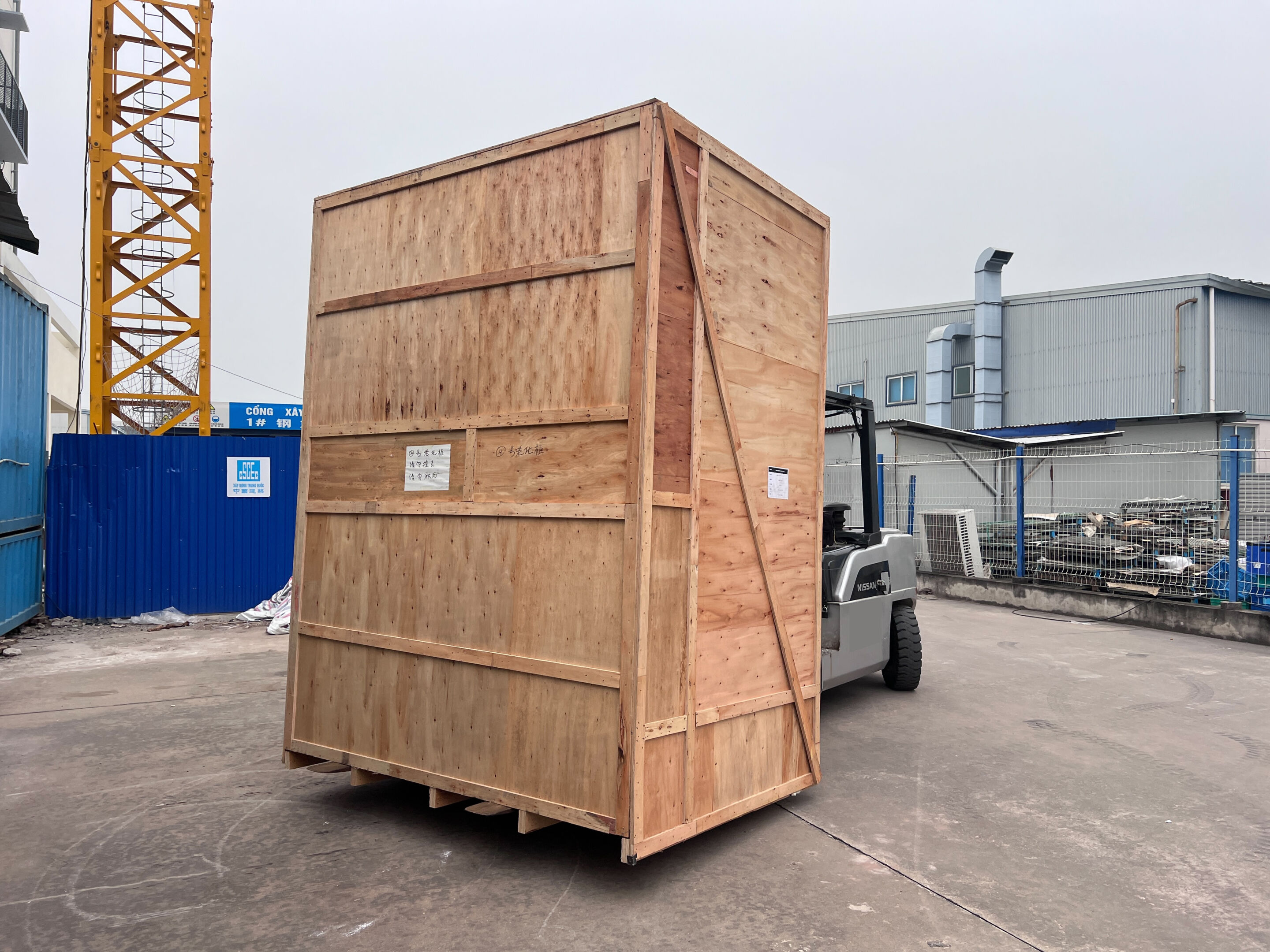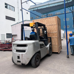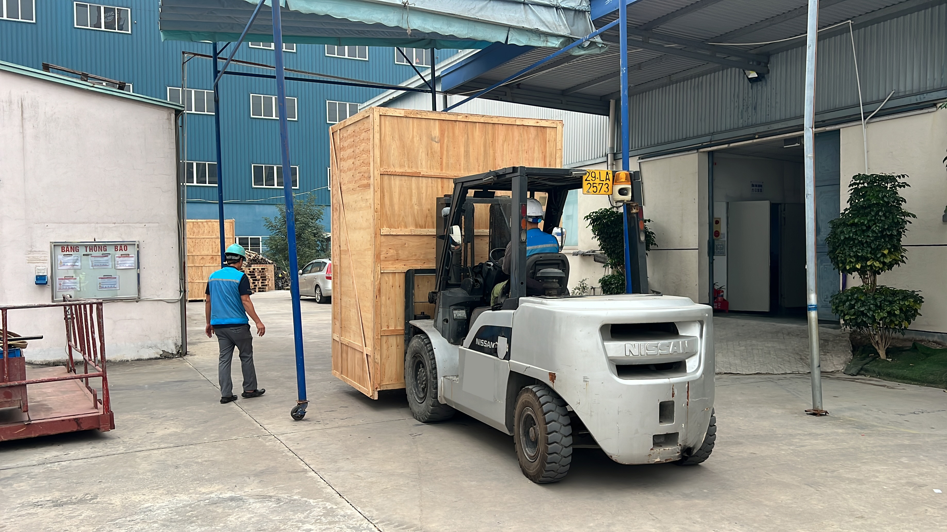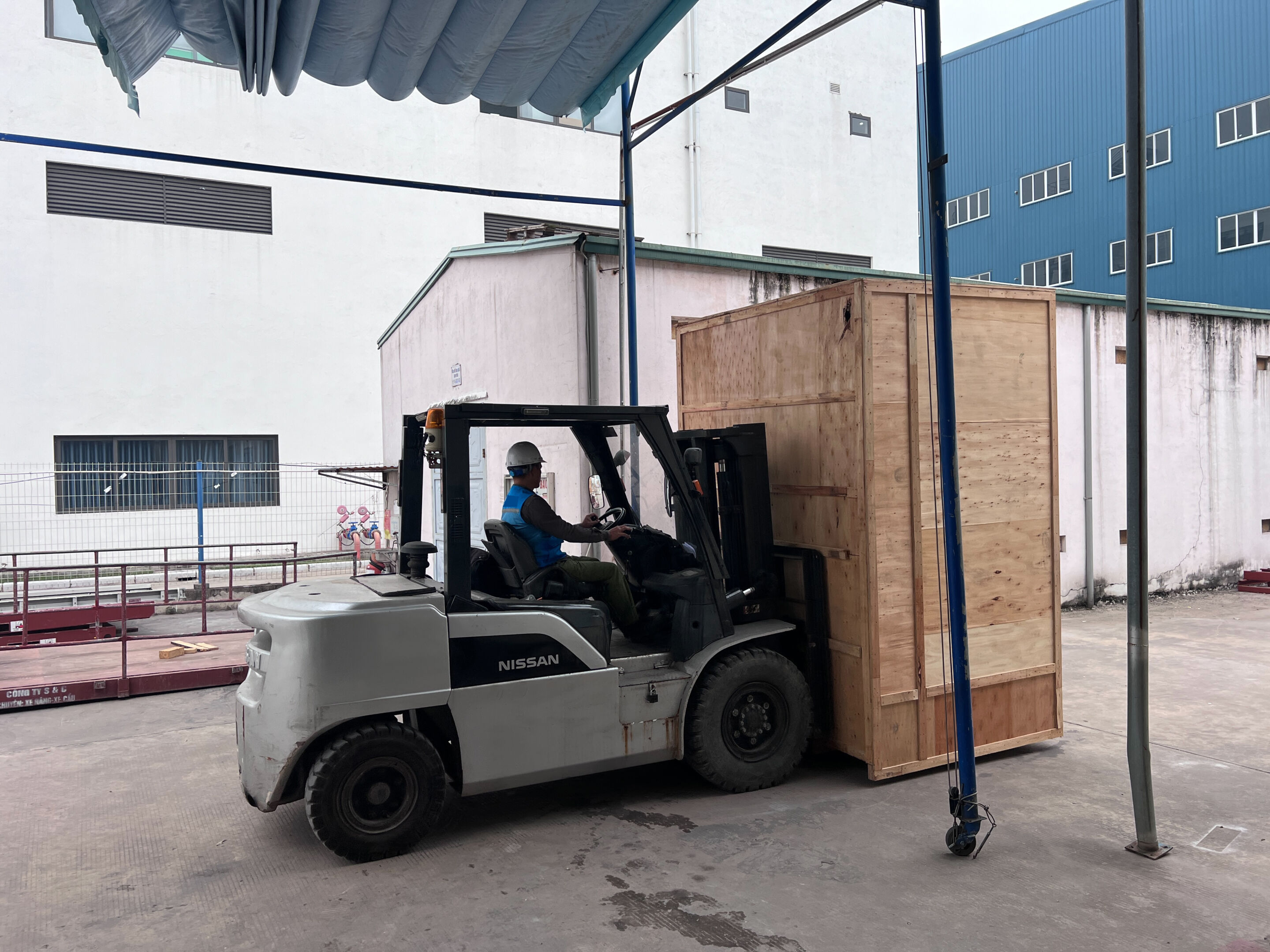 Xe nâng hàng 6 tấn sử dụng để nâng hạ hàng hóa được đặt dưới đất lên trên sàn nâng. Sàn nâng được cẩu cẩu lên trên tầng 2 của nhà máy . Vì tiết bị nặng lớn nên thang máy của nhà máy không thể sử dụng được. Vì vậy cần sàn nâng để đưa hàng vào cả dùng cẩu để đưa hàng hóa lên trên tầng 2.
