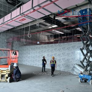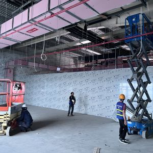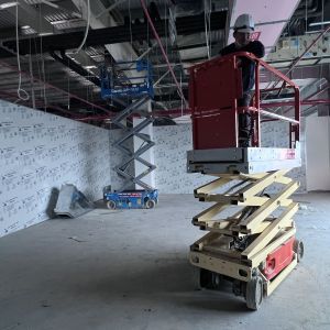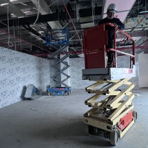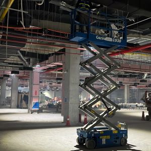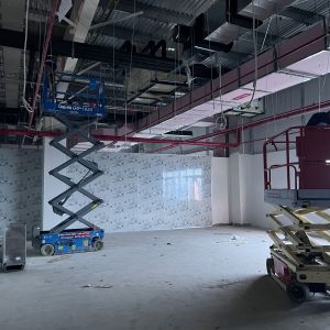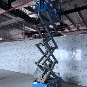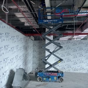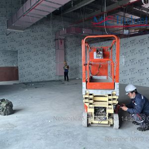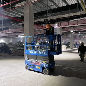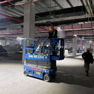Khách hàng dùng xe nâng người cắt kéo 8m điện để phục vụ nâng hạ và lắp đặt hệ thống đường ống PCCC, lắp đặt hệ thống đèn điện, hệ thống thông gió, hệ thống làm mát trong tòa nhà.