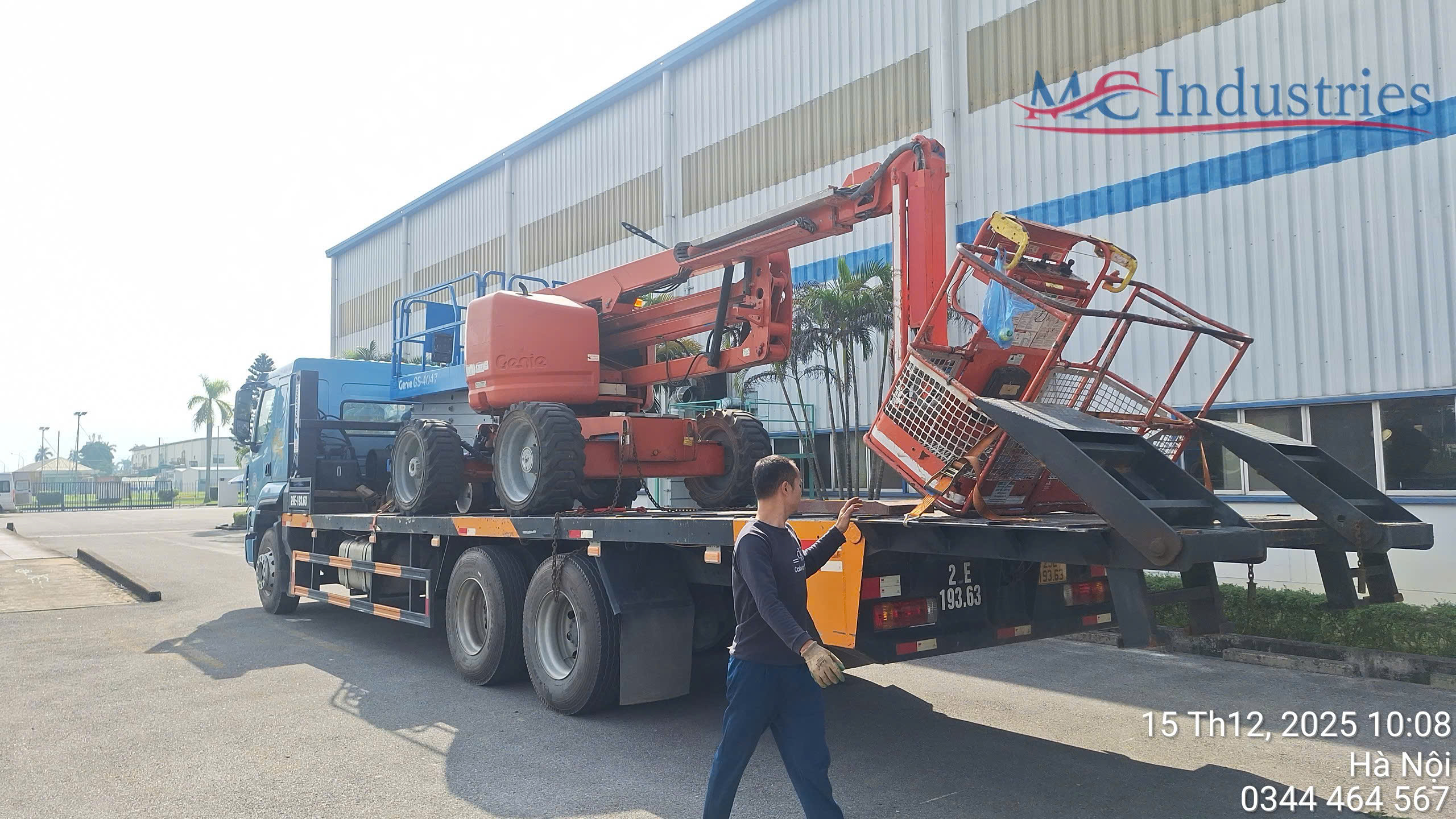 Ngày 15/12/2025 MC Industries cung cấp cho thuê xe nâng người boom lift 18m và xe nâng người cắt kéo điện 14m phục vụ bảo trì bên trong và bên ngoài nhà máy.