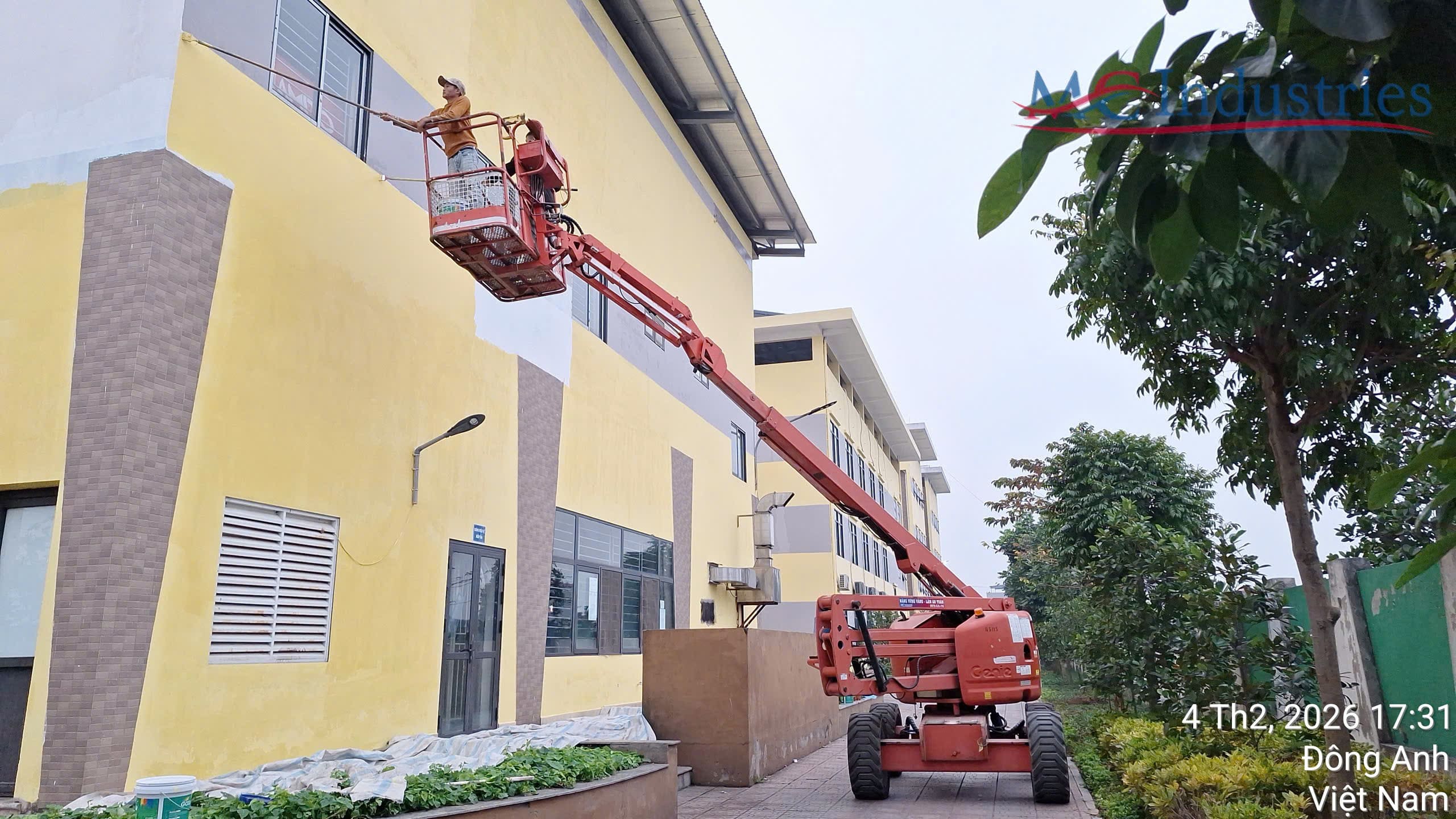 Ngày 4/2/2026 MC Industries cung cấp xe nâng người boom lift 18m có thợ lái để vận hành và thi công sơn trường học tại Đông Anh, Hà Nội.