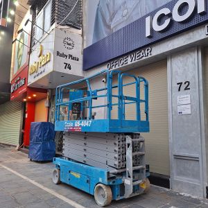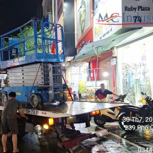 Vì cửa hàng không có vật cản, xe đứng làm việc trên vỉa hè nên đơn vị lựa chọn xe nâng người chạy điện đảm bảo không ảnh hưởng đến việc đi lại của người qua đường. Xe không cần di chuyển nhiều nên sử dụng xe nâng người cắt kéo rất hợp lý về công việc cũng như tiết kiệm chi phí thuê xe đến khách hàng.