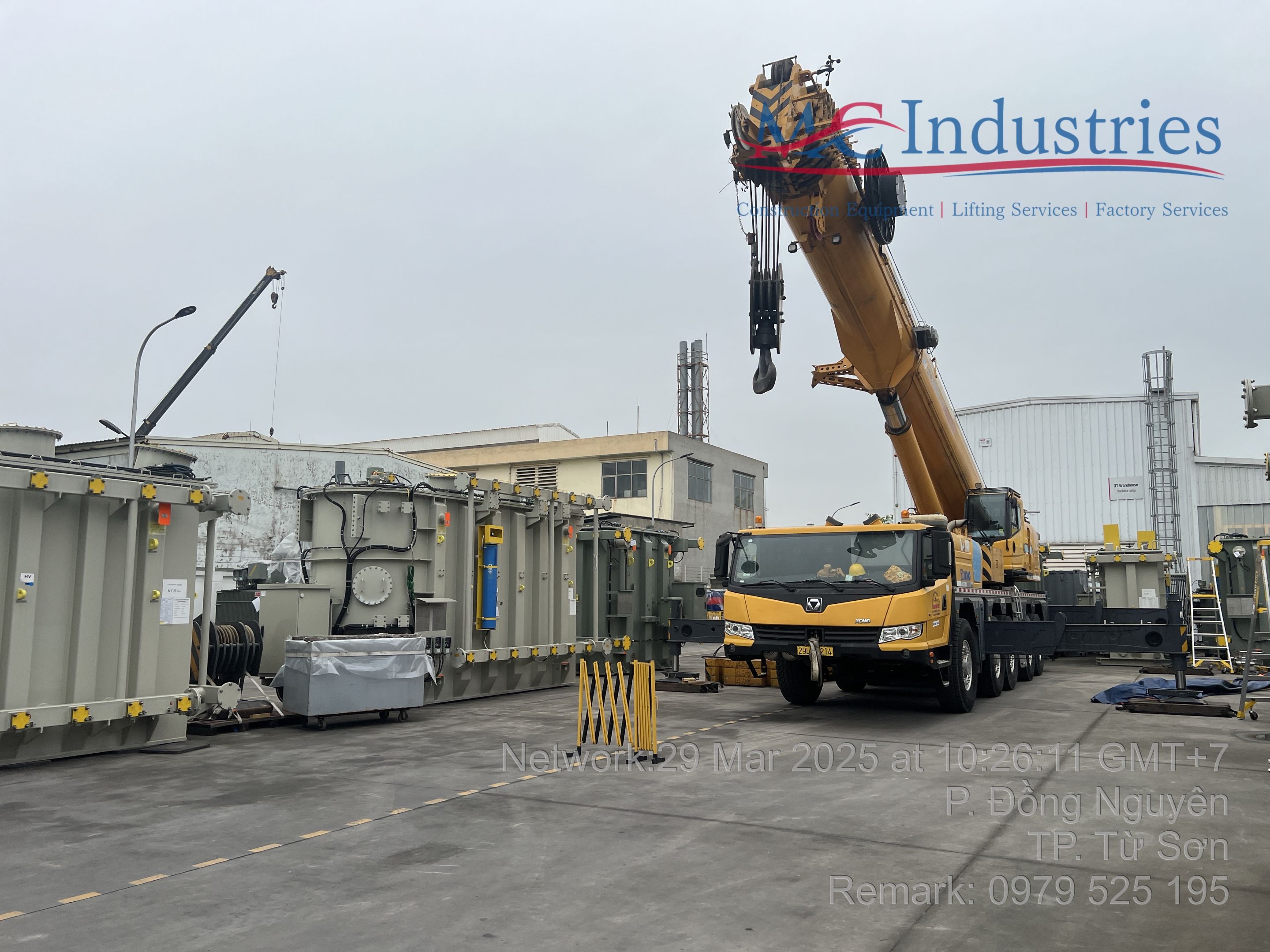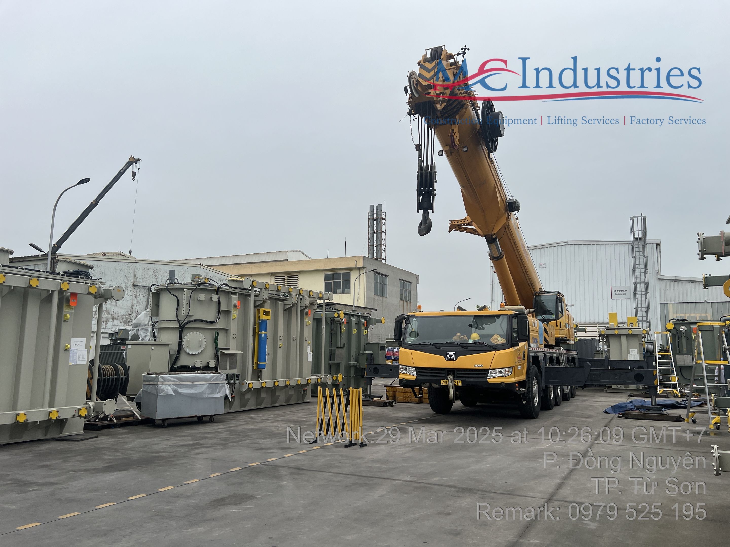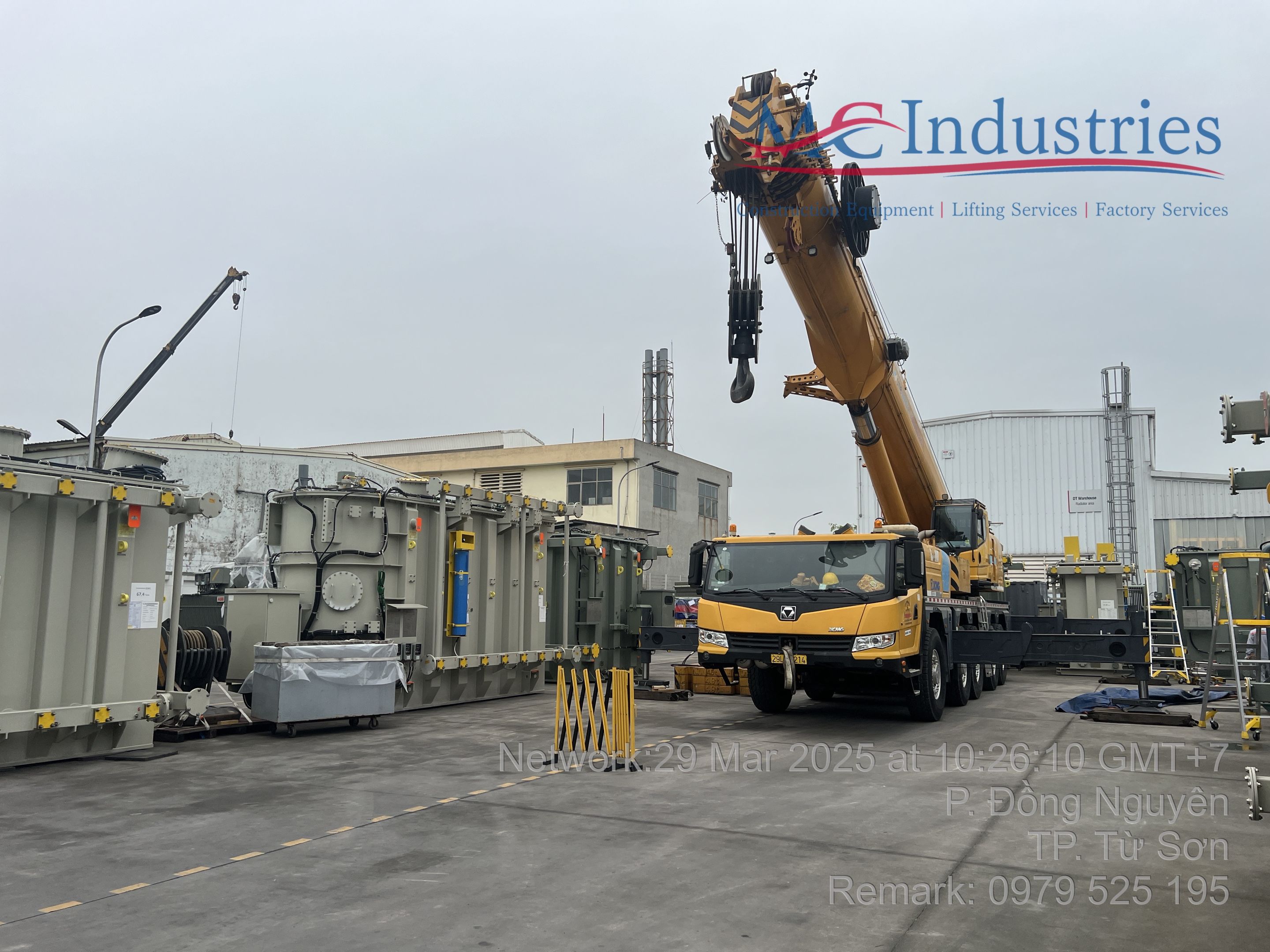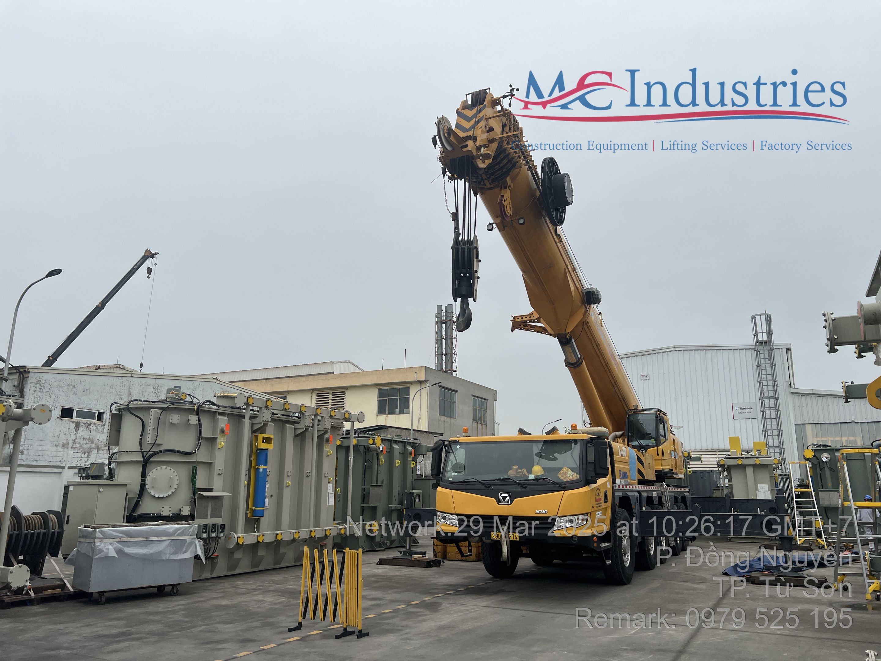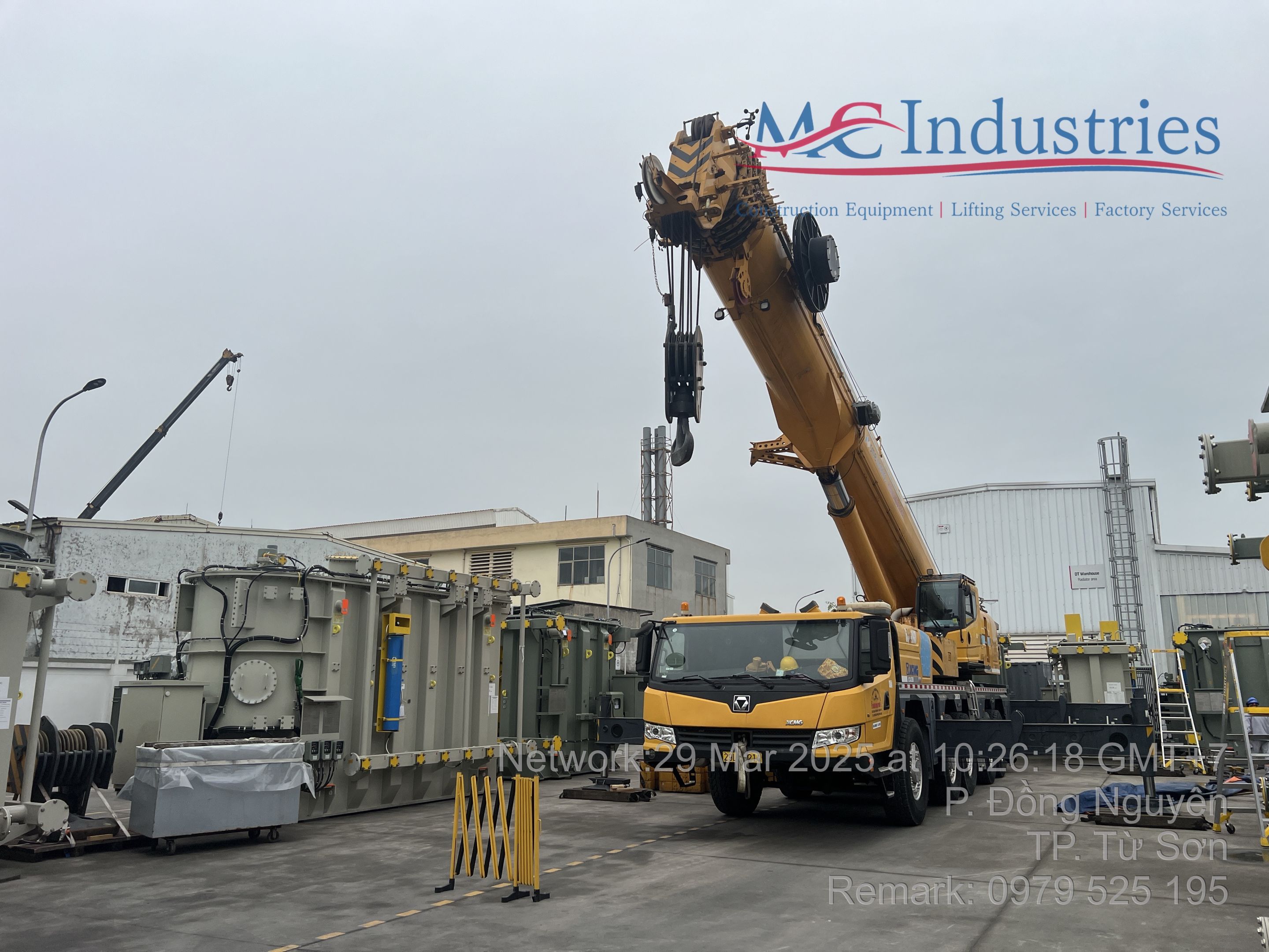 Ngày 29/3/2025 MC Industries cho thuê xe cẩu lốp 100 tấn phục vụ công tác nâng hạ và di chuyển máy biến áp vào trong nhà máy Hitachi.