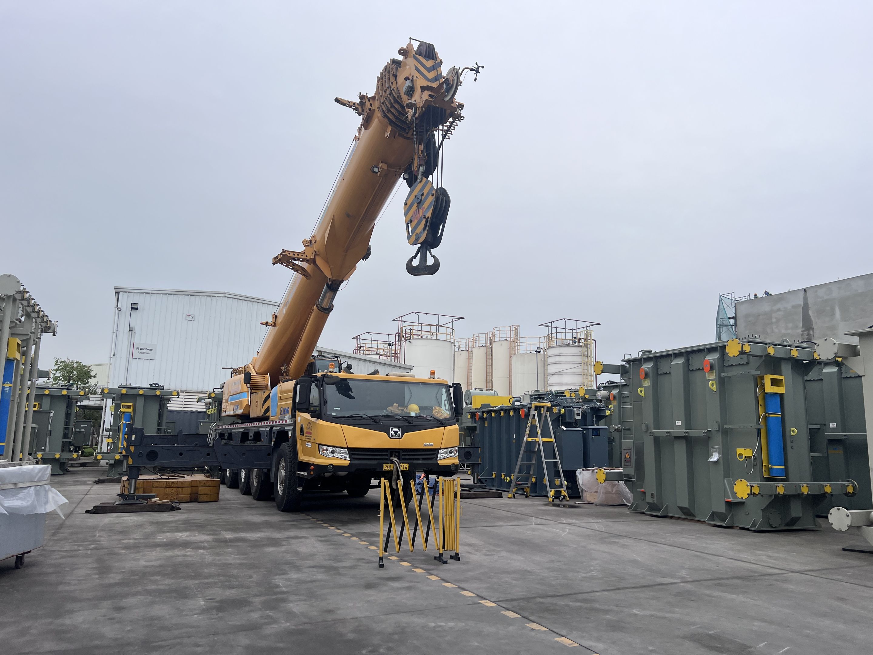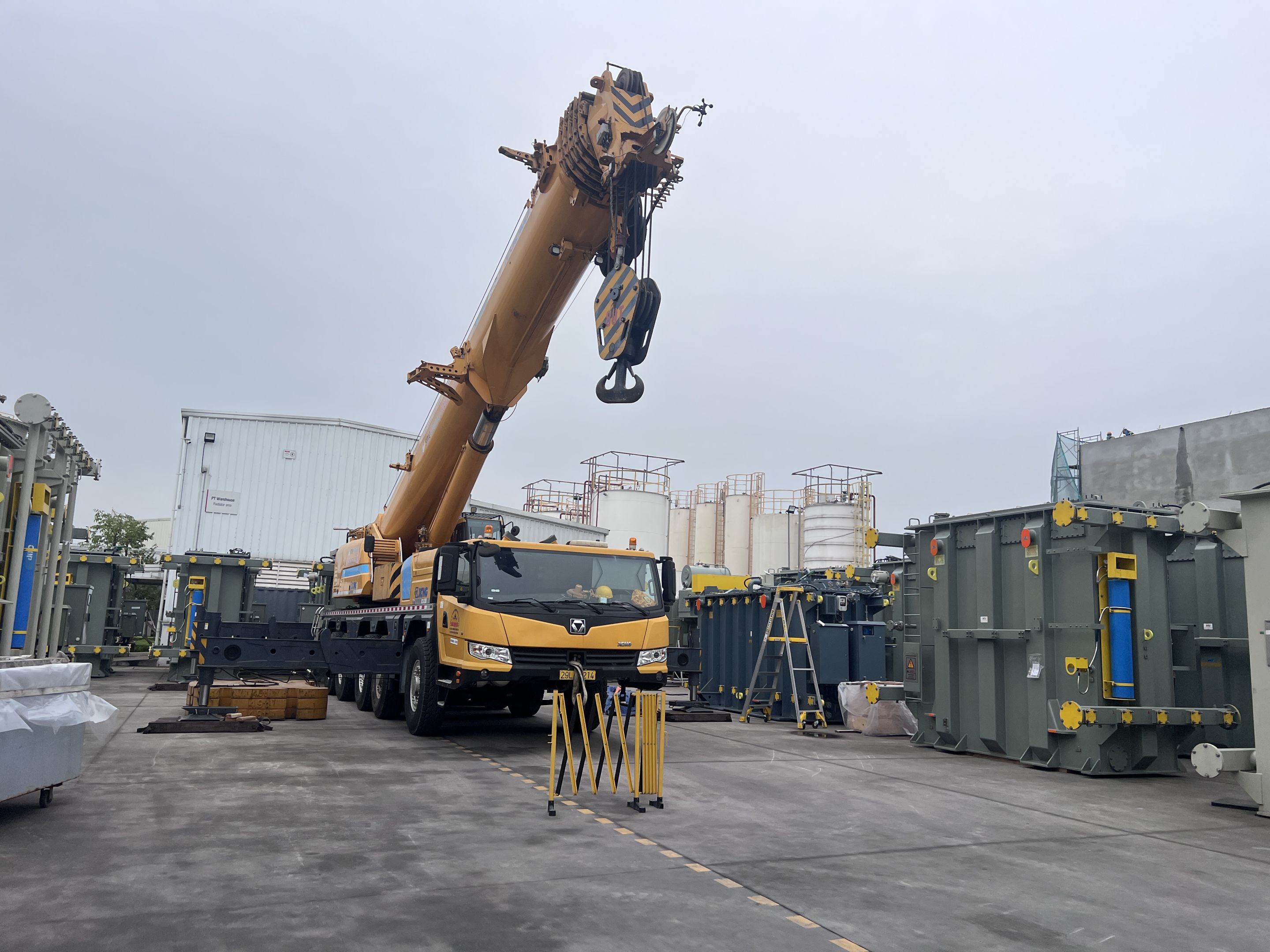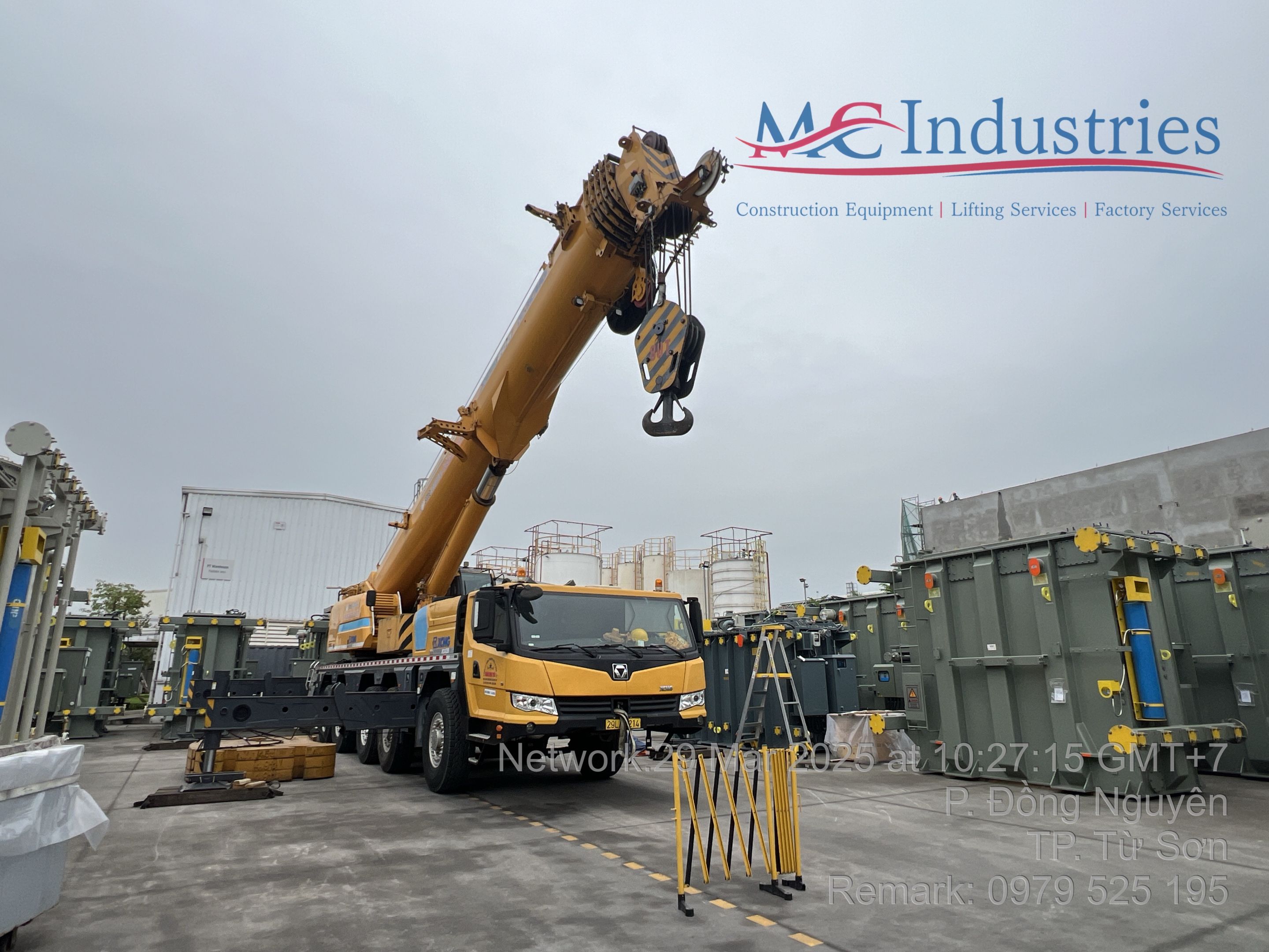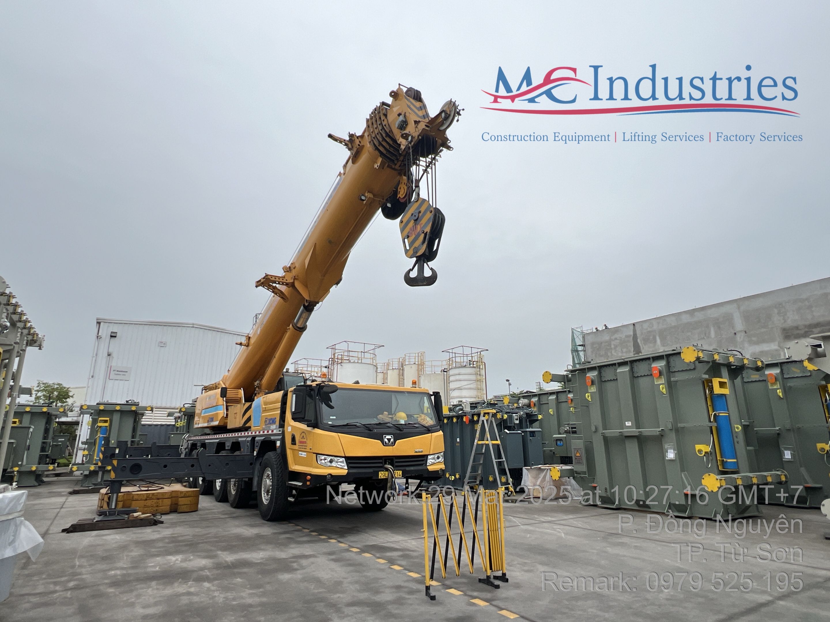 Ngày 29/3/2025 MC Industries cho thuê xe cẩu lốp 100 tấn phục vụ công tác nâng hạ và di chuyển máy biến áp vào trong nhà máy Hitachi.