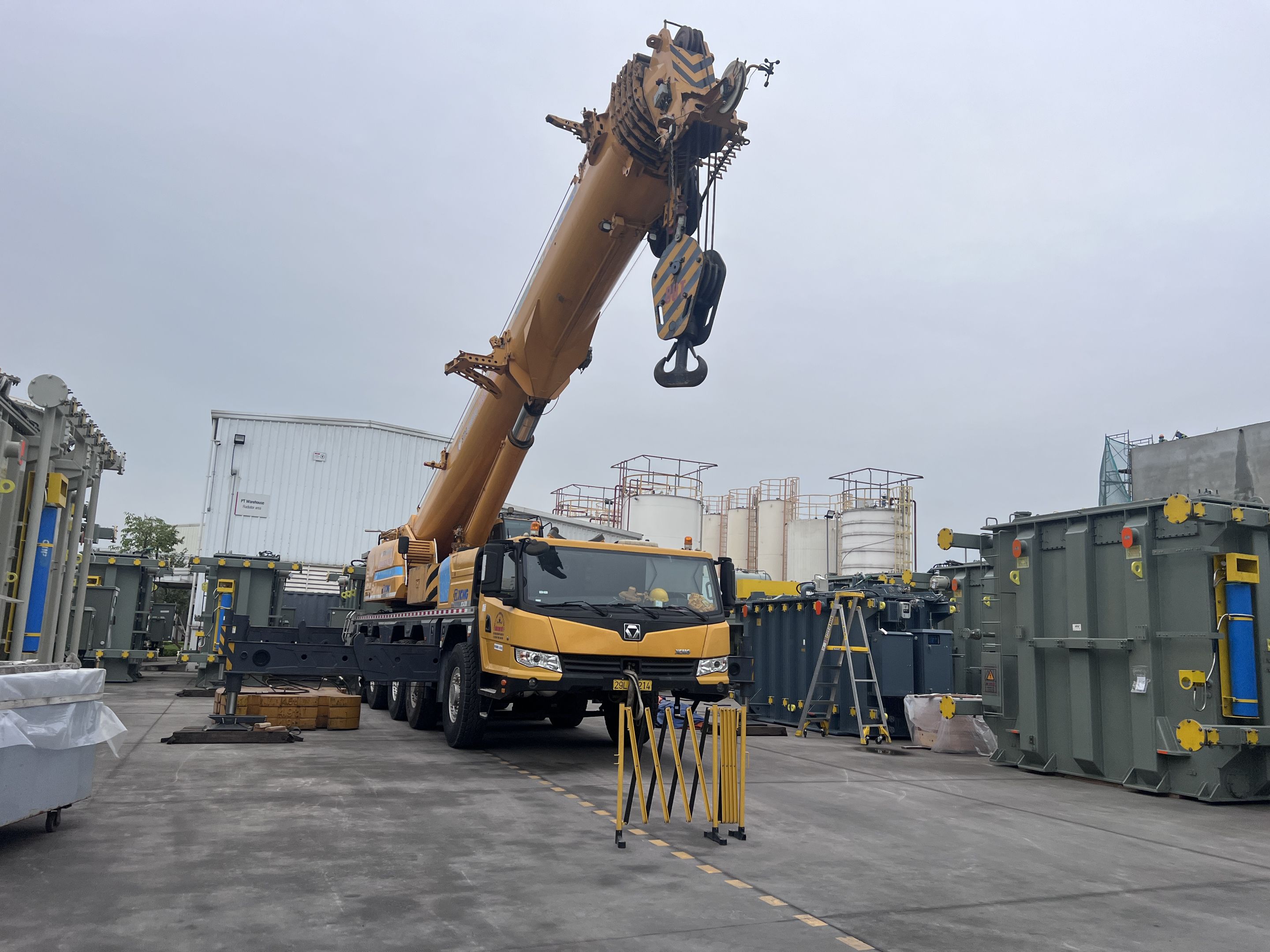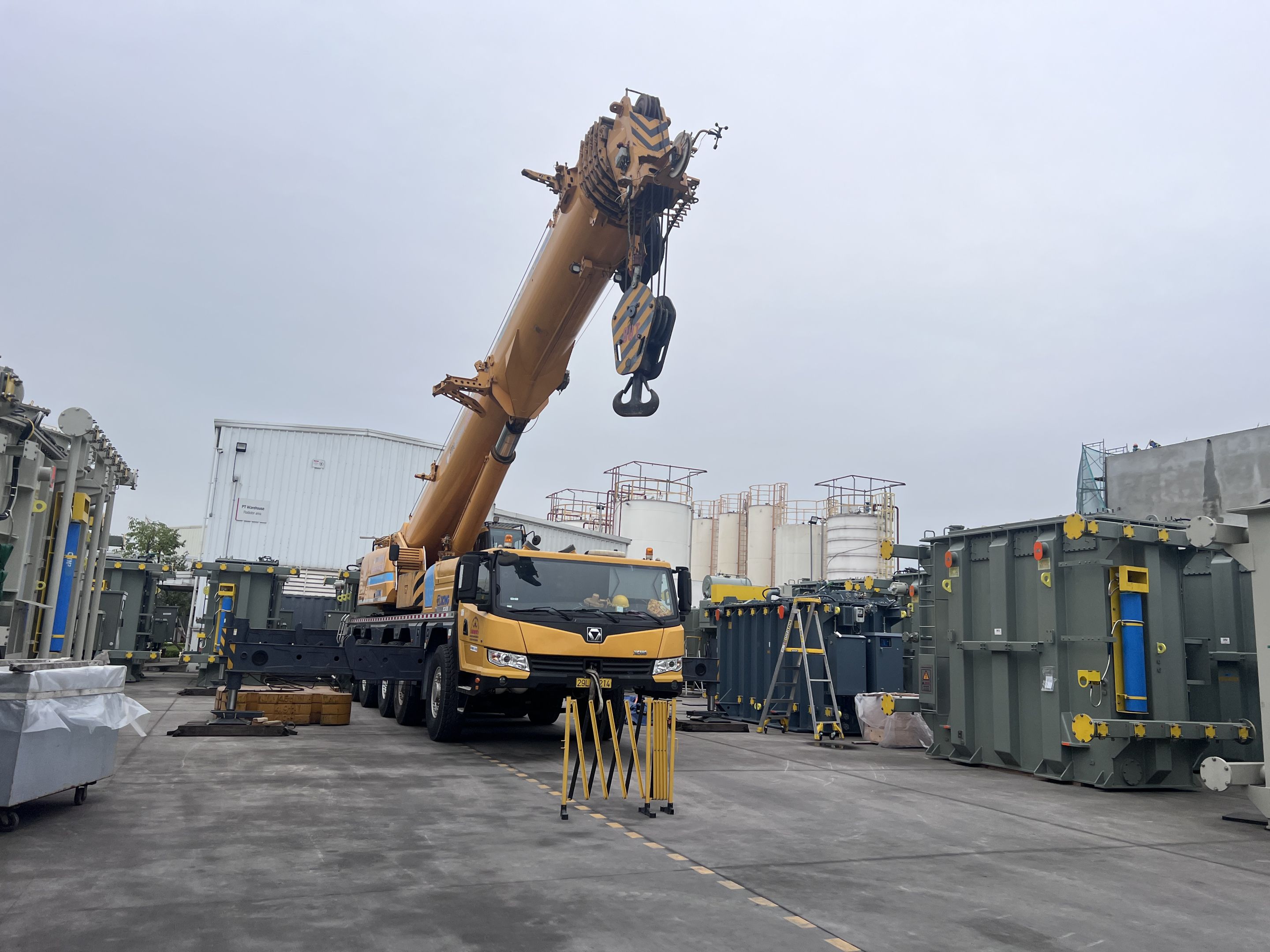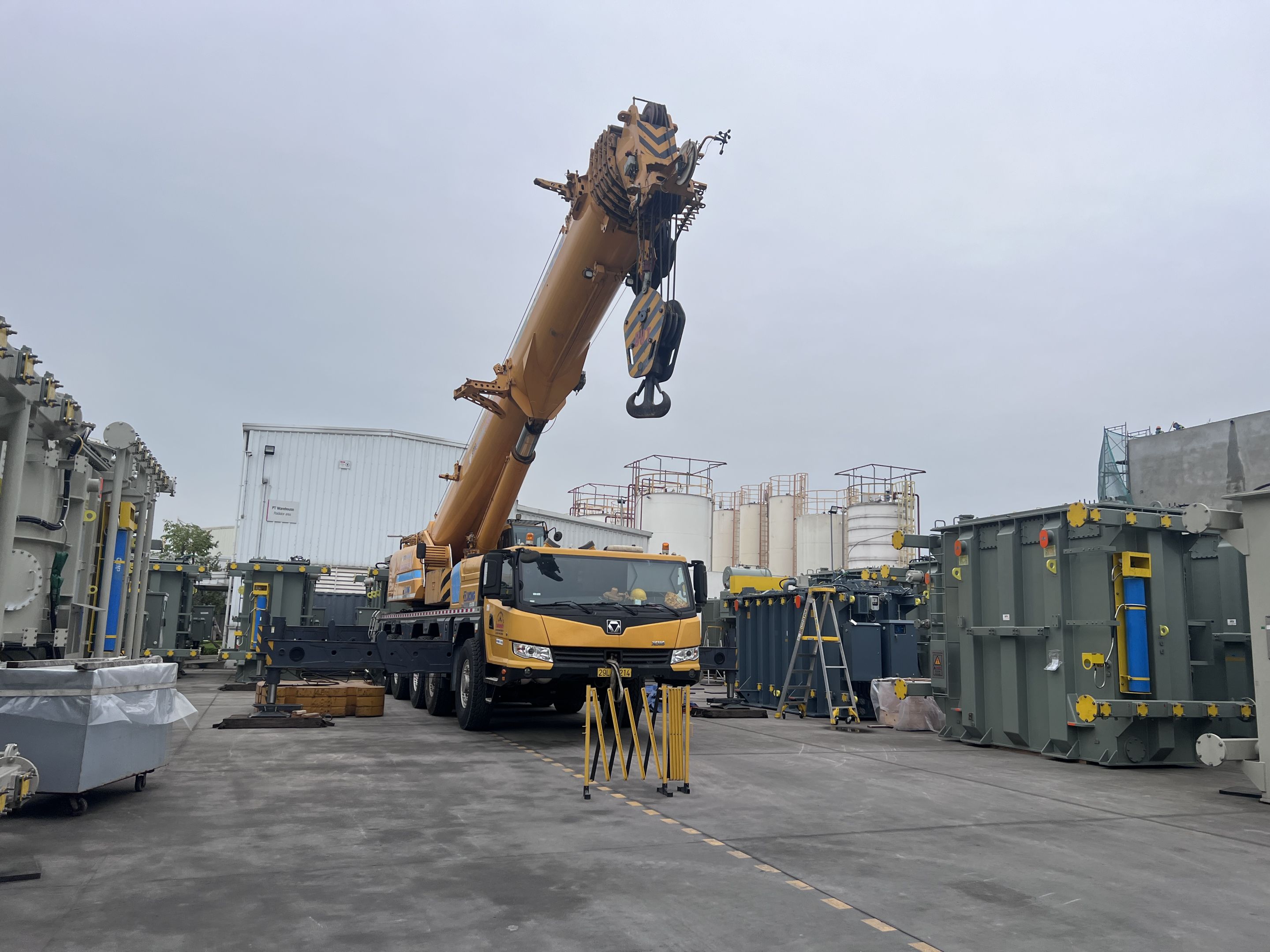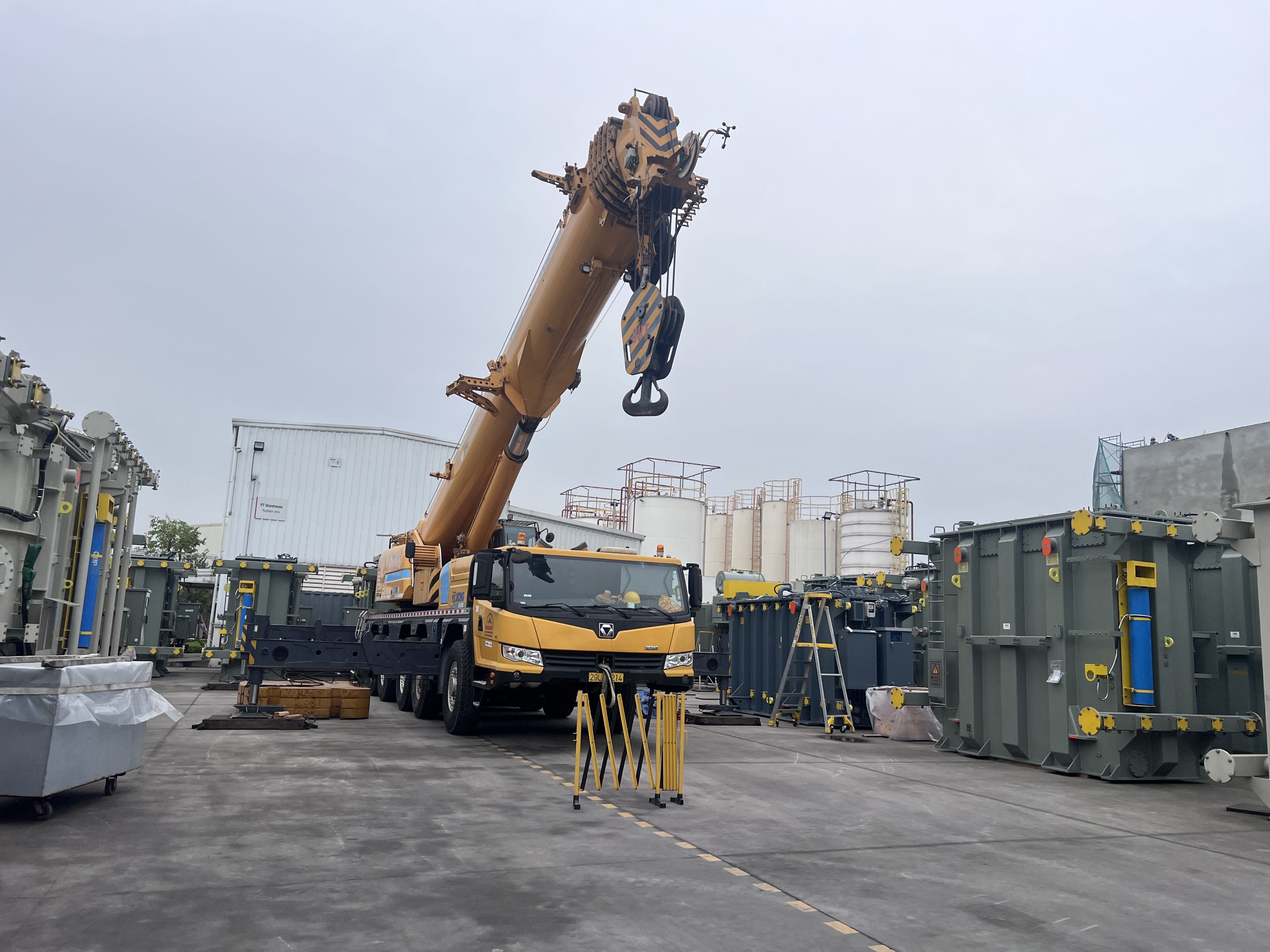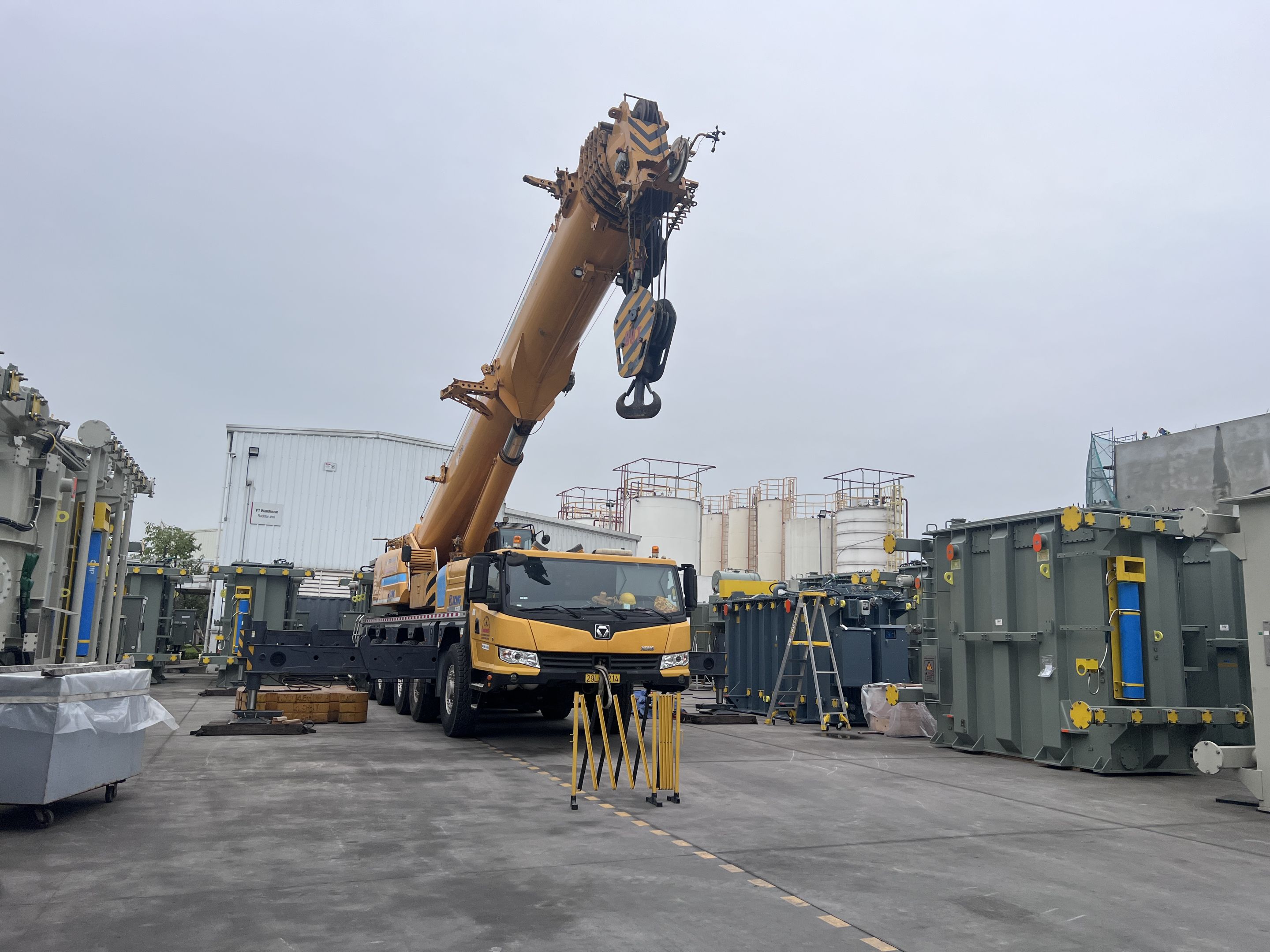 Ngày 29/3/2025 MC Industries cho thuê xe cẩu lốp 100 tấn phục vụ công tác nâng hạ và di chuyển máy biến áp vào trong nhà máy Hitachi.