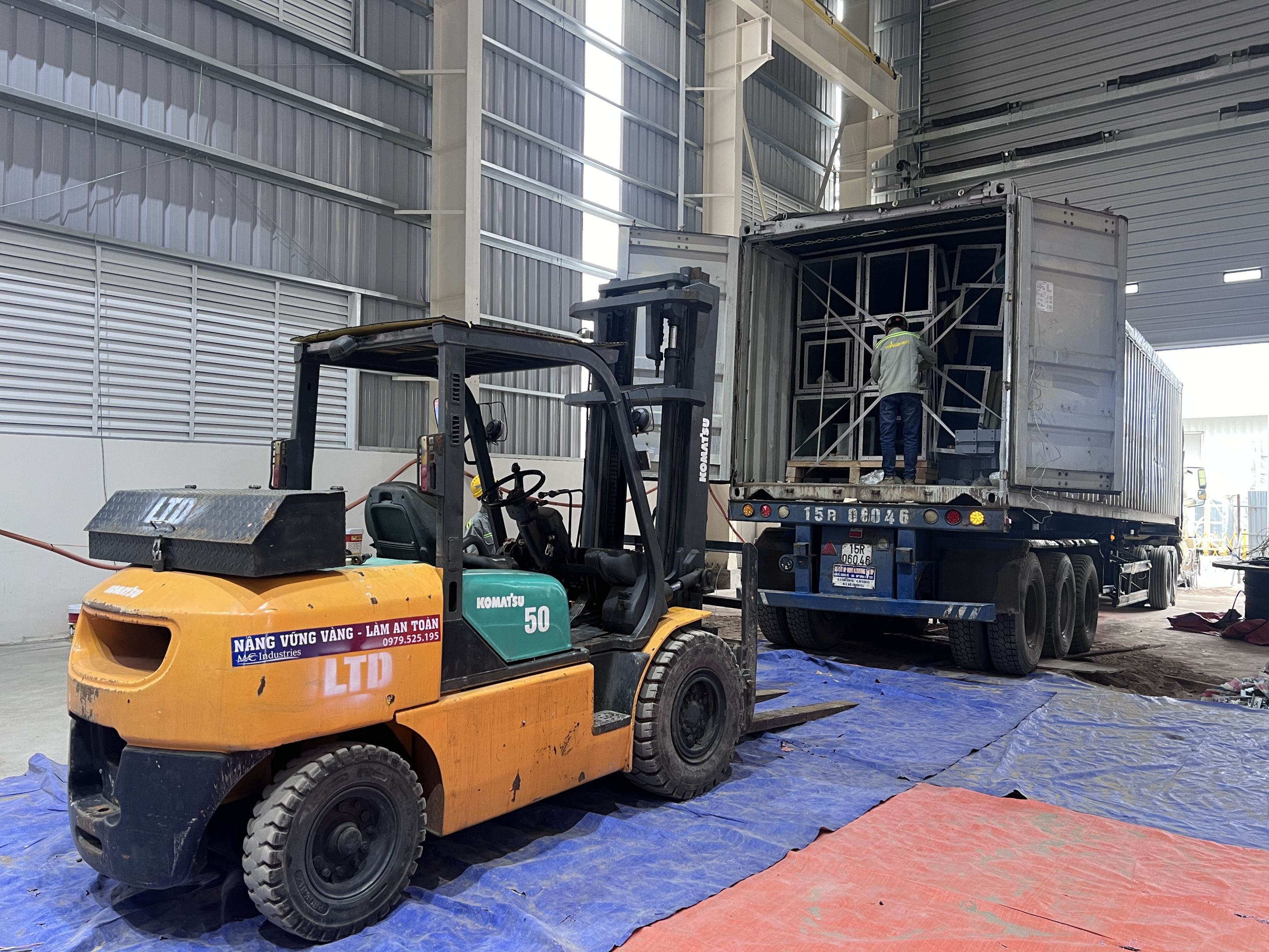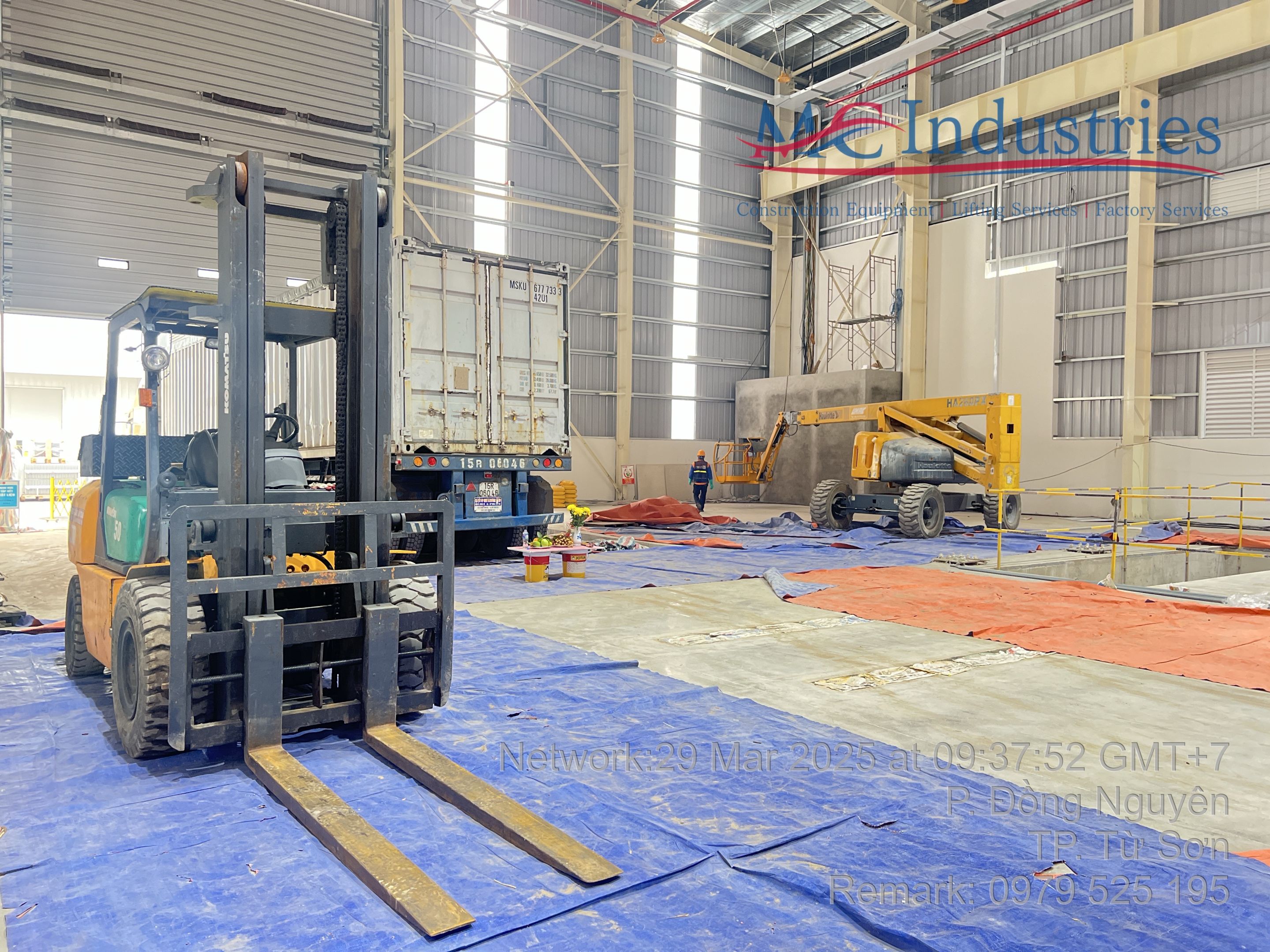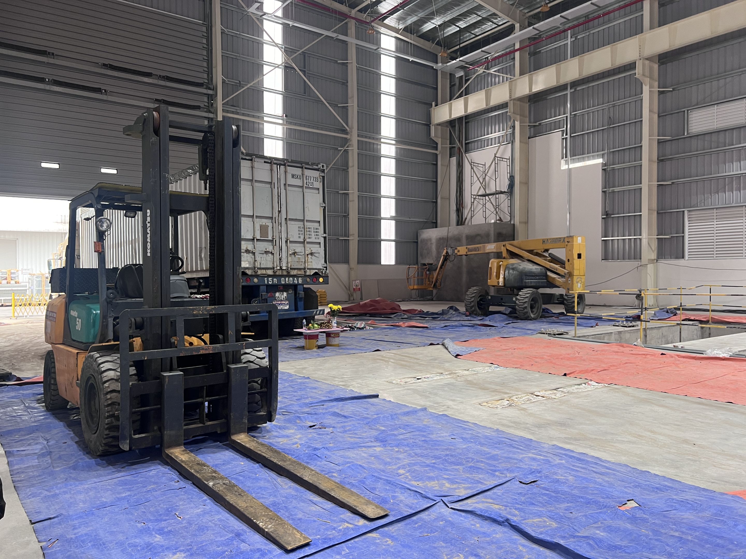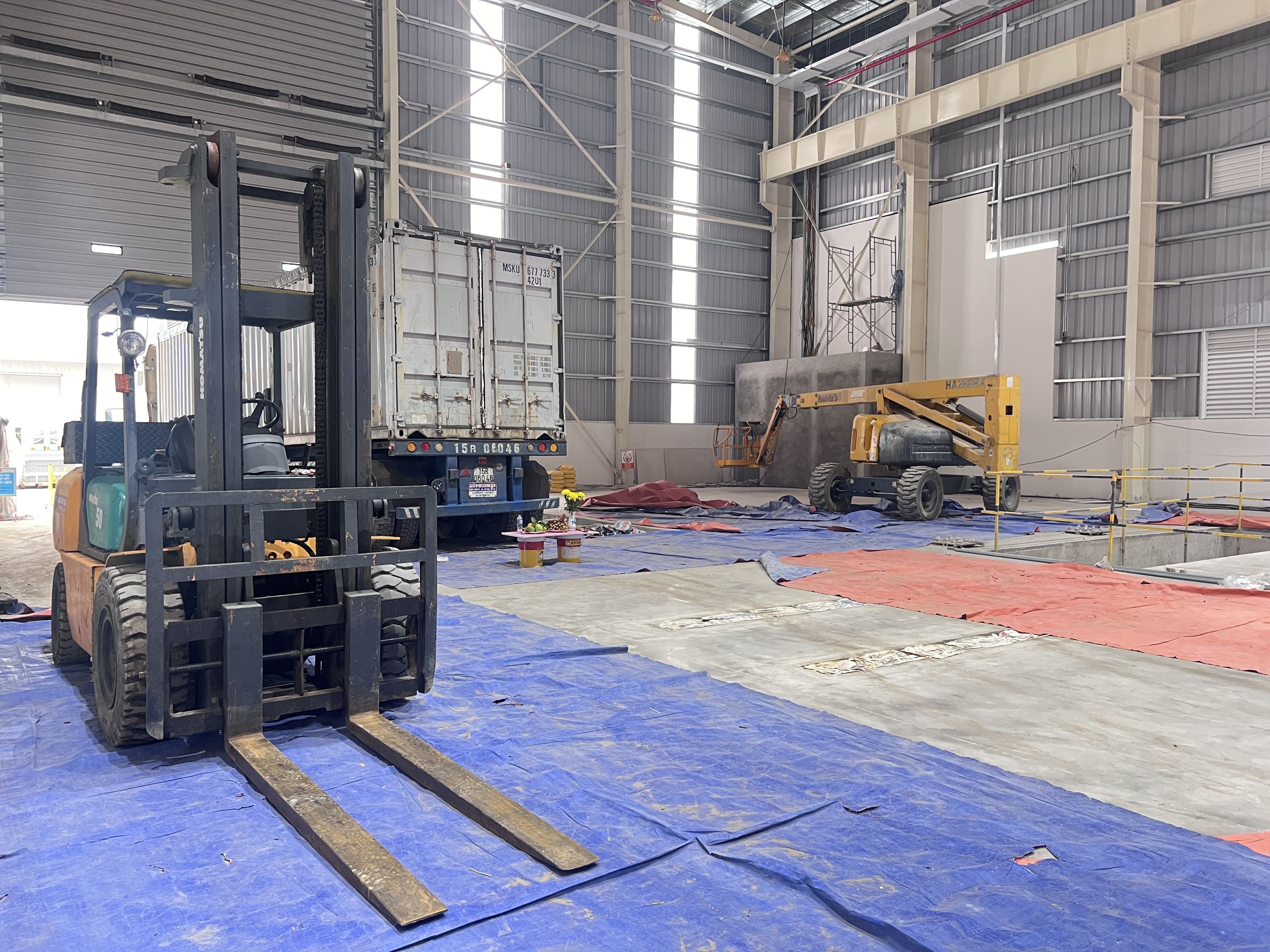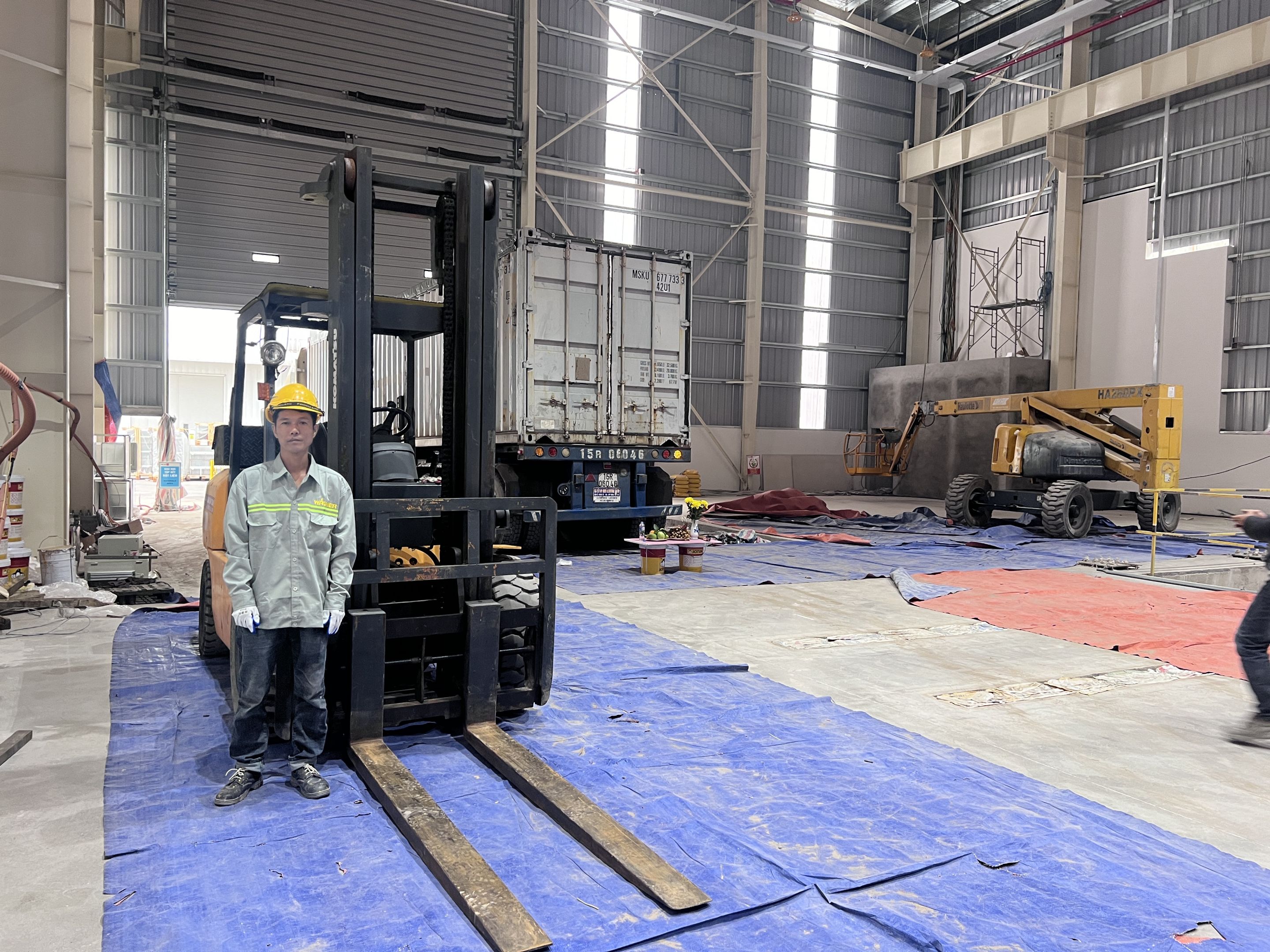Ngoài ra khách hàng thuê thêm xe nâng hàng 5 tấn để nâng hạ máy móc từ xe container xuống nhà máy và lắp đặt. Để không làm hỏng sàn nhà máy, toàn bộ bề mặt của sàn nhà được phù bạt đảm bảo quá trình làm việc không bị ảnh hưởng.