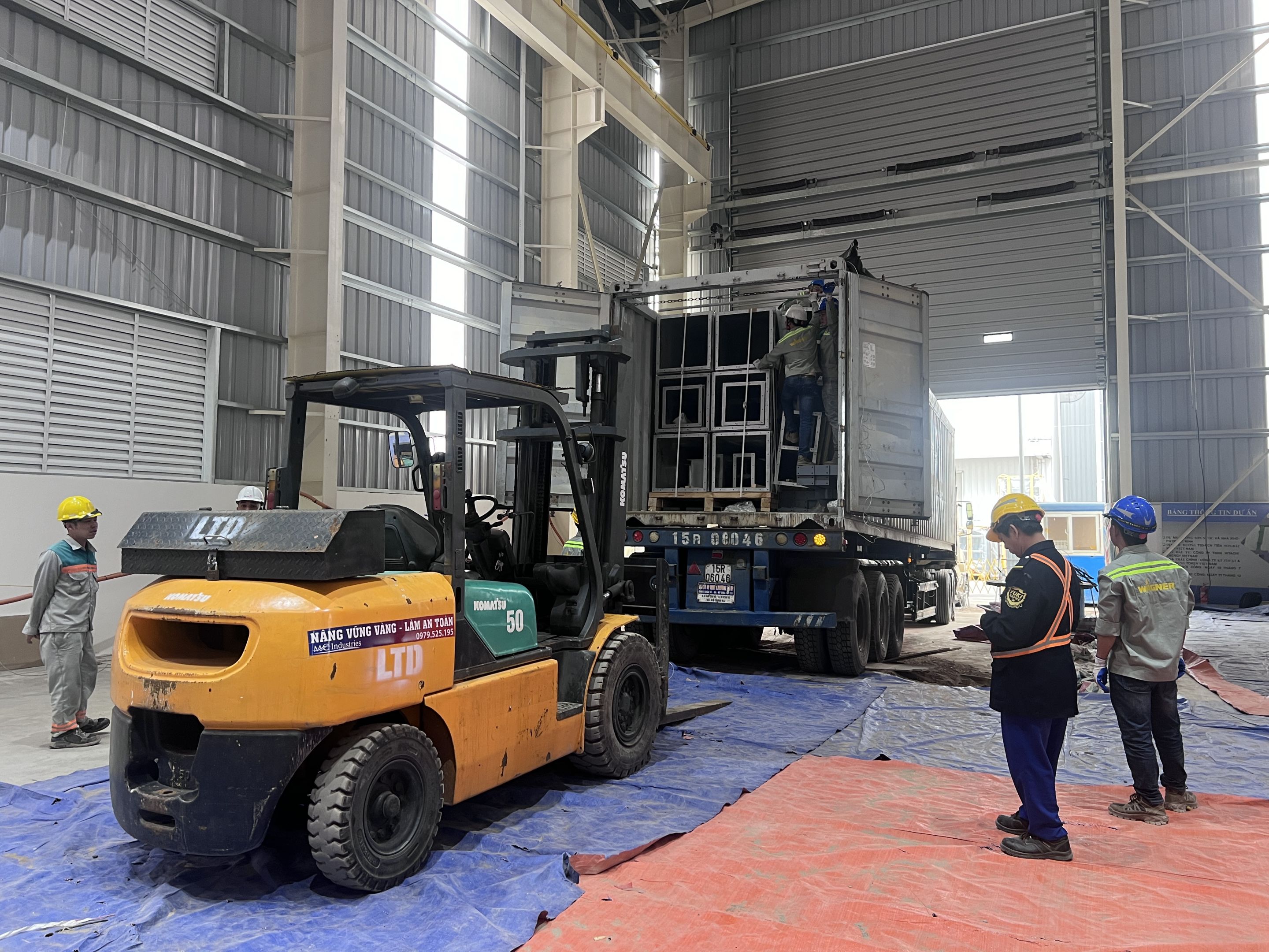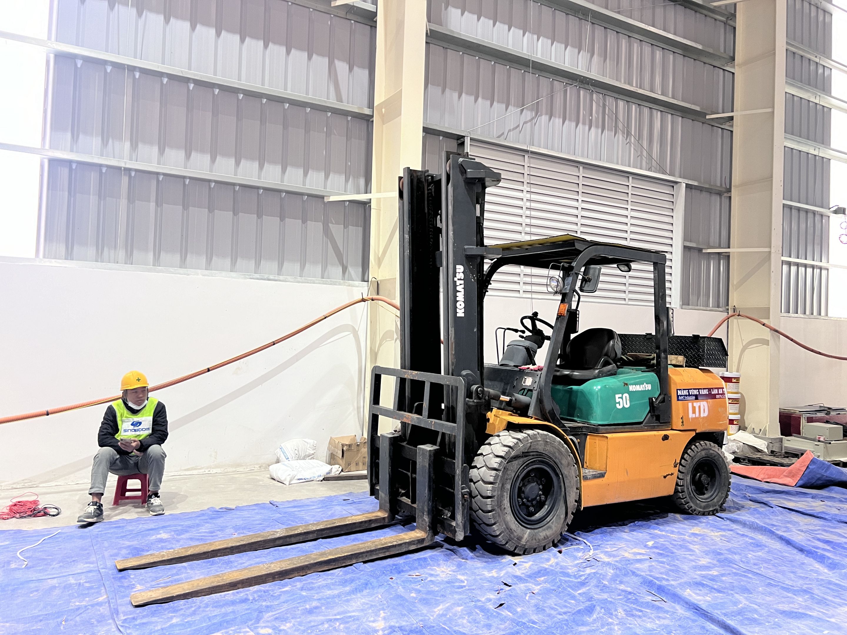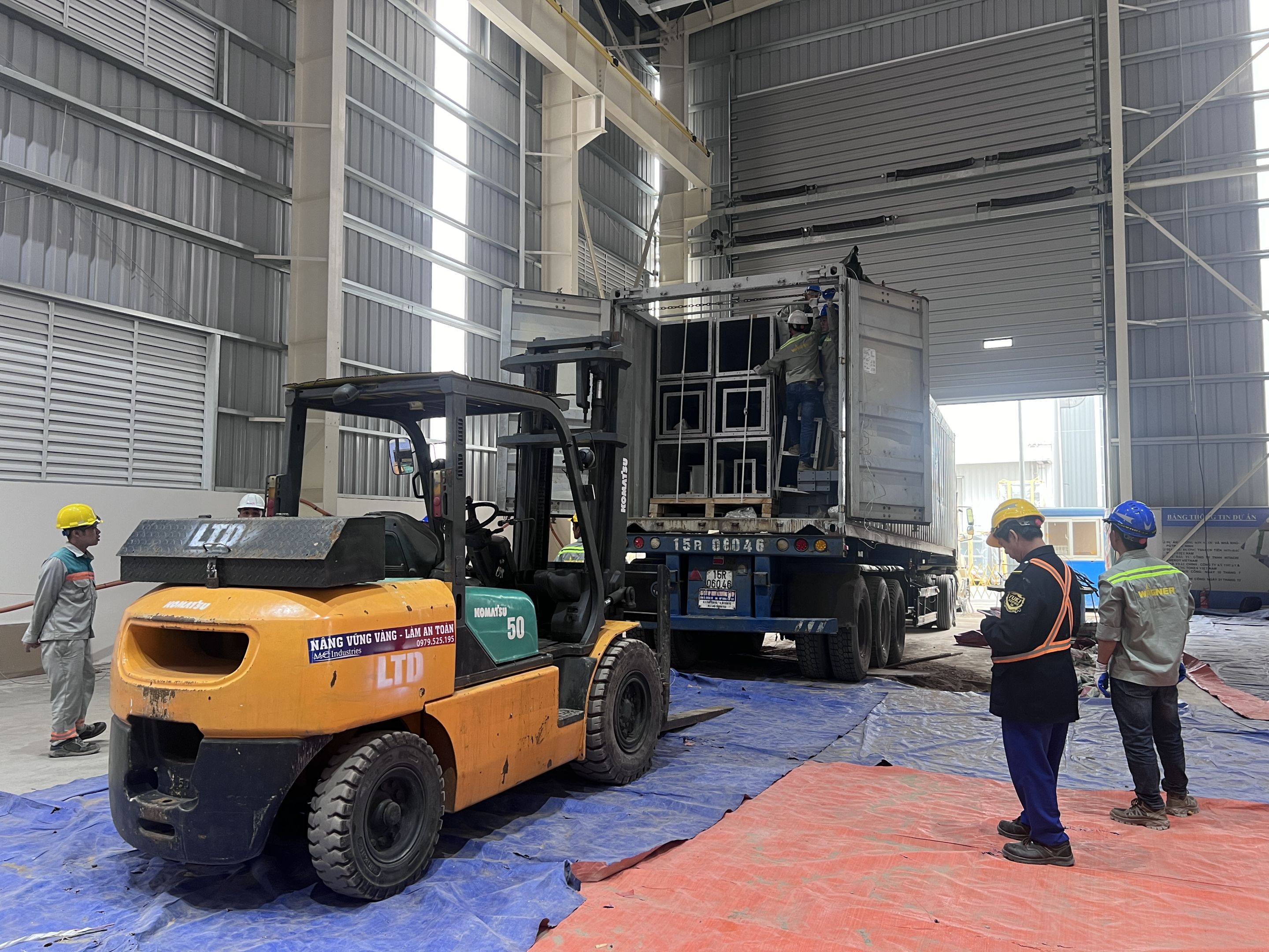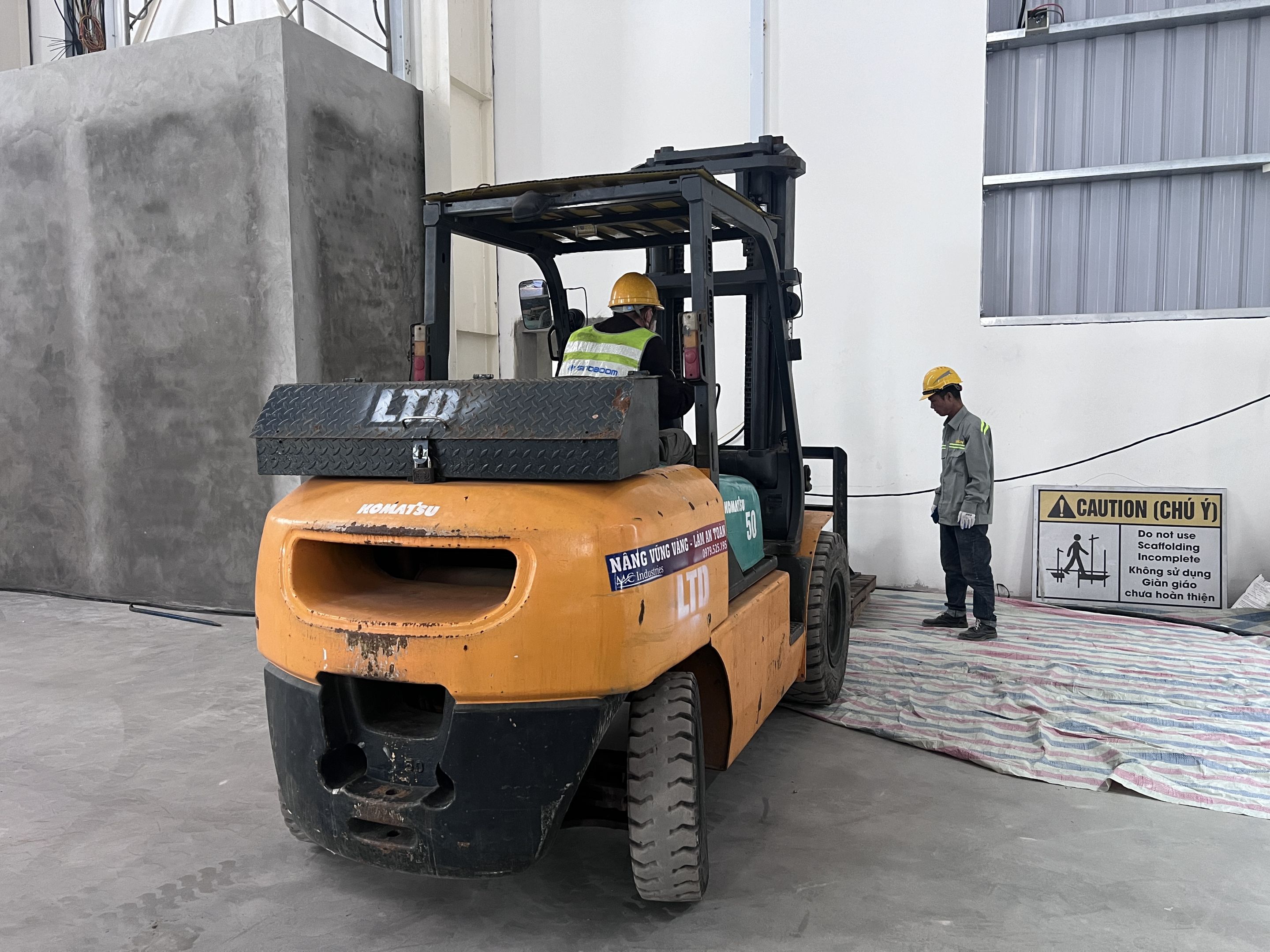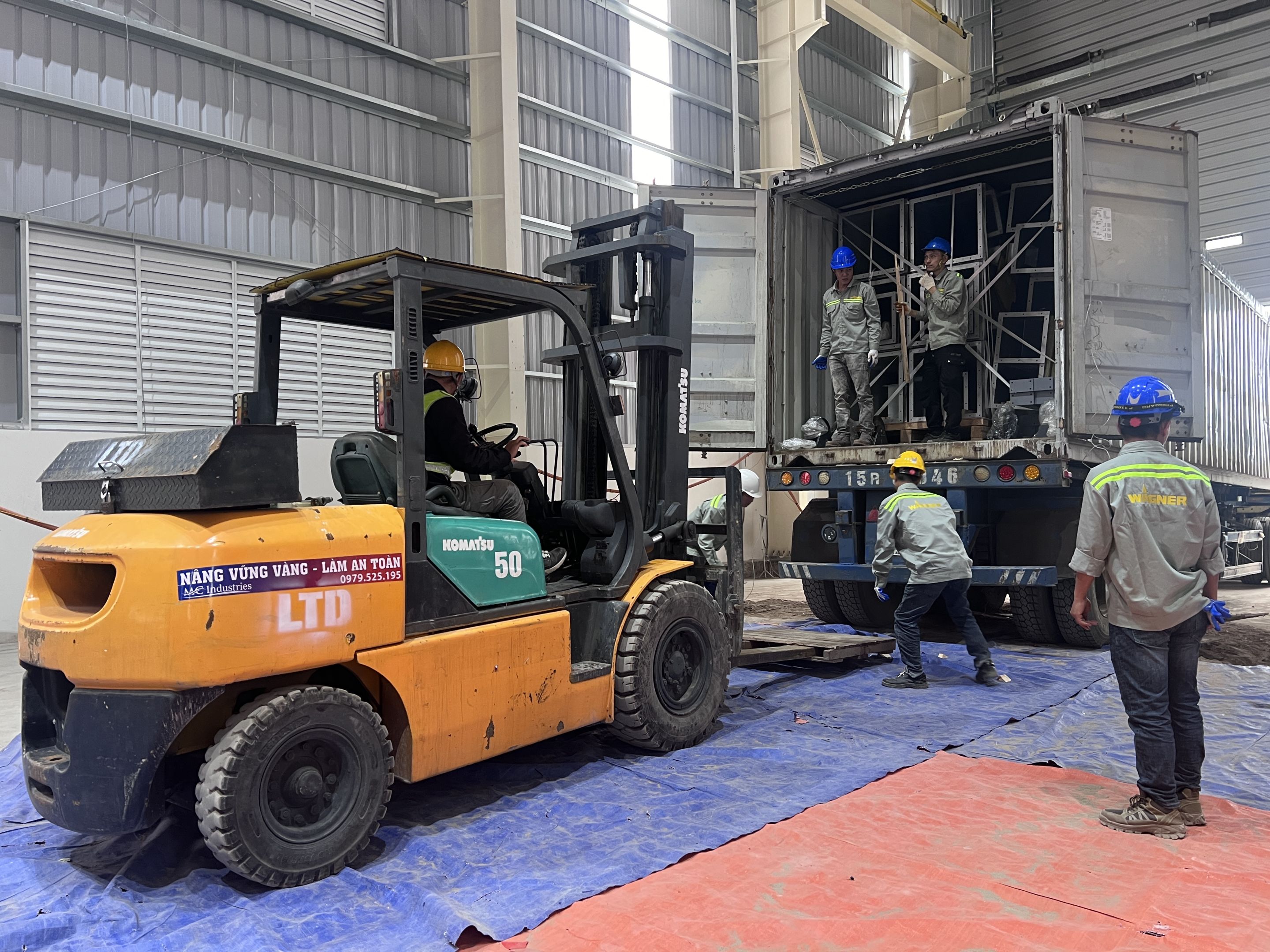 Ngoài ra khách hàng thuê thêm xe nâng hàng 5 tấn để nâng hạ máy móc từ xe container xuống nhà máy và lắp đặt. Để không làm hỏng sàn nhà máy, toàn bộ bề mặt của sàn nhà được phù bạt đảm bảo quá trình làm việc không bị ảnh hưởng.
