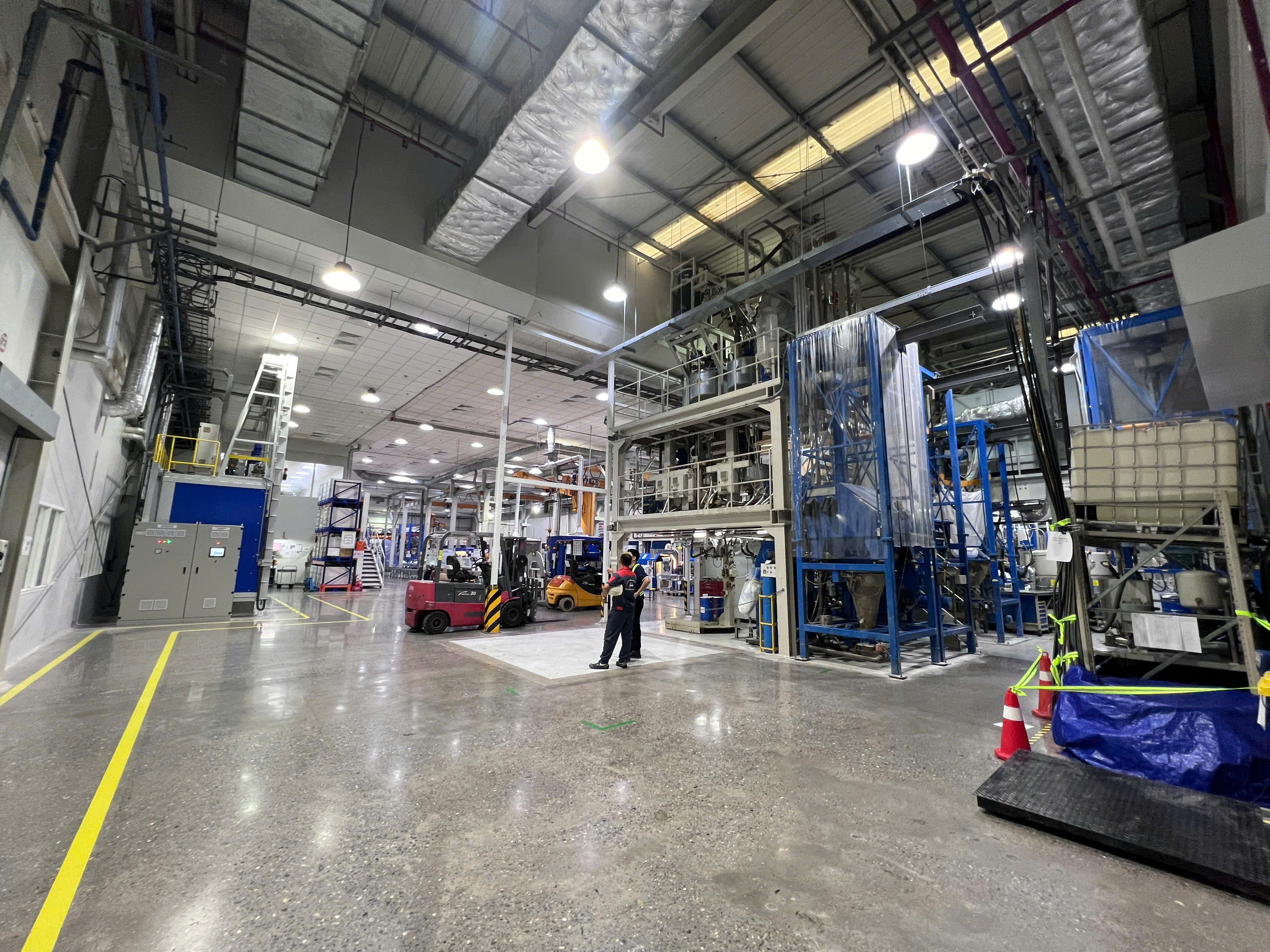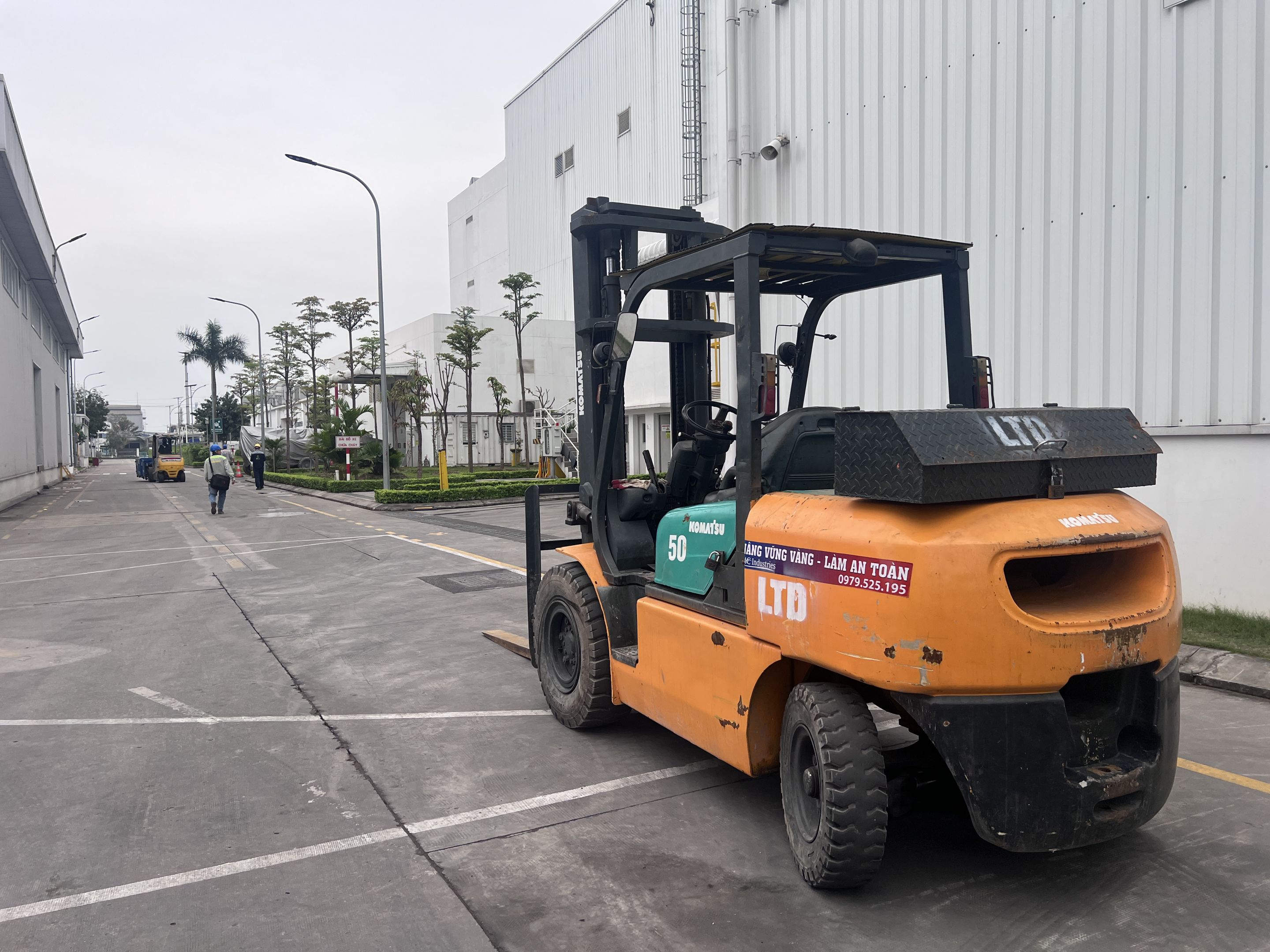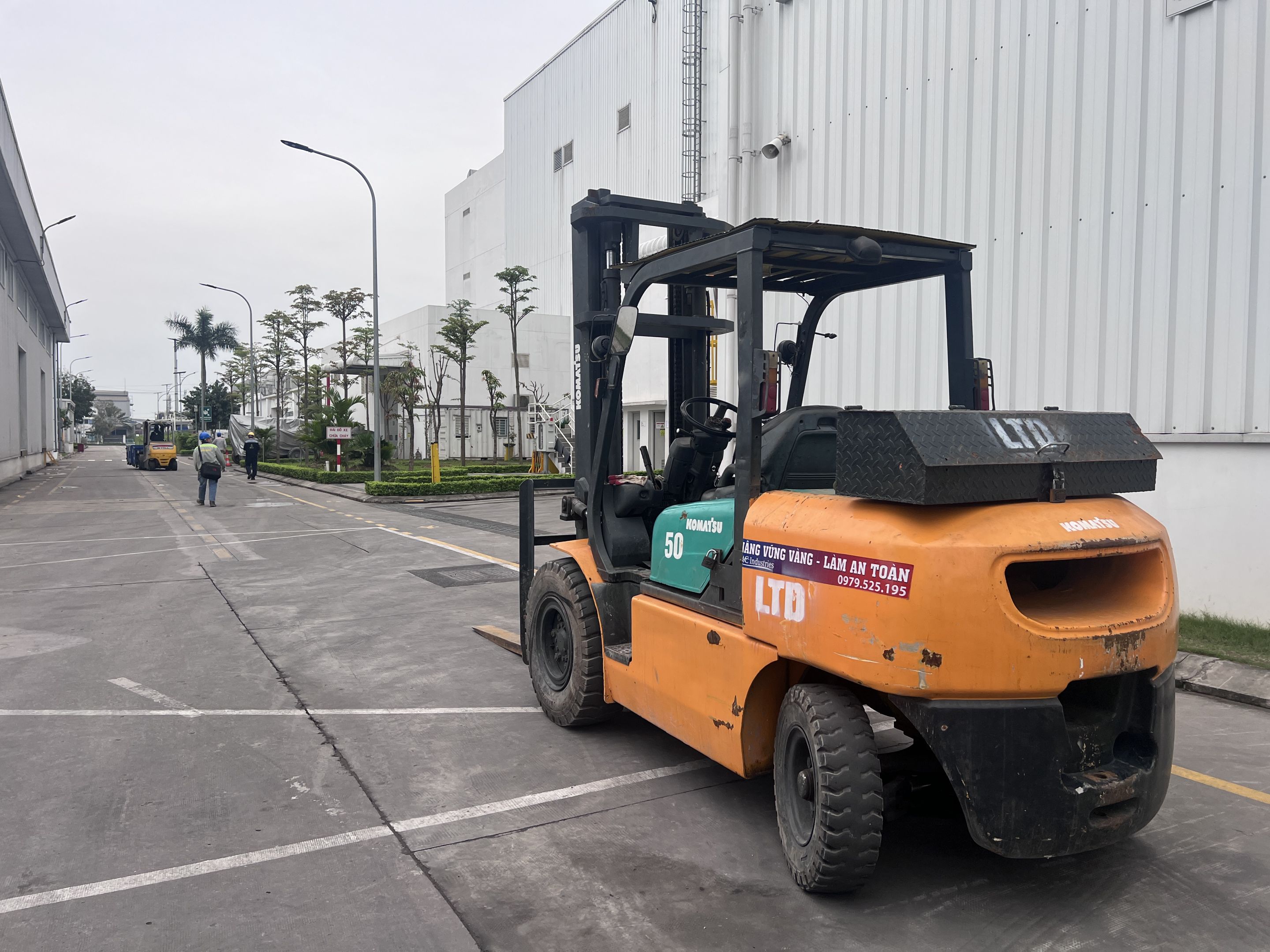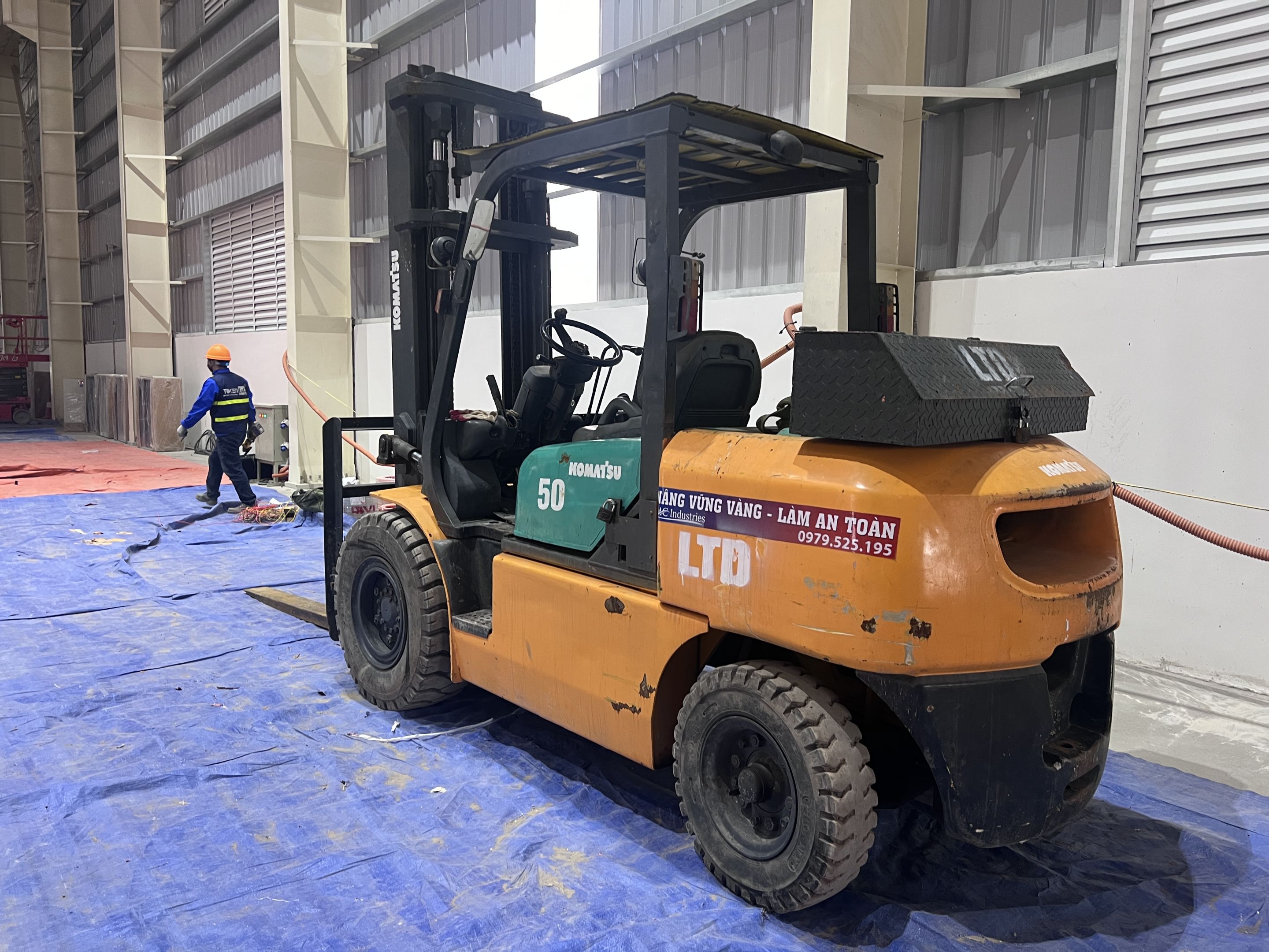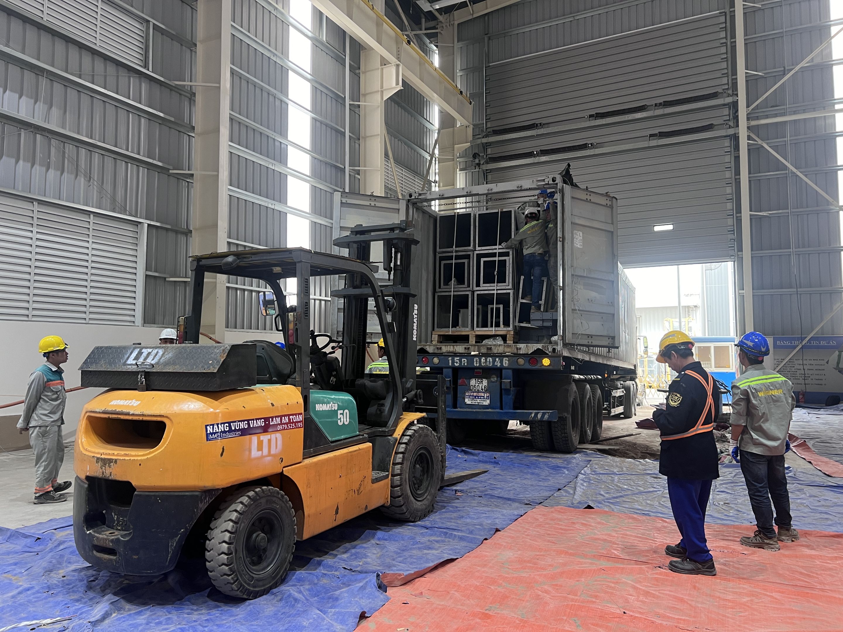 Ngoài ra khách hàng thuê thêm xe nâng hàng 5 tấn để nâng hạ máy móc từ xe container xuống nhà máy và lắp đặt. Để không làm hỏng sàn nhà máy, toàn bộ bề mặt của sàn nhà được phù bạt đảm bảo quá trình làm việc không bị ảnh hưởng.