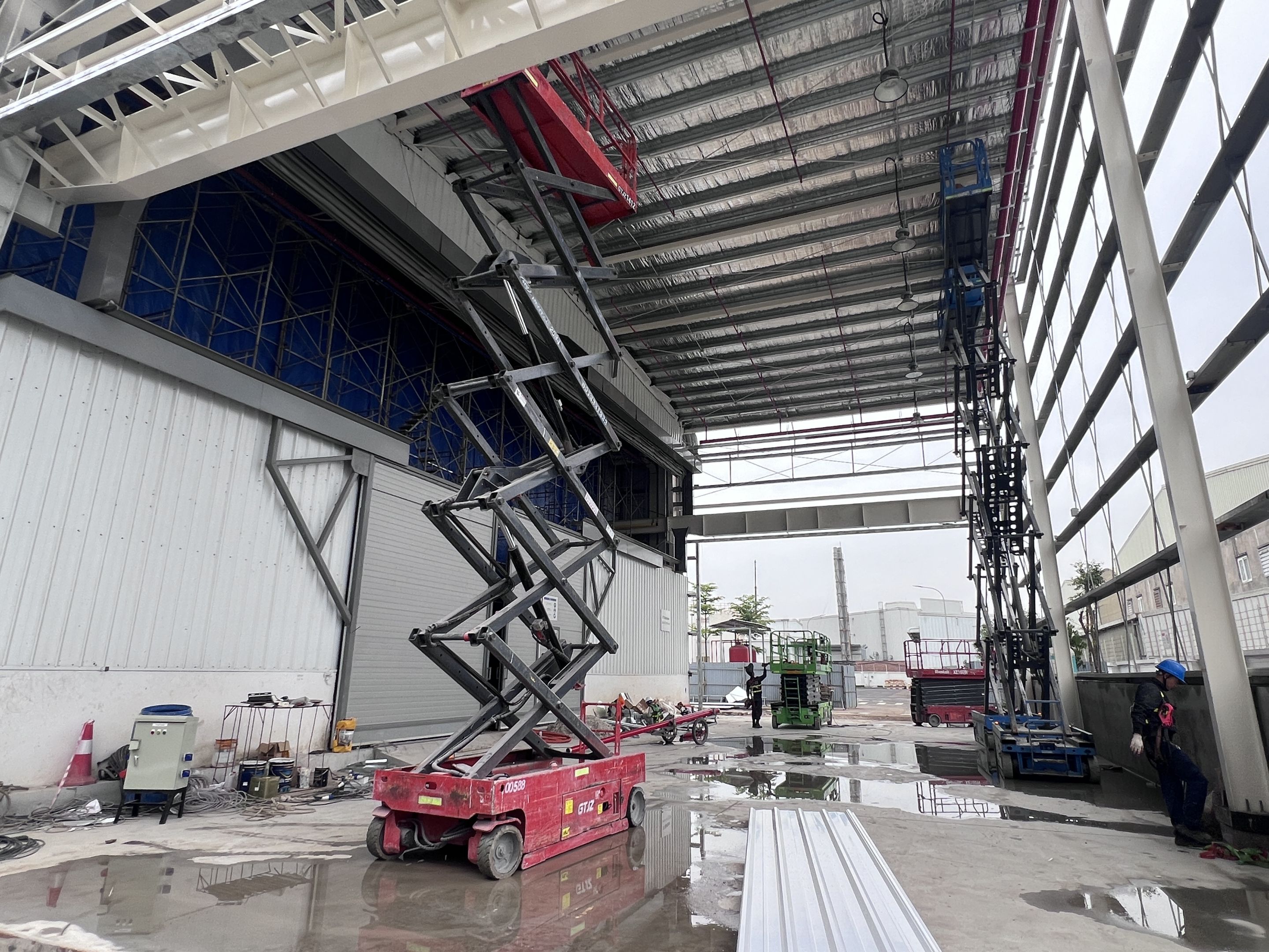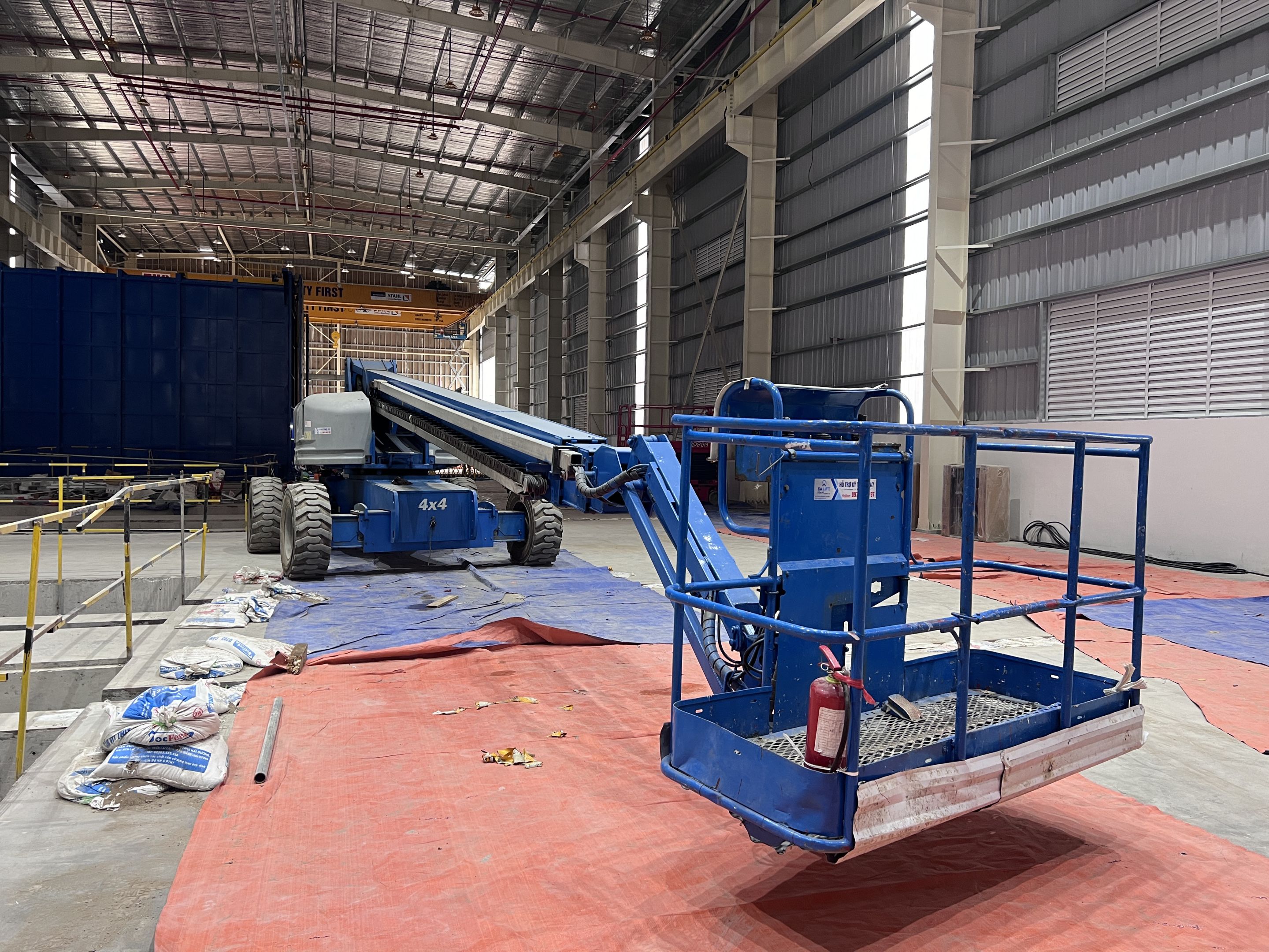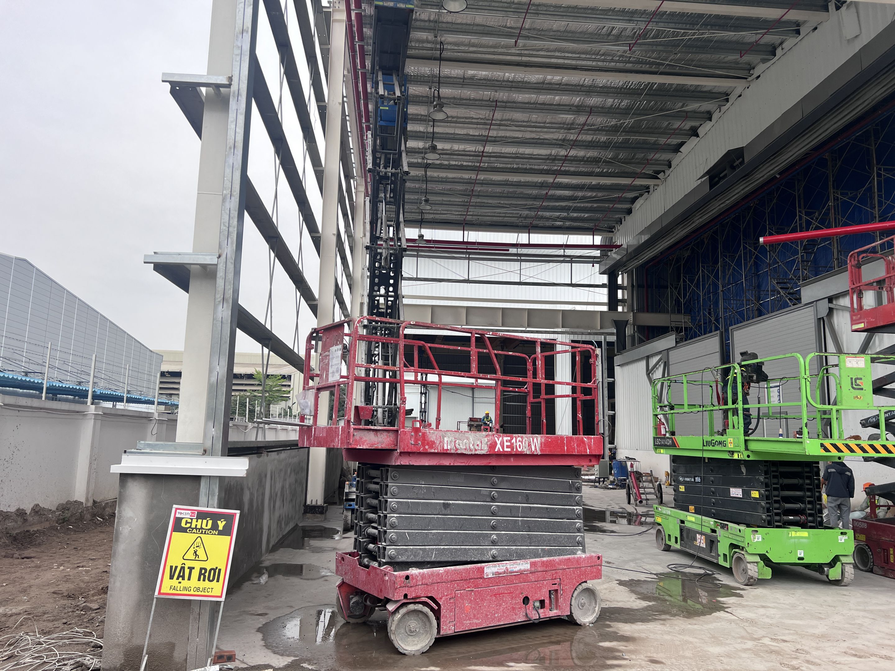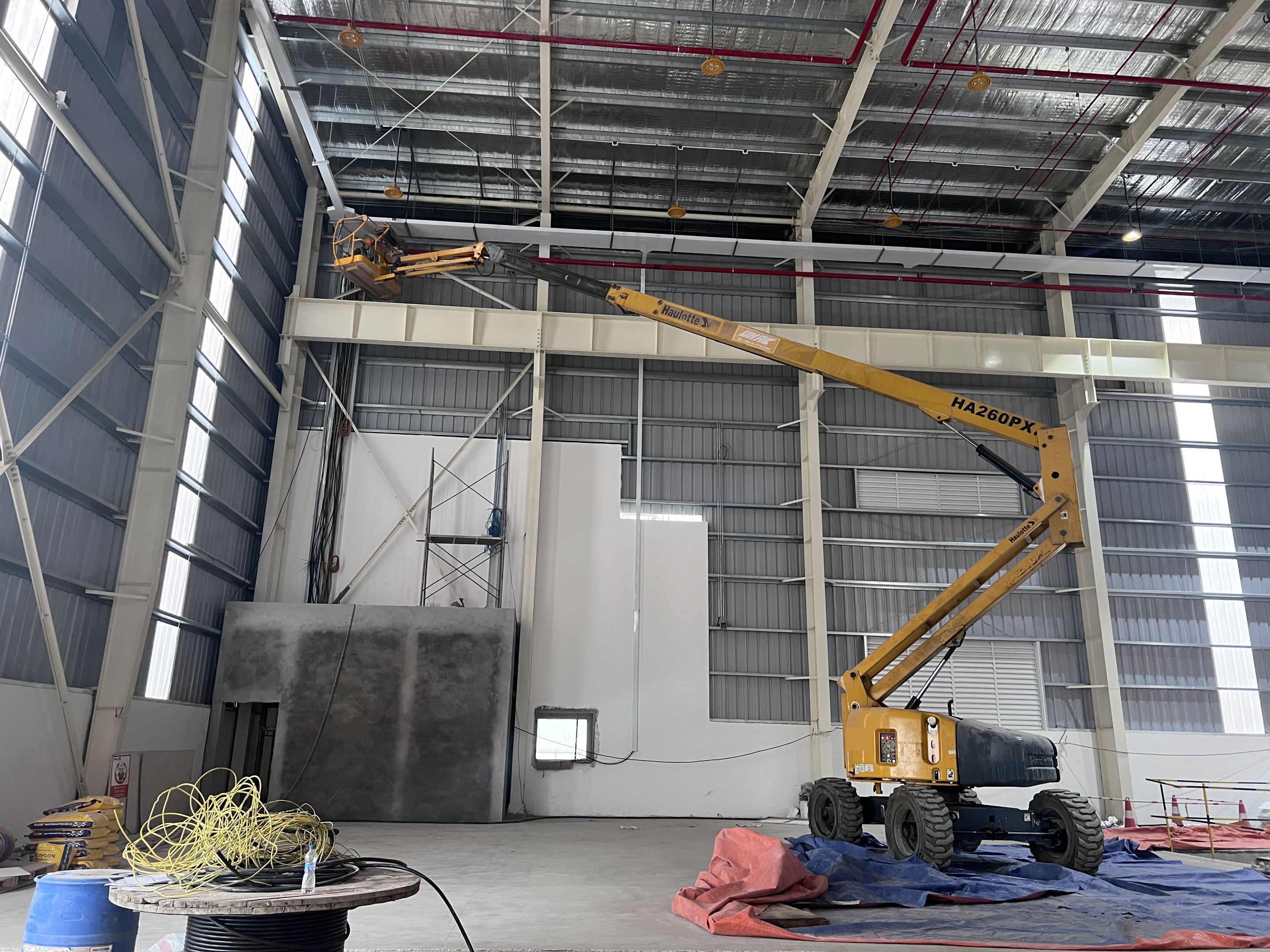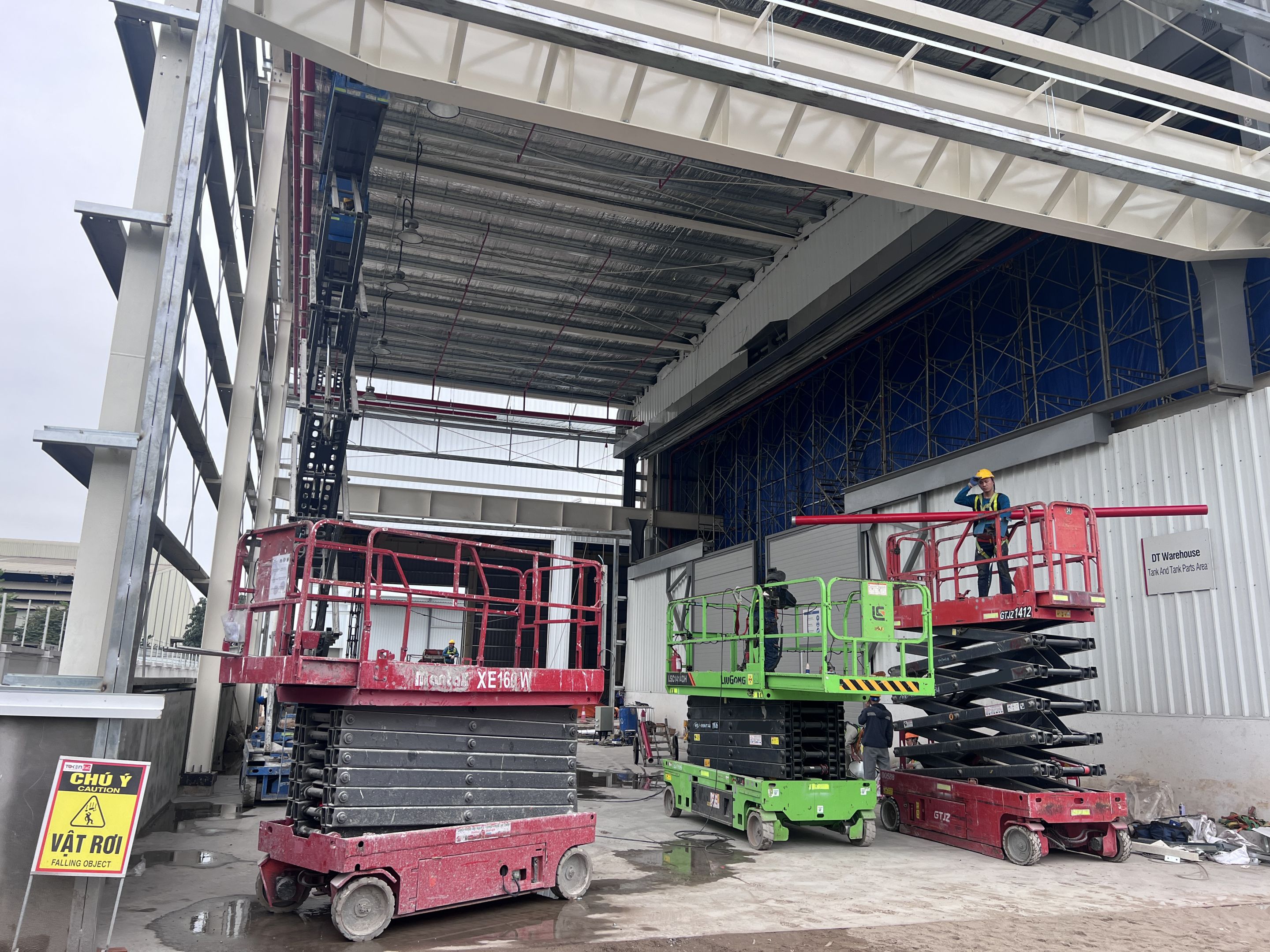 Khách hàng thuê 1 xe nâng người 28m boom lift Genie , xe nâng người 14m, xe nâng người 16m, xe nâng người 12m cắt kéo phục vụ quá trình lắp đặt kết cấu, PCCC, Hệ thống cơ điện nhẹ cho nhà máy.