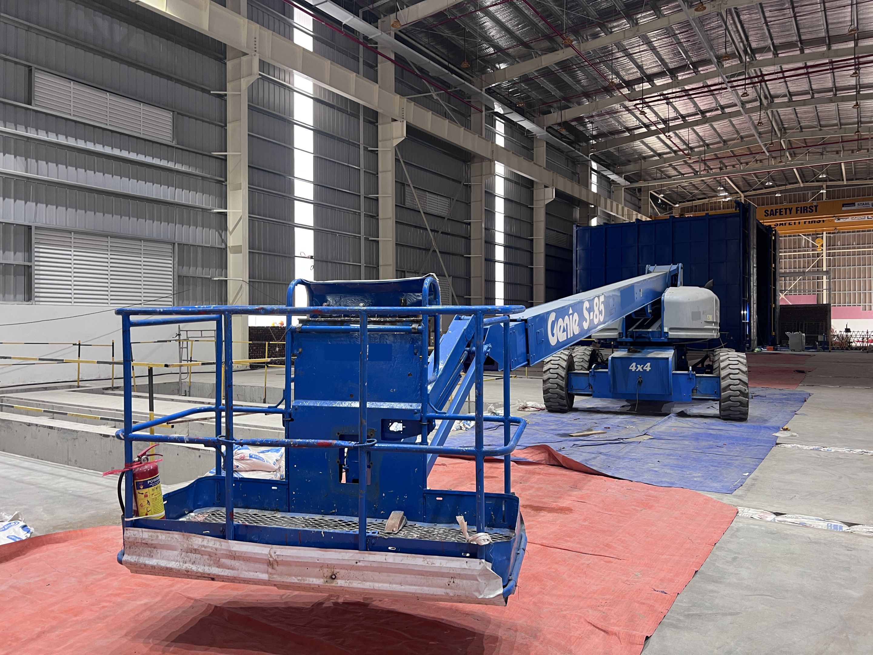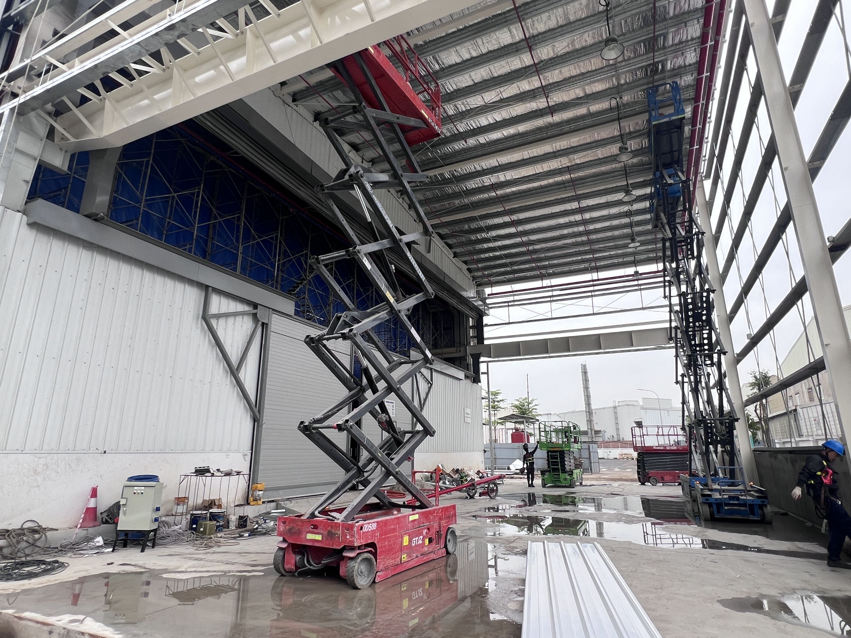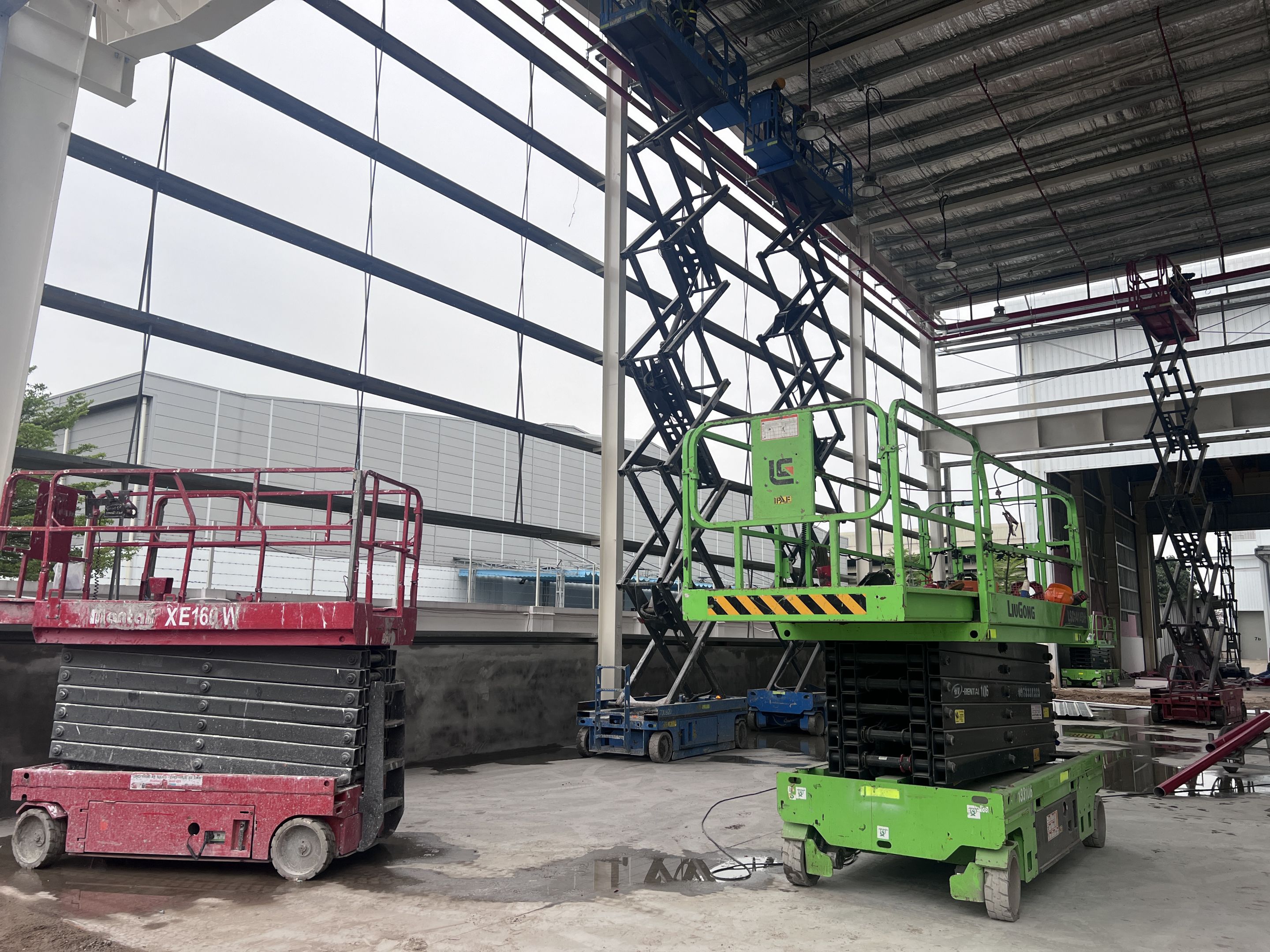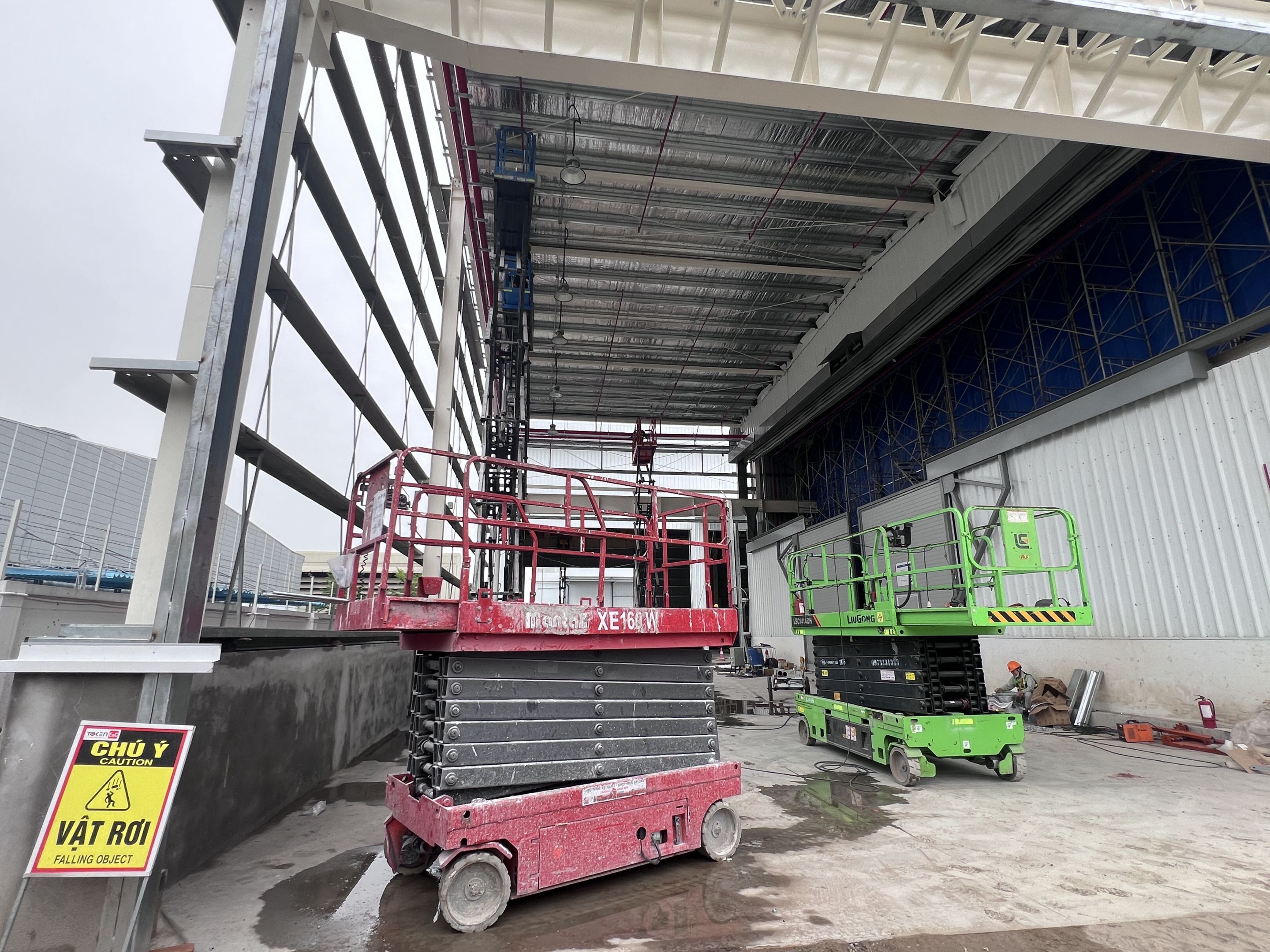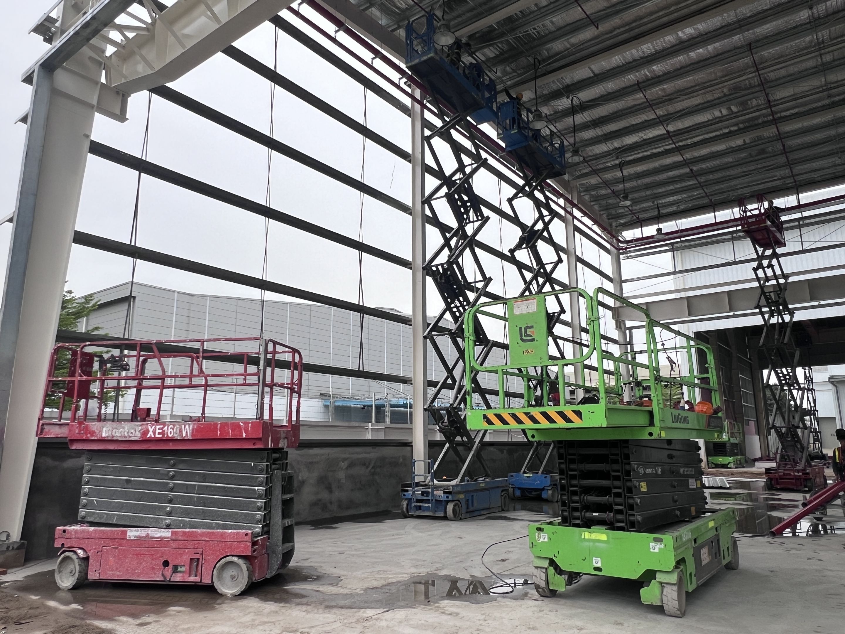 Khách hàng thuê 1 xe nâng người 28m boom lift Genie , xe nâng người 14m, xe nâng người 16m, xe nâng người 12m cắt kéo phục vụ quá trình lắp đặt kết cấu, PCCC, Hệ thống cơ điện nhẹ cho nhà máy.