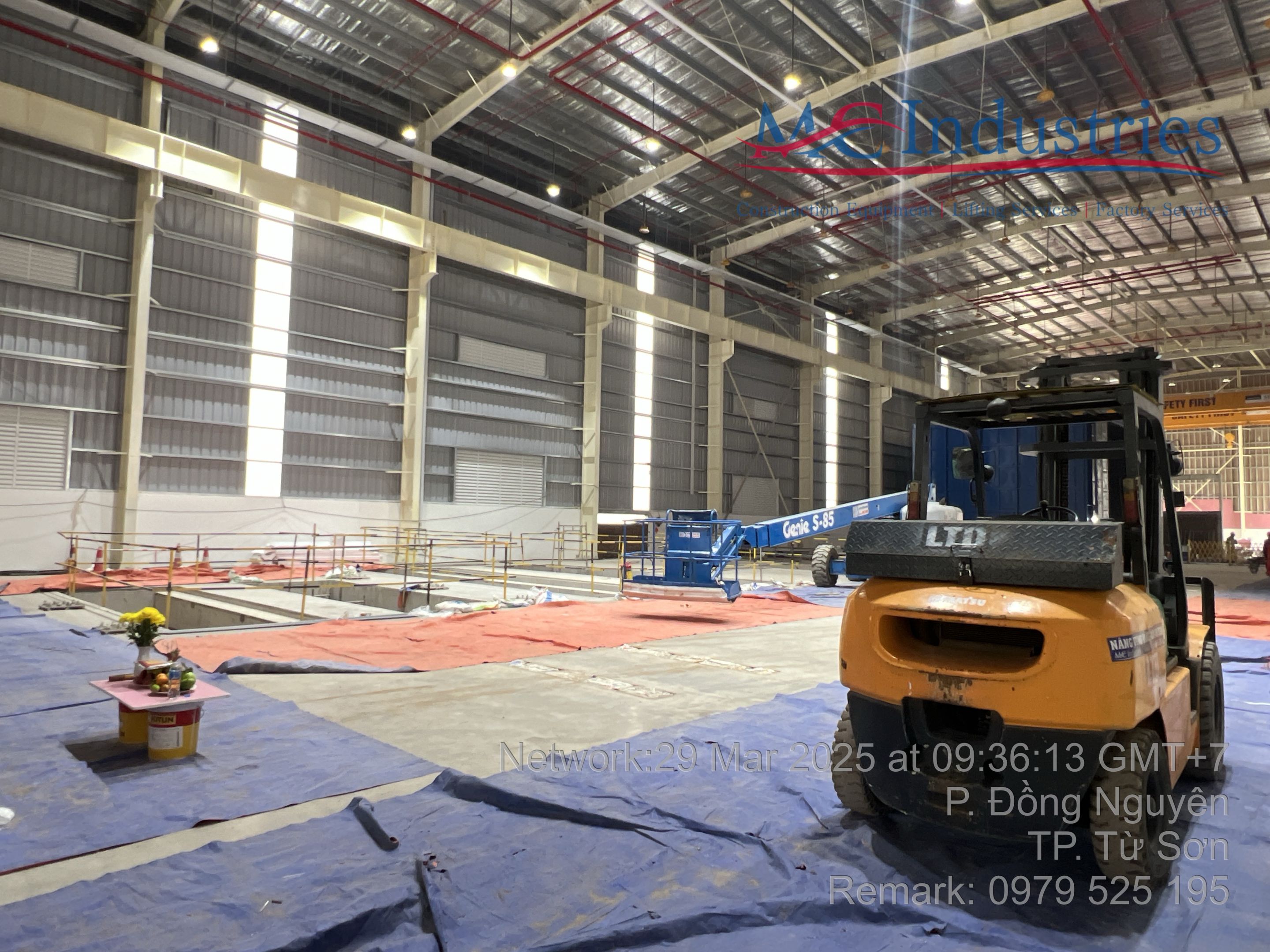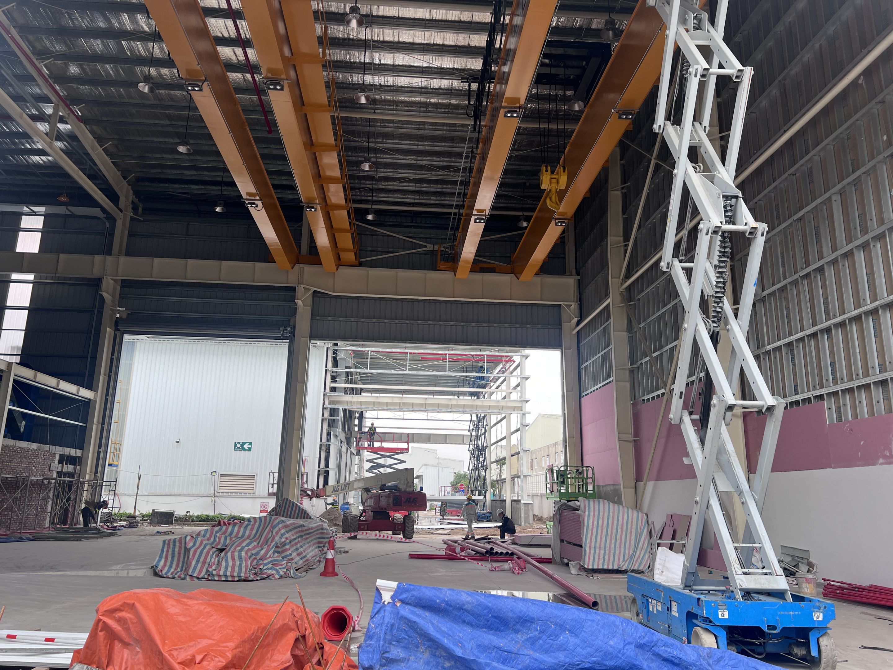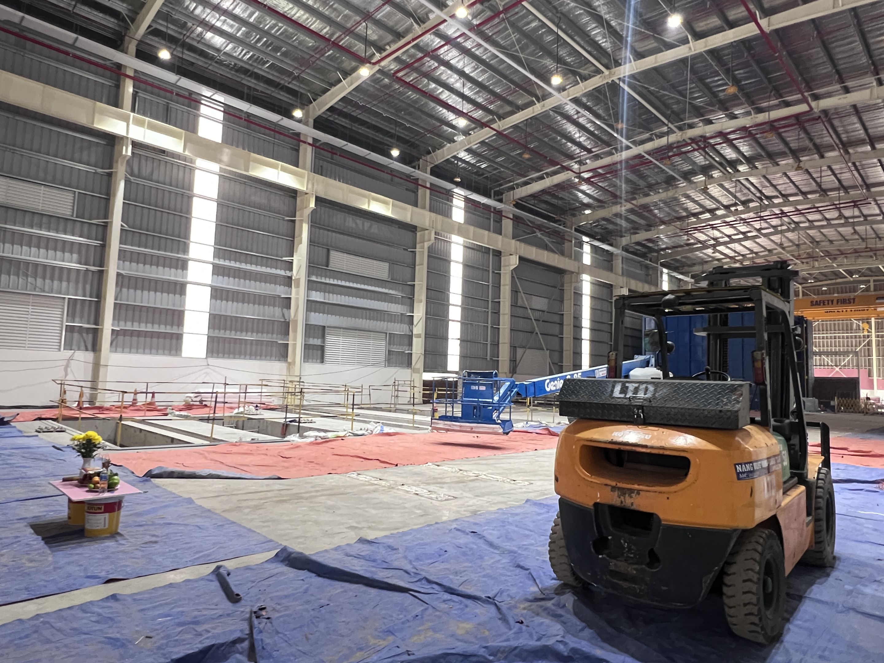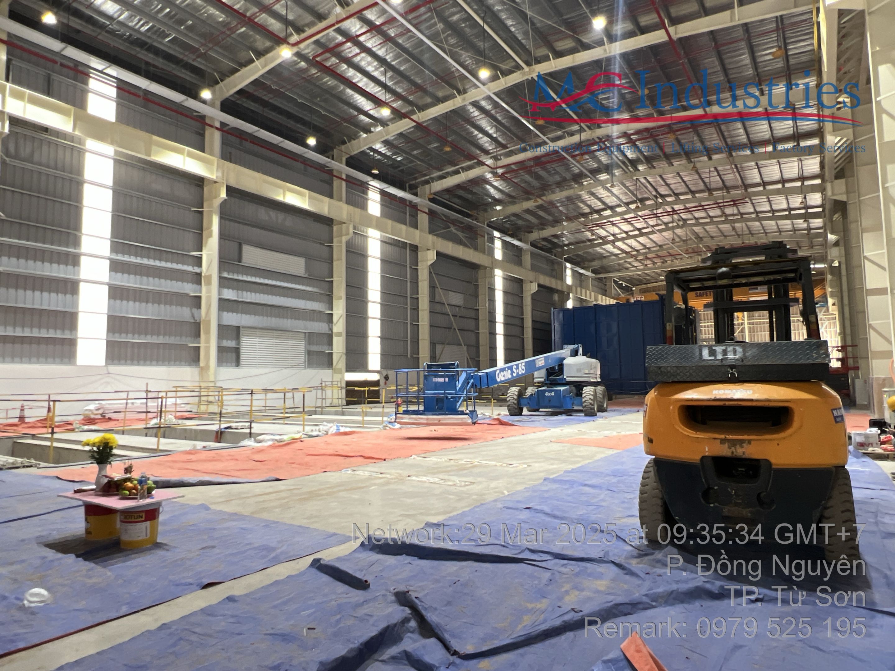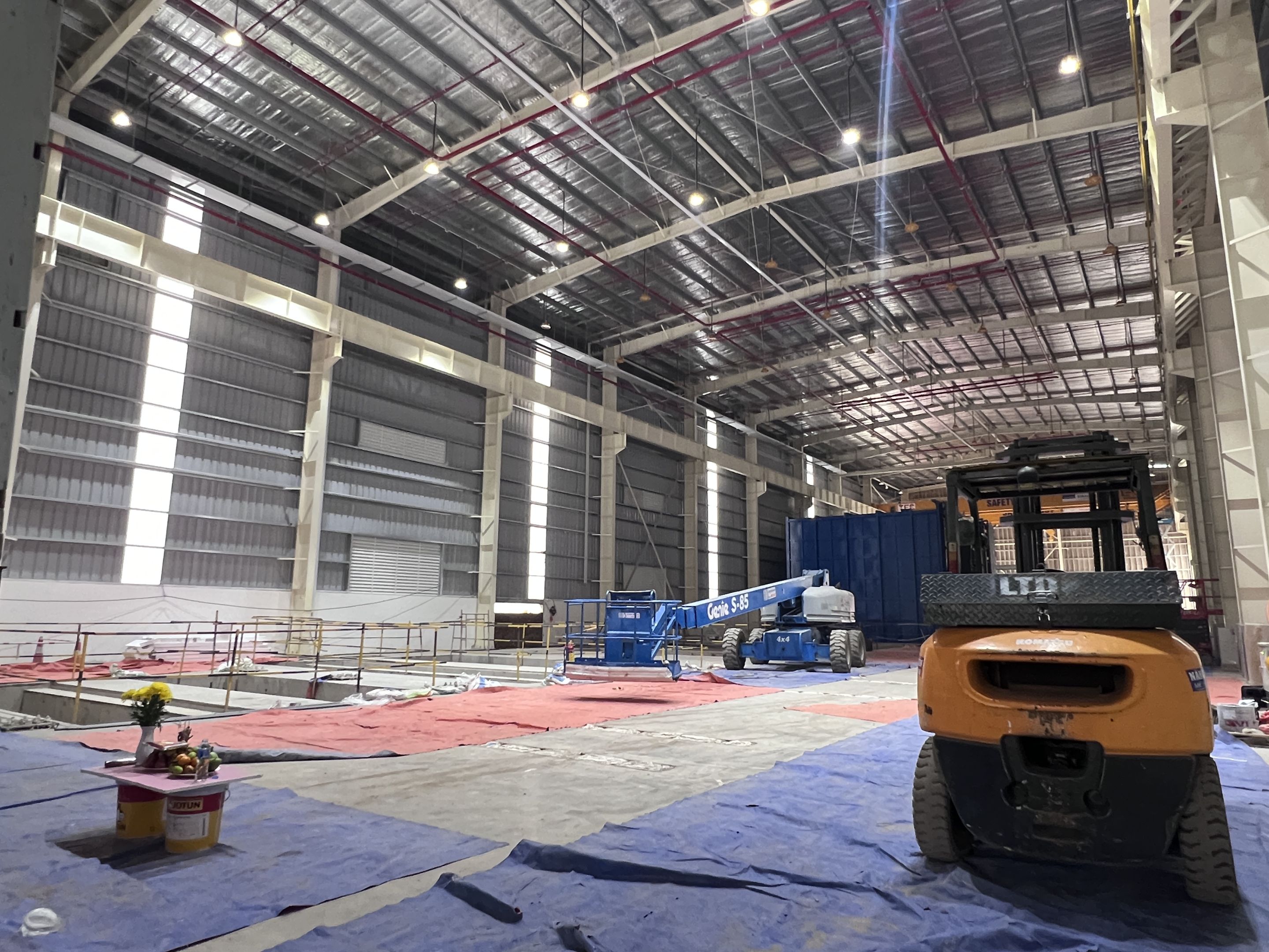 Khách hàng thuê 1 xe nâng người 28m boom lift Genie , xe nâng người 14m, xe nâng người 16m, xe nâng người 12m cắt kéo phục vụ quá trình lắp đặt kết cấu, PCCC, Hệ thống cơ điện nhẹ cho nhà máy.