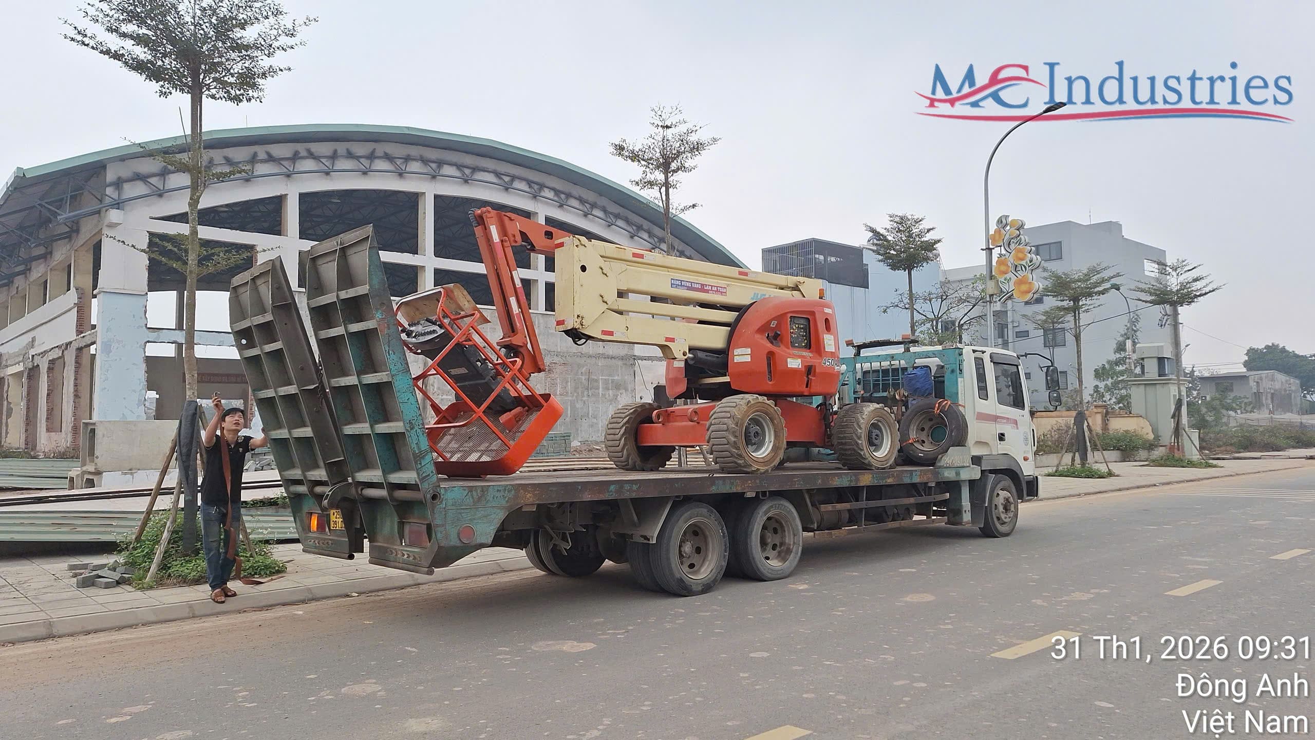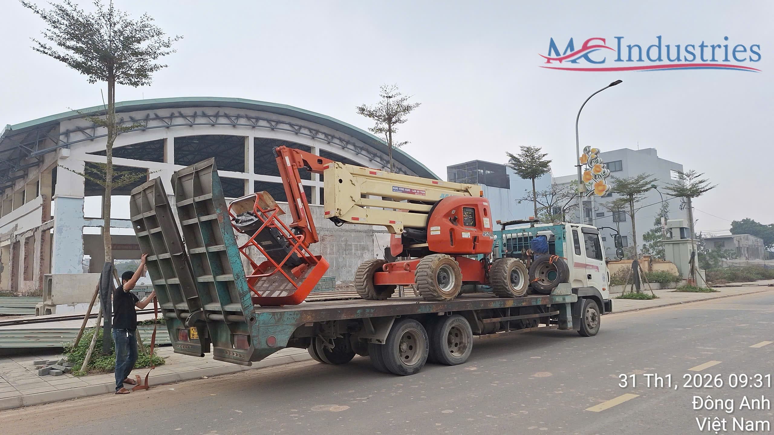 Ngày 26/1/2026 MC Industries cho thuê xe nâng người boom lift 16m phục vụ lắp đặt mái tôn cho nhà thi đấu Mai Lâm, Hà Nội.