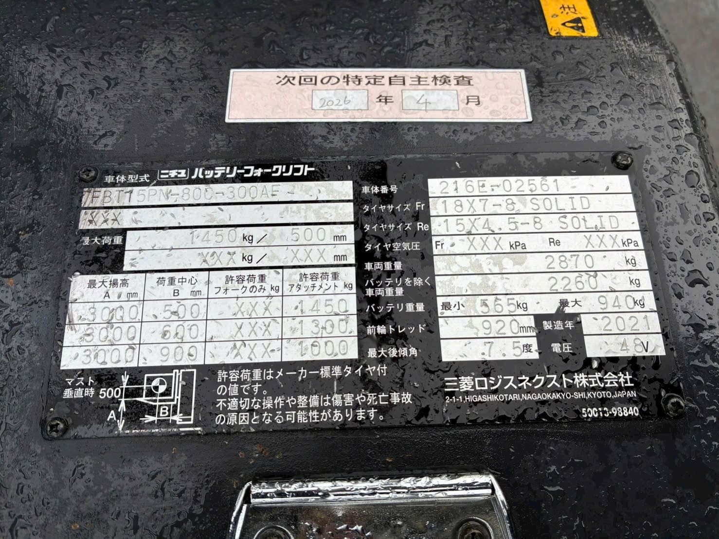 Thông số kỹ thuật xe nâng hàng điện 3 bánh 1.5 tấn Nichiyu FBT15PN