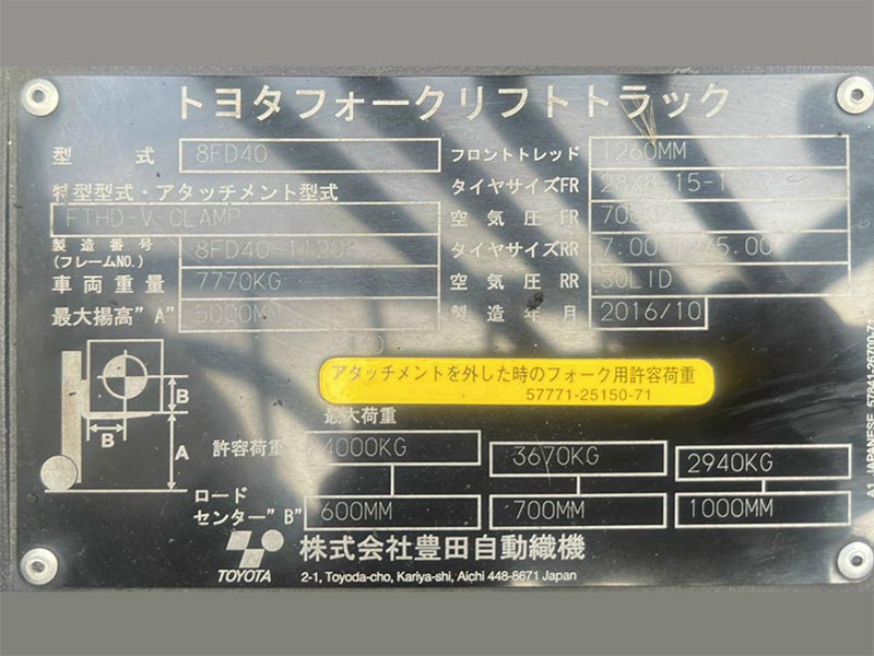 Thông số kỹ thuật xe nâng hàng 4 tấn dầuToyota 8FD40N Specs