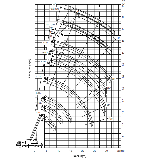 • Chiều cao nâng tối đa cần Jib: 59.5 m (Main boom 43.5m, 4.6t counterweight, fully extended main boom (m) + 16 m jib (m))